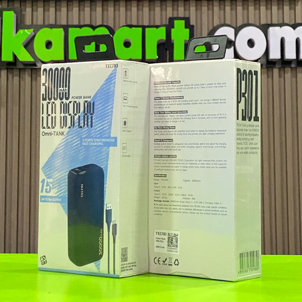 • The Tecno Power Bank LED Display 30000mAh offers fast charging, dual USB output, and an LED display for battery status—perfect for keeping your devices powered anytime, anywhere with reliable performance.