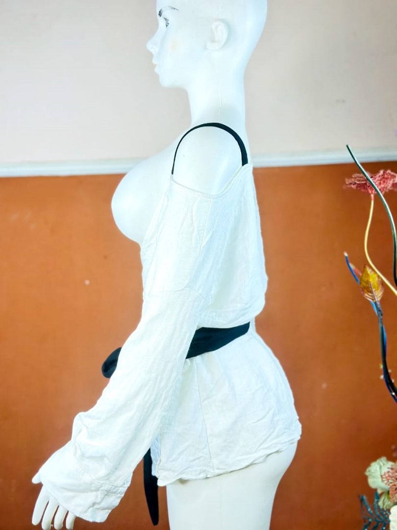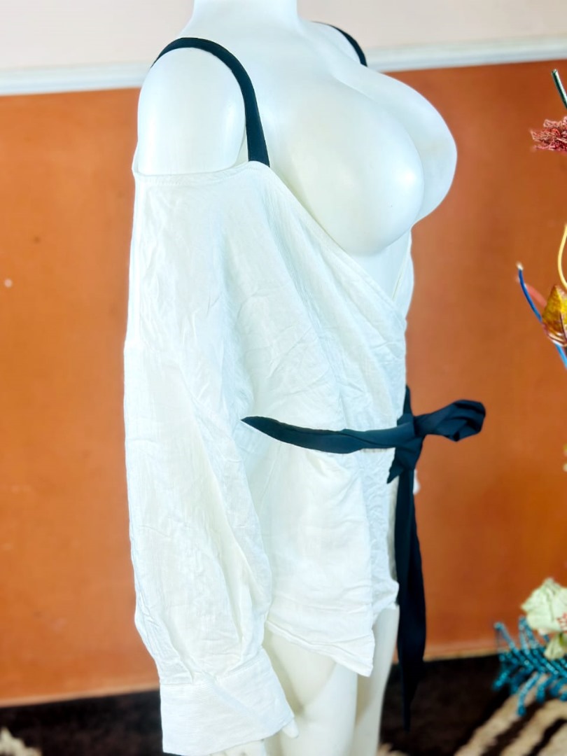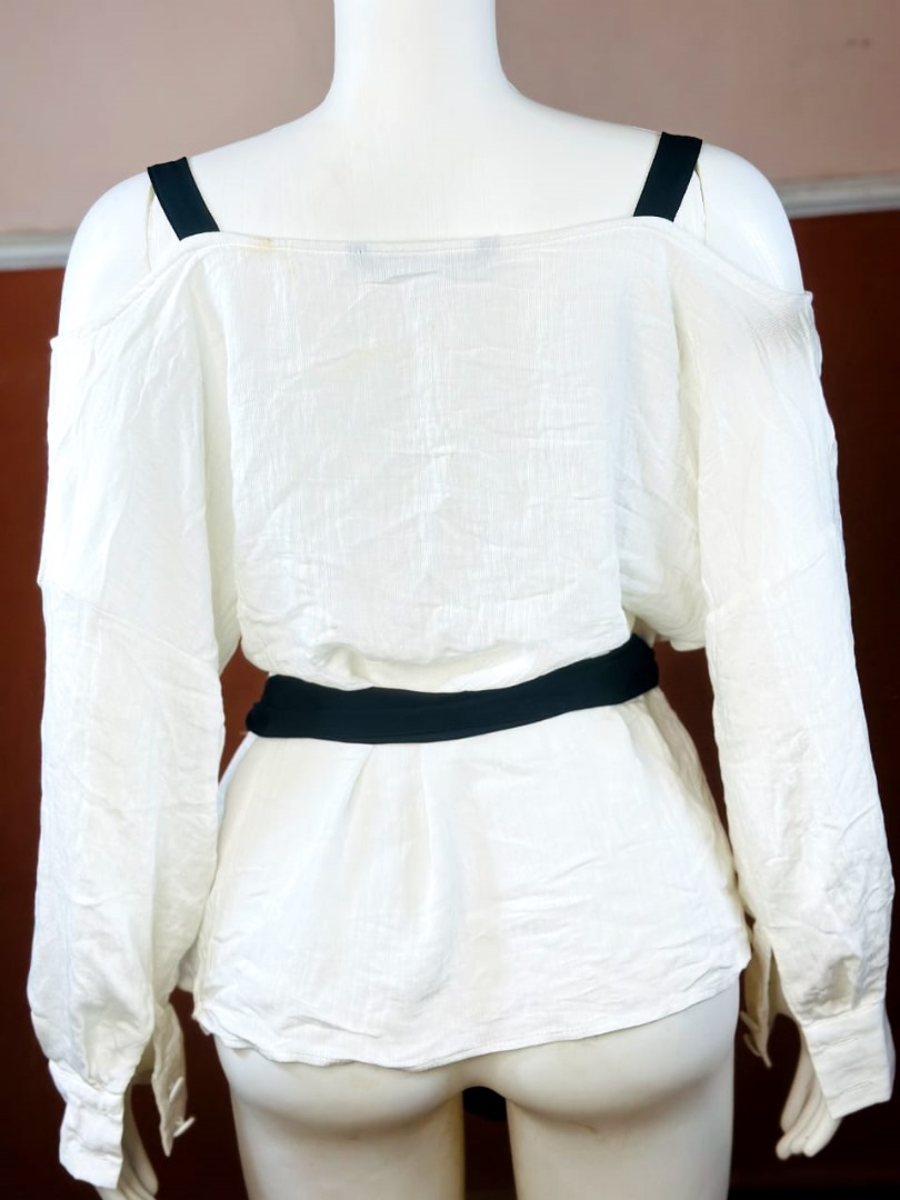 The White Zara Wrap Blouse with Black Tie Belt is designed to deliver a refined and feminine silhouette. The wrap-style design flatters the body while allowing adjustable comfort, and the contrasting black tie belt adds a chic, modern touch.