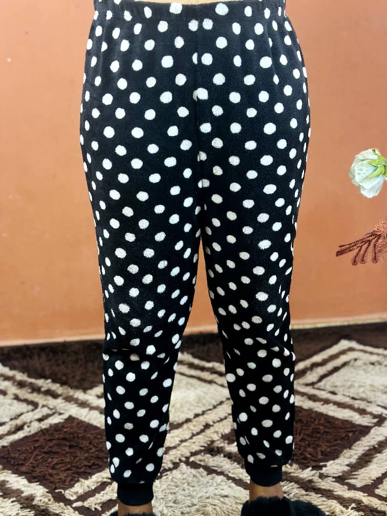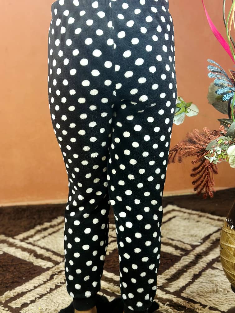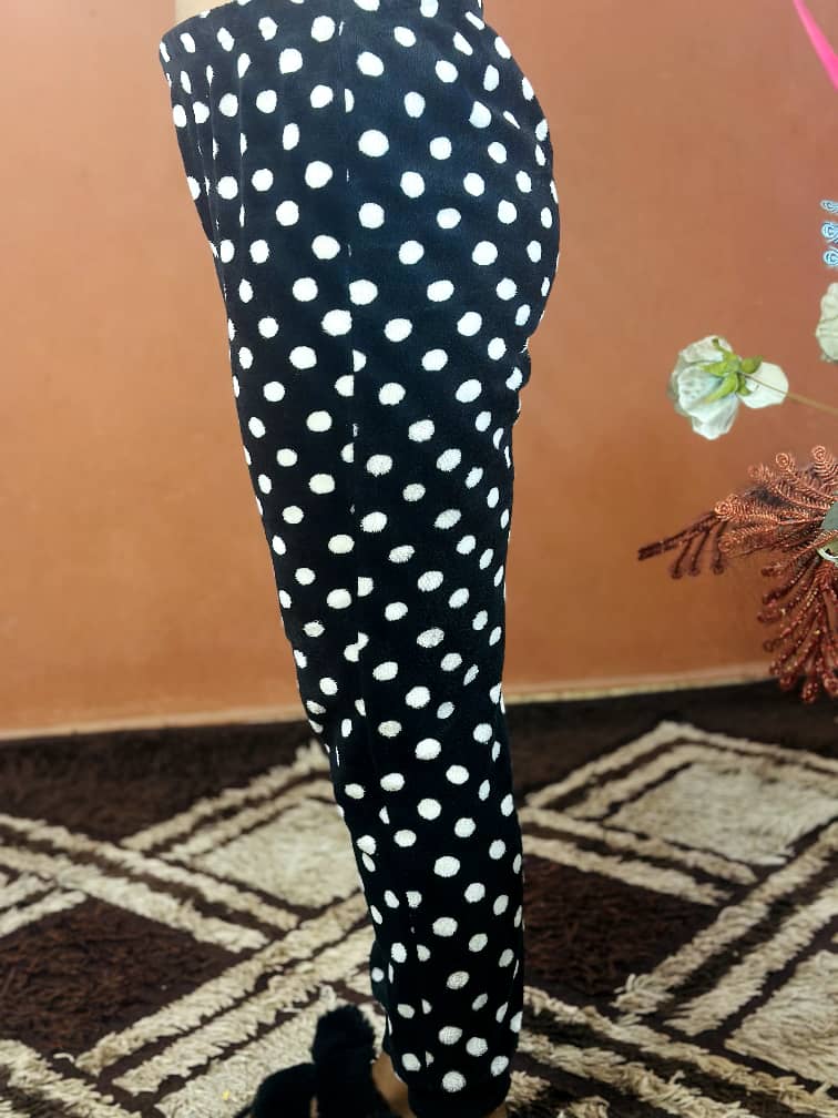 The Black and White Polka Dot Pants add a playful touch to your wardrobe while maintaining a classy appearance. Featuring a timeless polka dot pattern, these pants are easy to style and flattering for everyday wear.