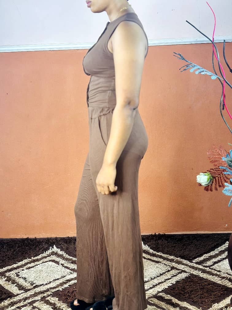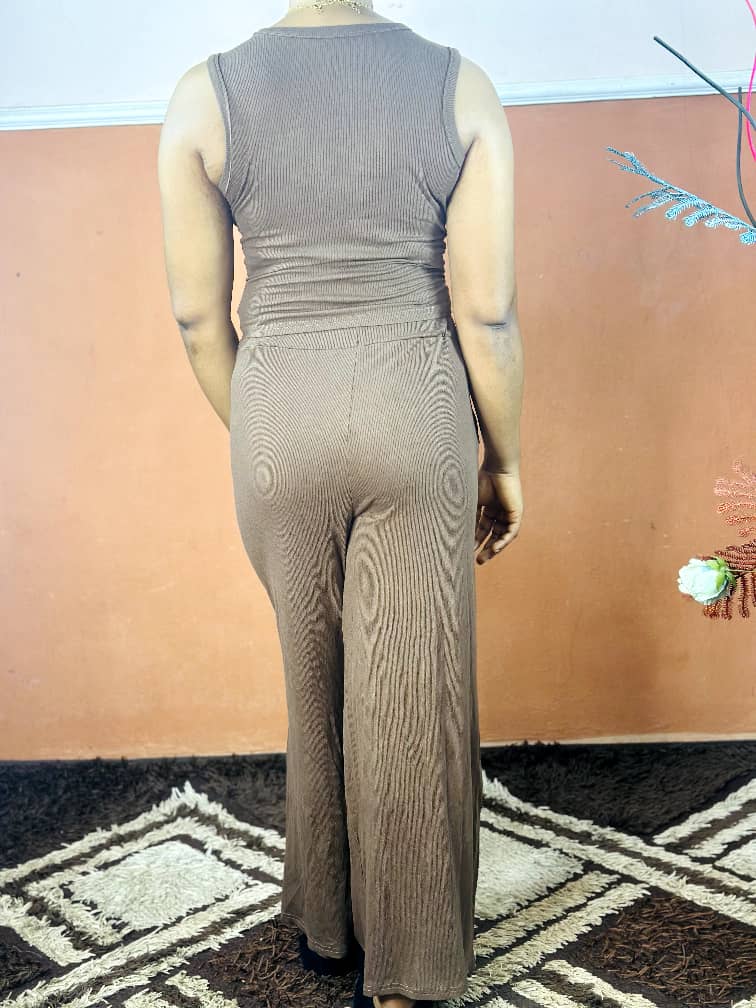 A chic brown two-piece set featuring a sleeveless tank top and wide-leg pants, designed for comfort and effortless style.