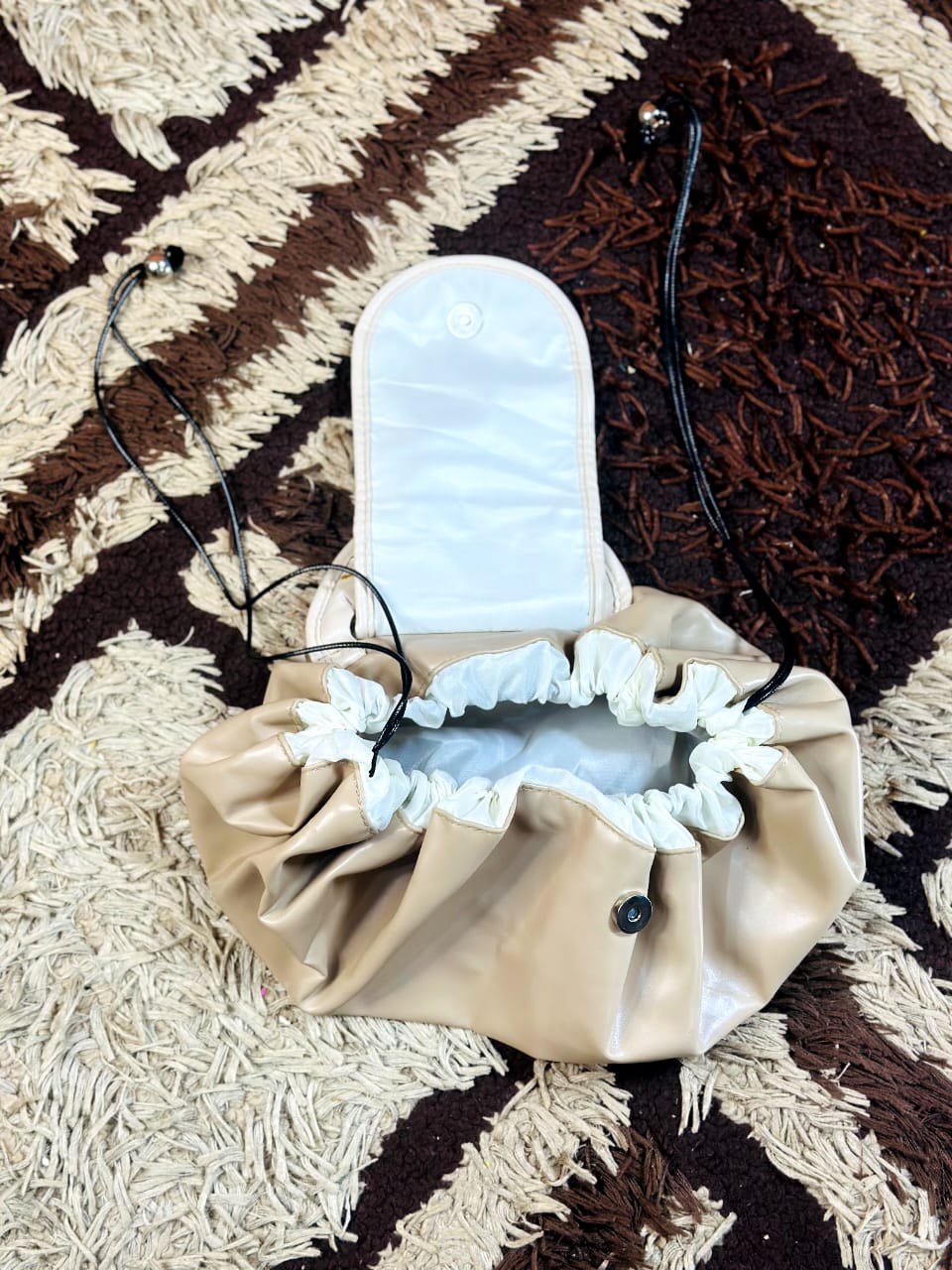 The Beige drawstring cosmetic travel bag helps you stay organized while looking neat and fashionable wherever you go.