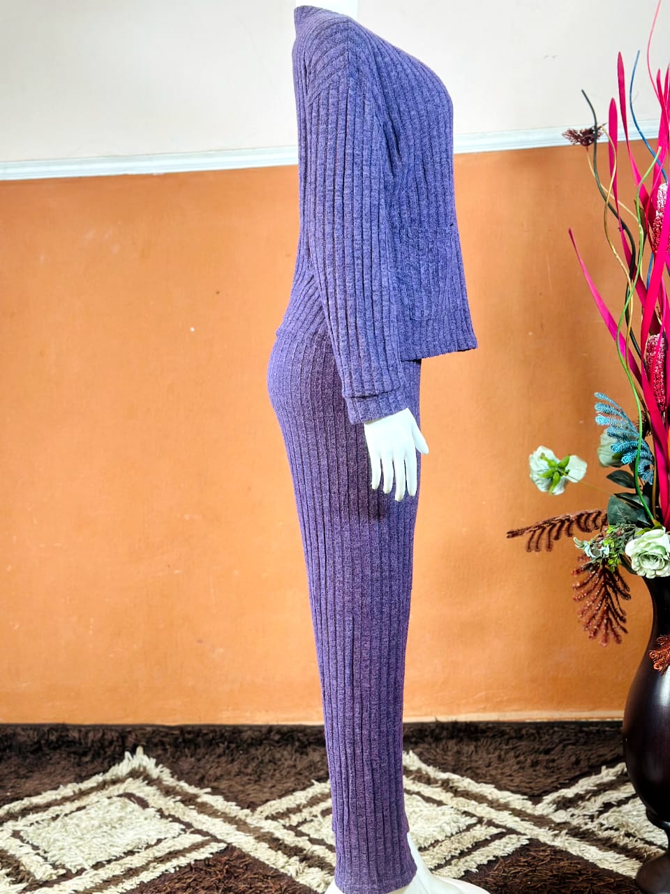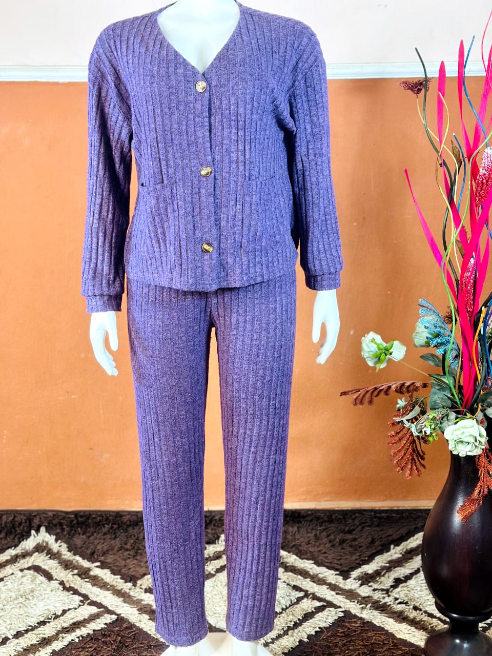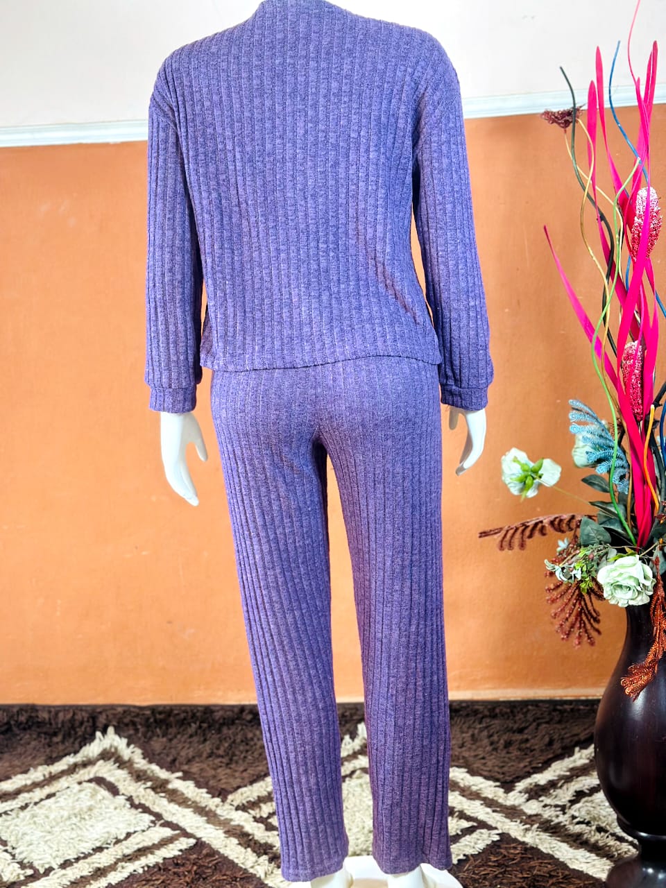 Shop women’s purple ribbed knit two-piece pajama and loungewear set — brand new, soft, stylish, and perfect for comfort at home.