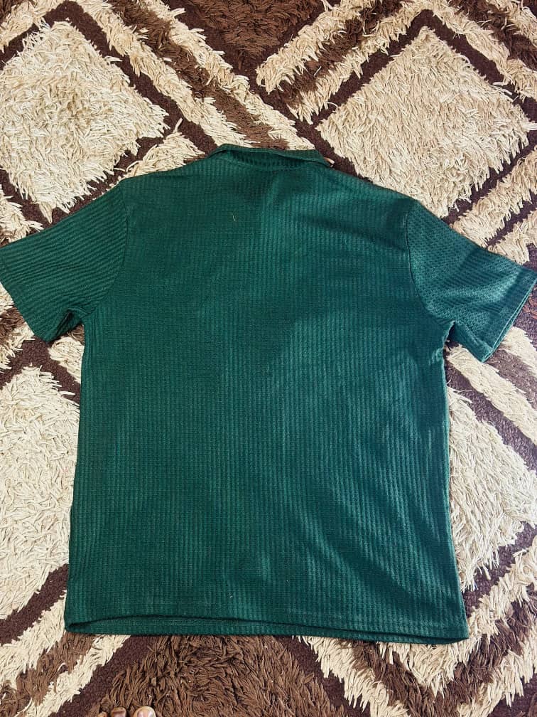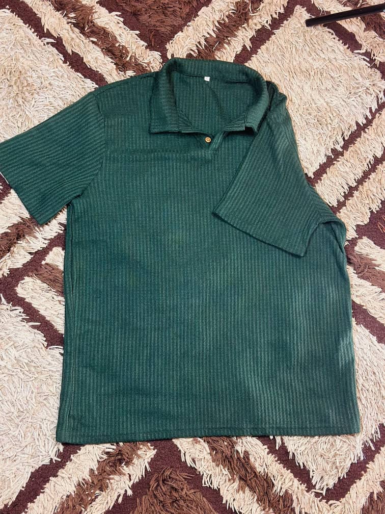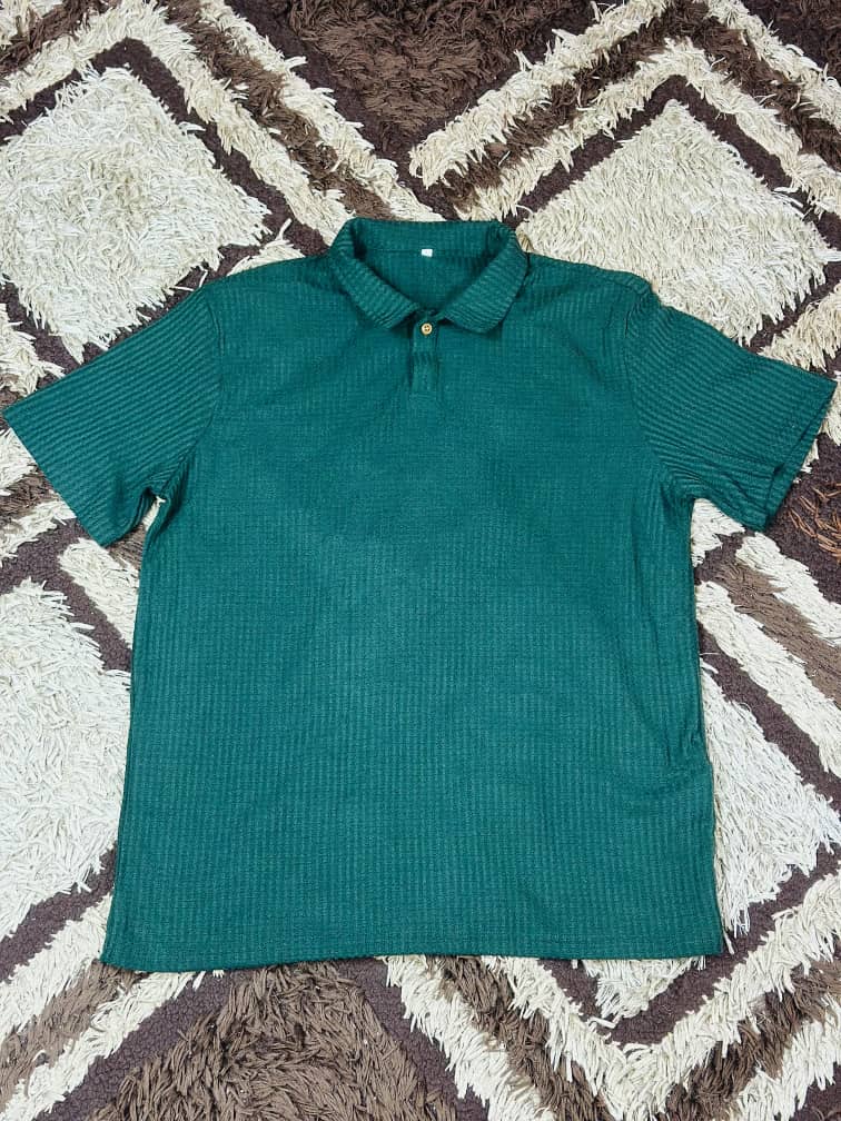 The Men’s Textured Green Knit Polo Shirt delivers comfort with a polished look. The textured knit elevates the classic polo style, making it perfect for casual days, office wear, or weekend outings.