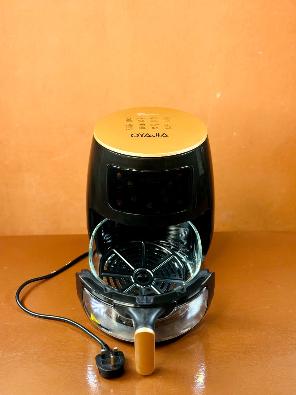 The front digital control panel makes it easy to select cooking settings, temperature, and time. With its stylish black and gold design, it adds a premium look to any kitchen countertop.
