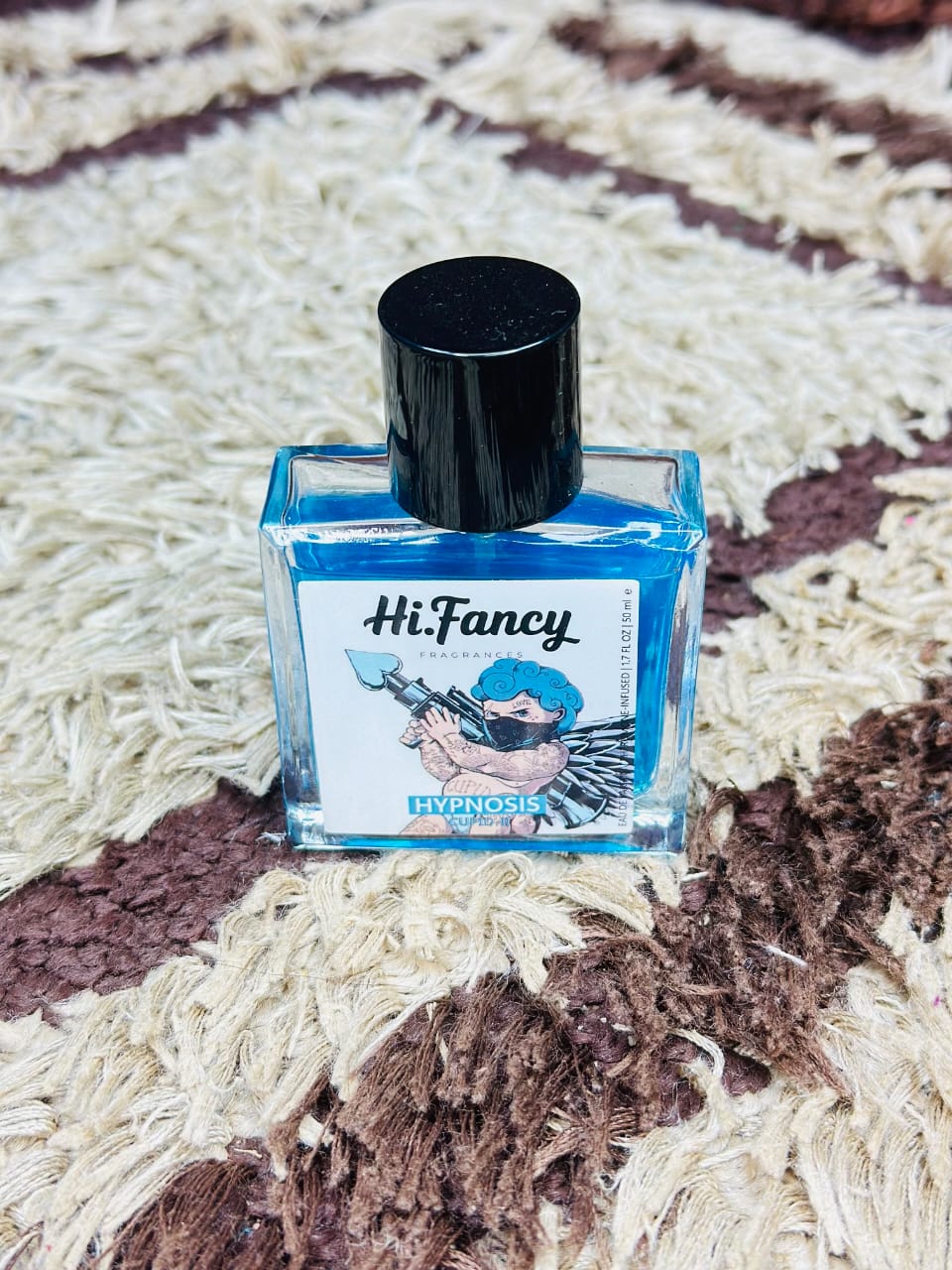 The Hi Fancy Hypnosis Eau De Parfum is a vibrant, modern fragrance presented in a striking blue glass bottle. Its artistic label and bold color reflect a fresh, energetic scent designed for expressive personalities.