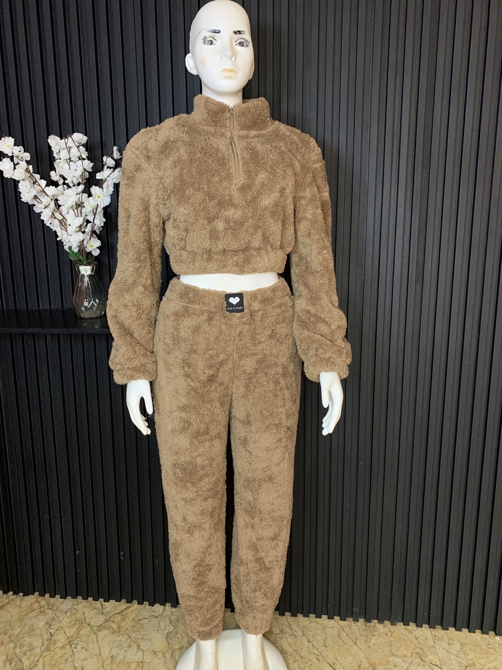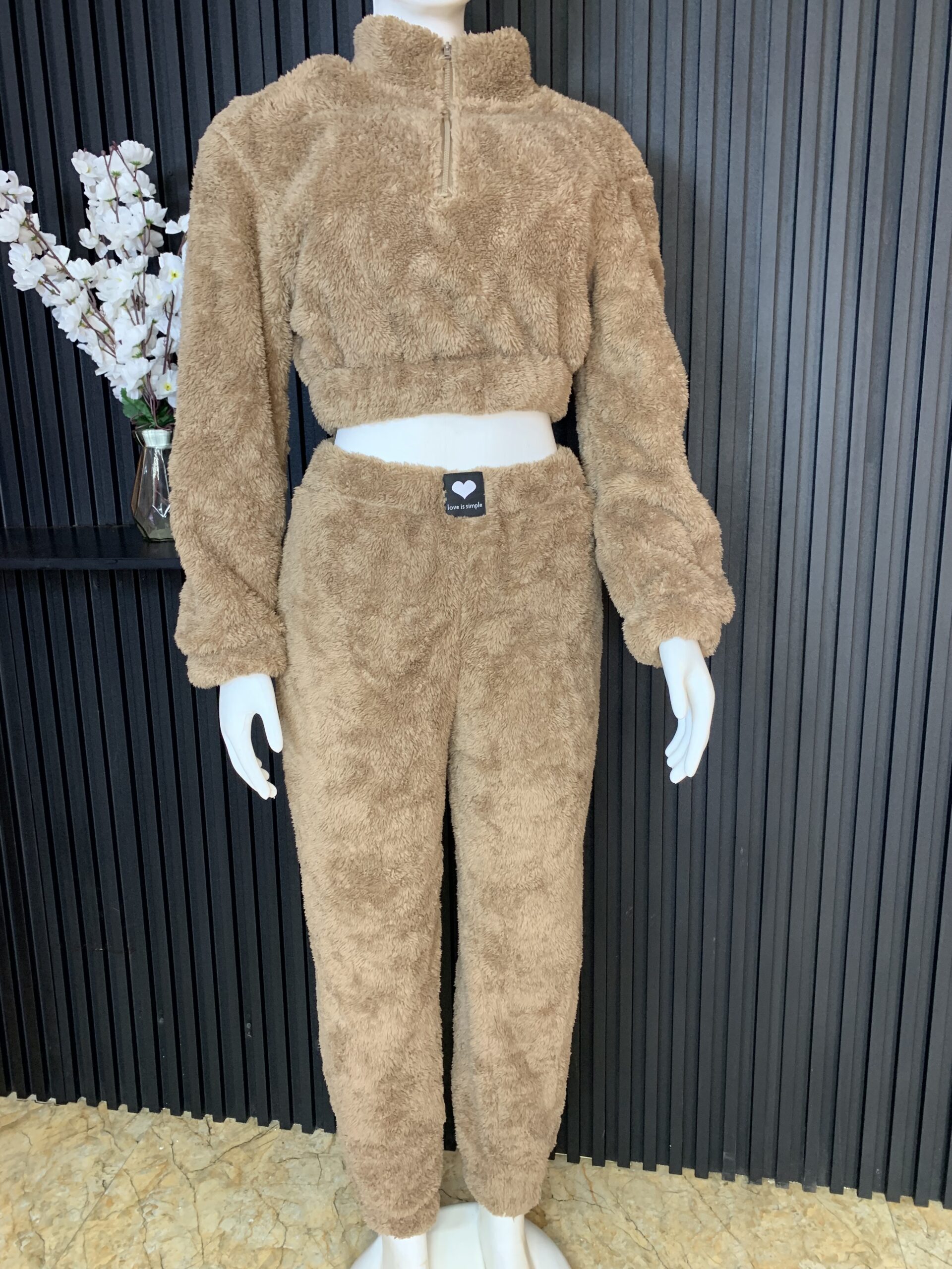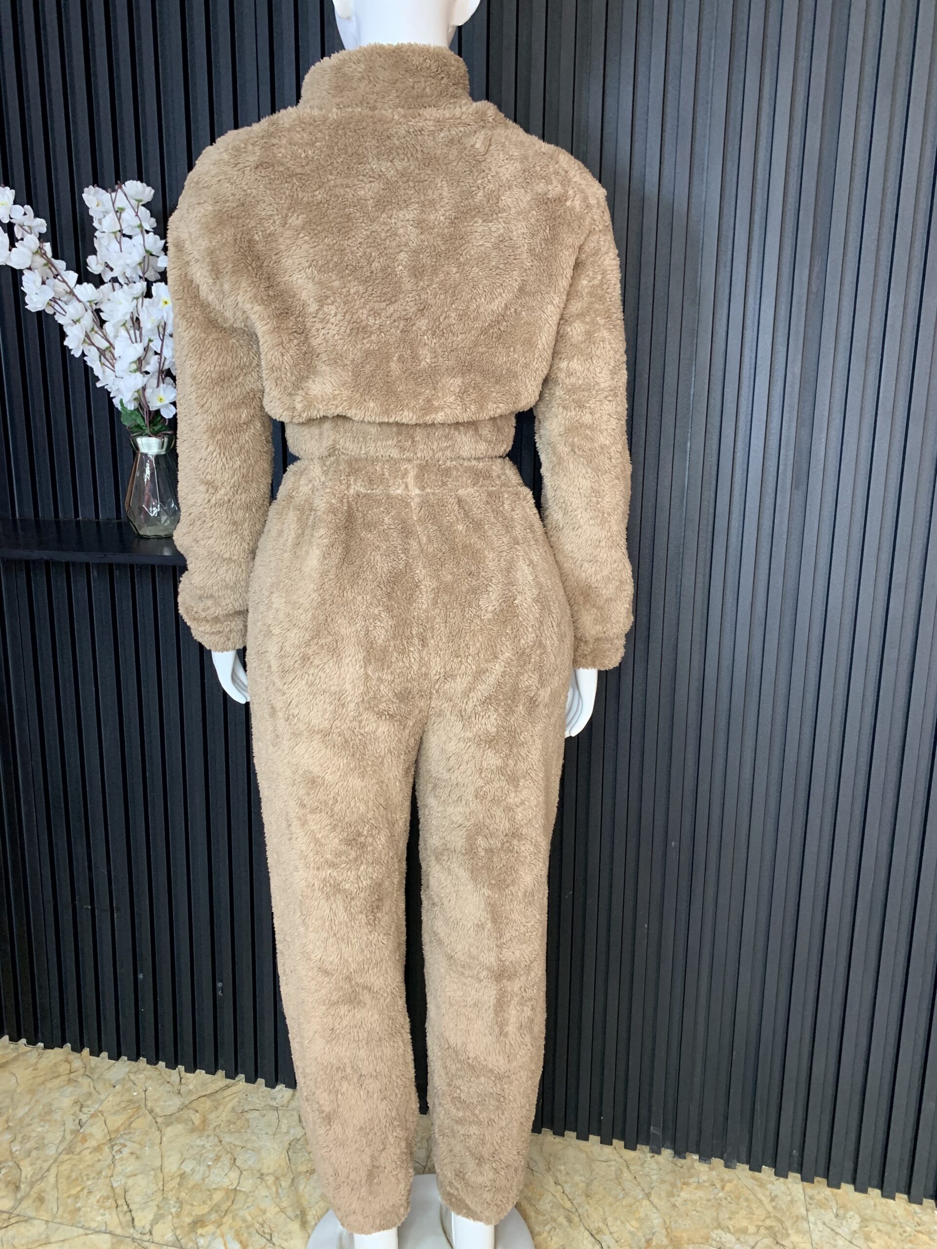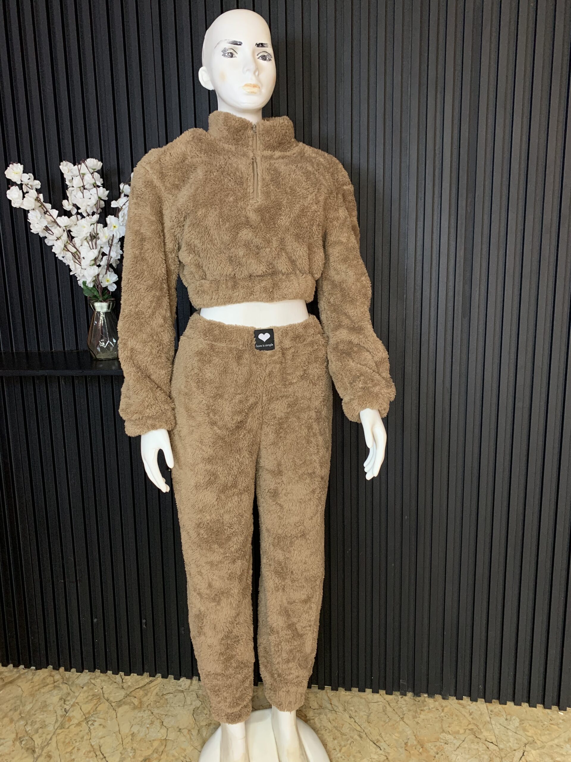 The outfit features a plush, fluffy texture that feels incredibly soft against the skin, providing warmth without compromising on style. The cropped top comes with long sleeves and a high neckline, giving it a modern and trendy look. The jogger pants are designed with a comfortable fit, allowing ease of movement while maintaining a flattering silhouette.