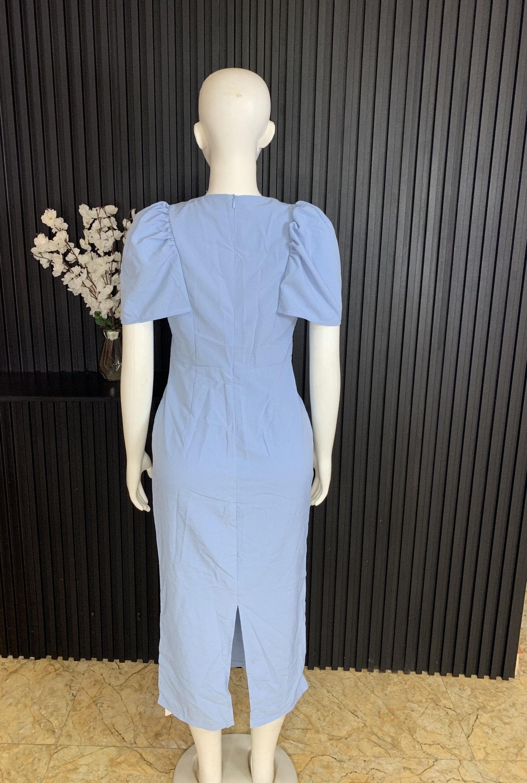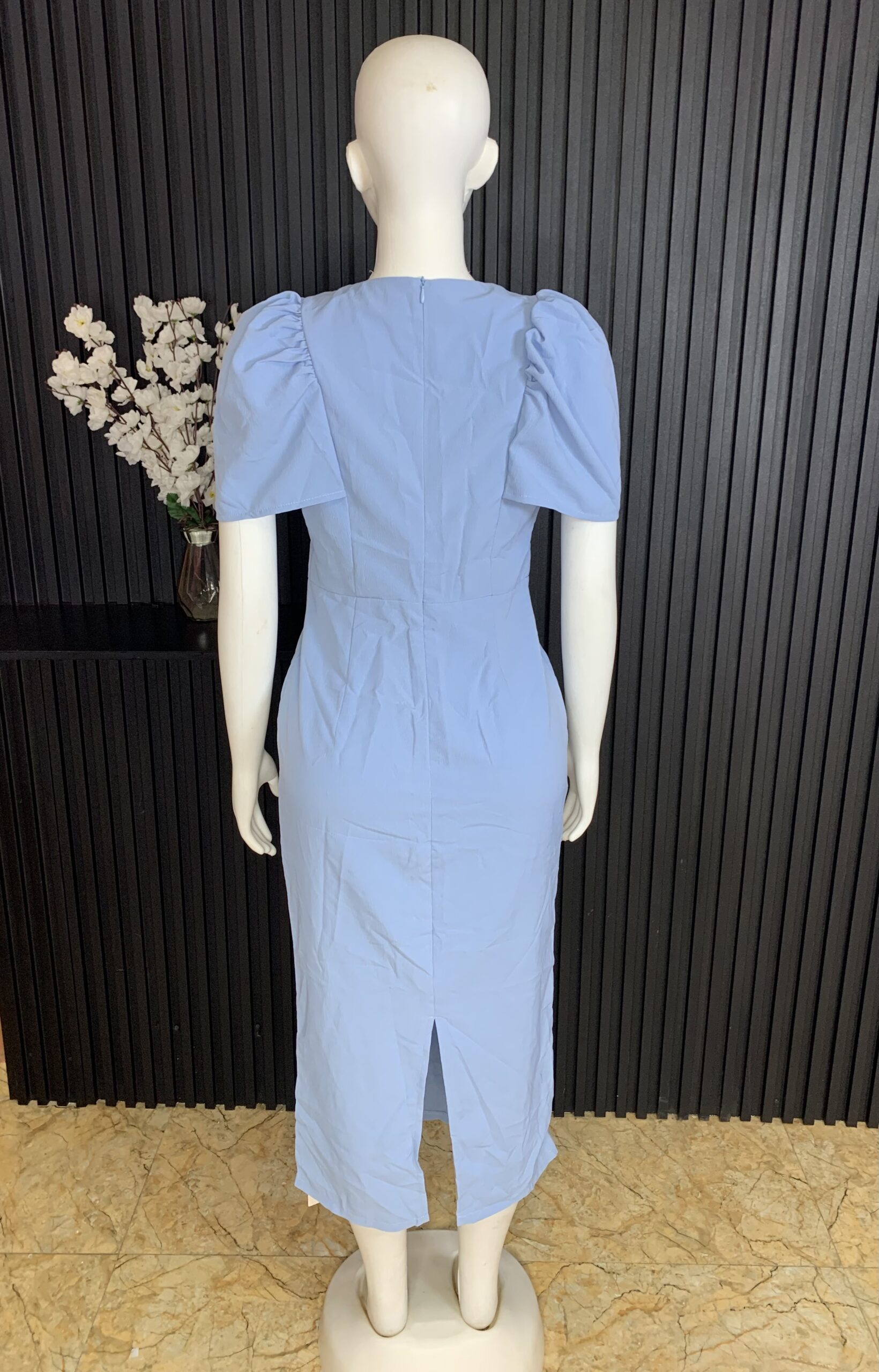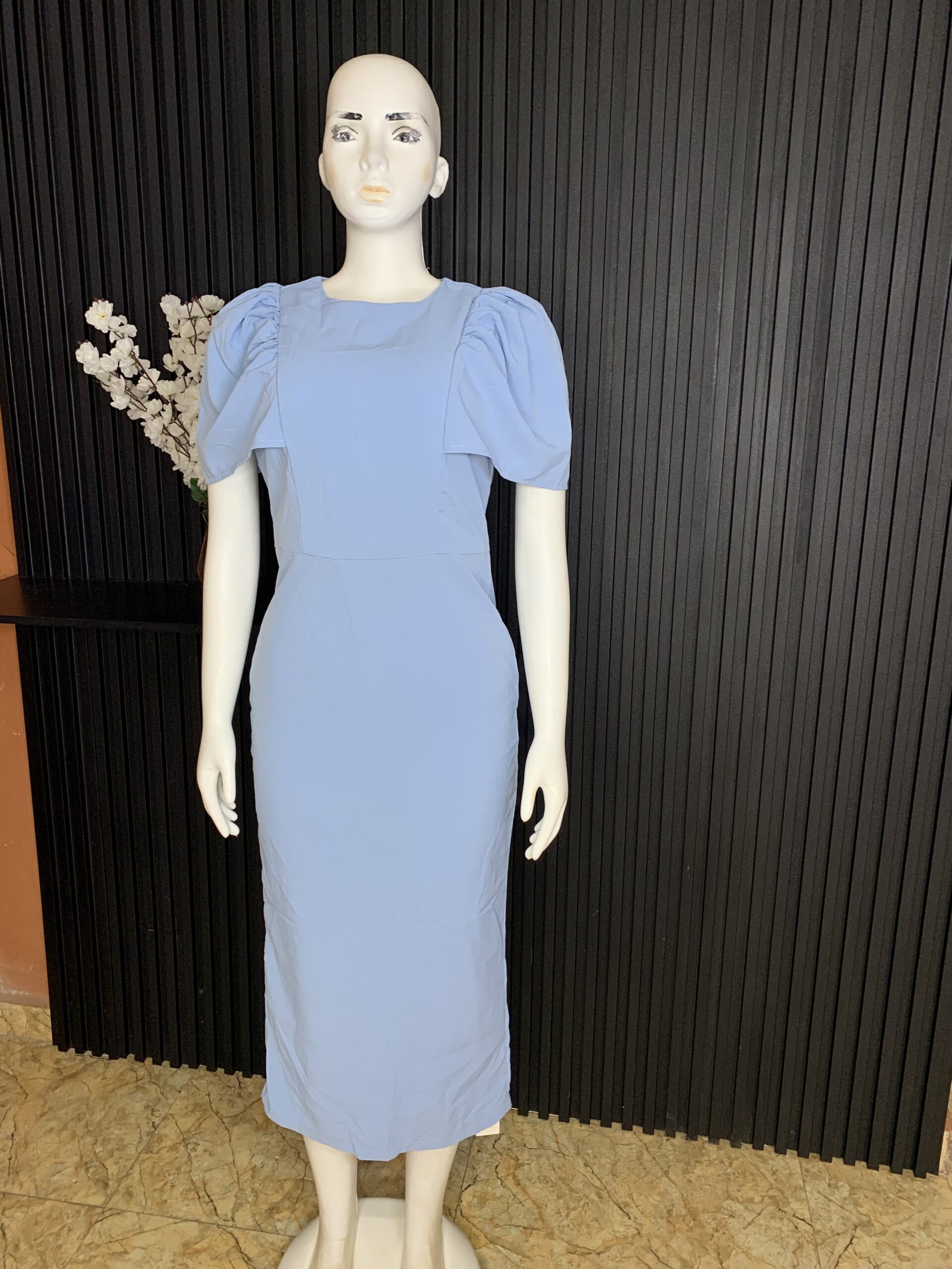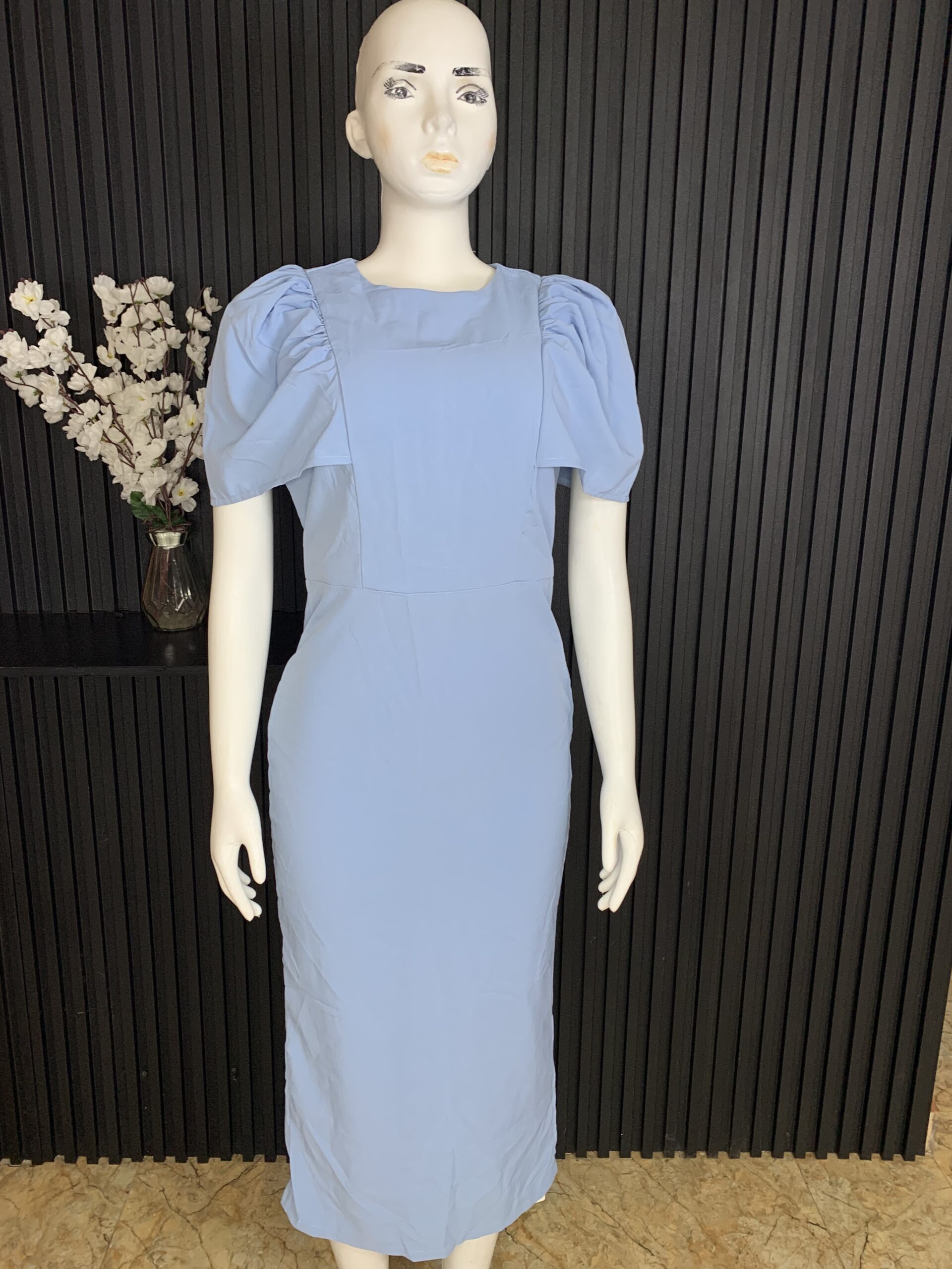 This Women’s Blue Bodycon Dress features a smooth bodycon structure that fits naturally on the body. The soft blue color gives a neat and refined appearance, while the puff sleeve detail adds a modern and balanced design element.