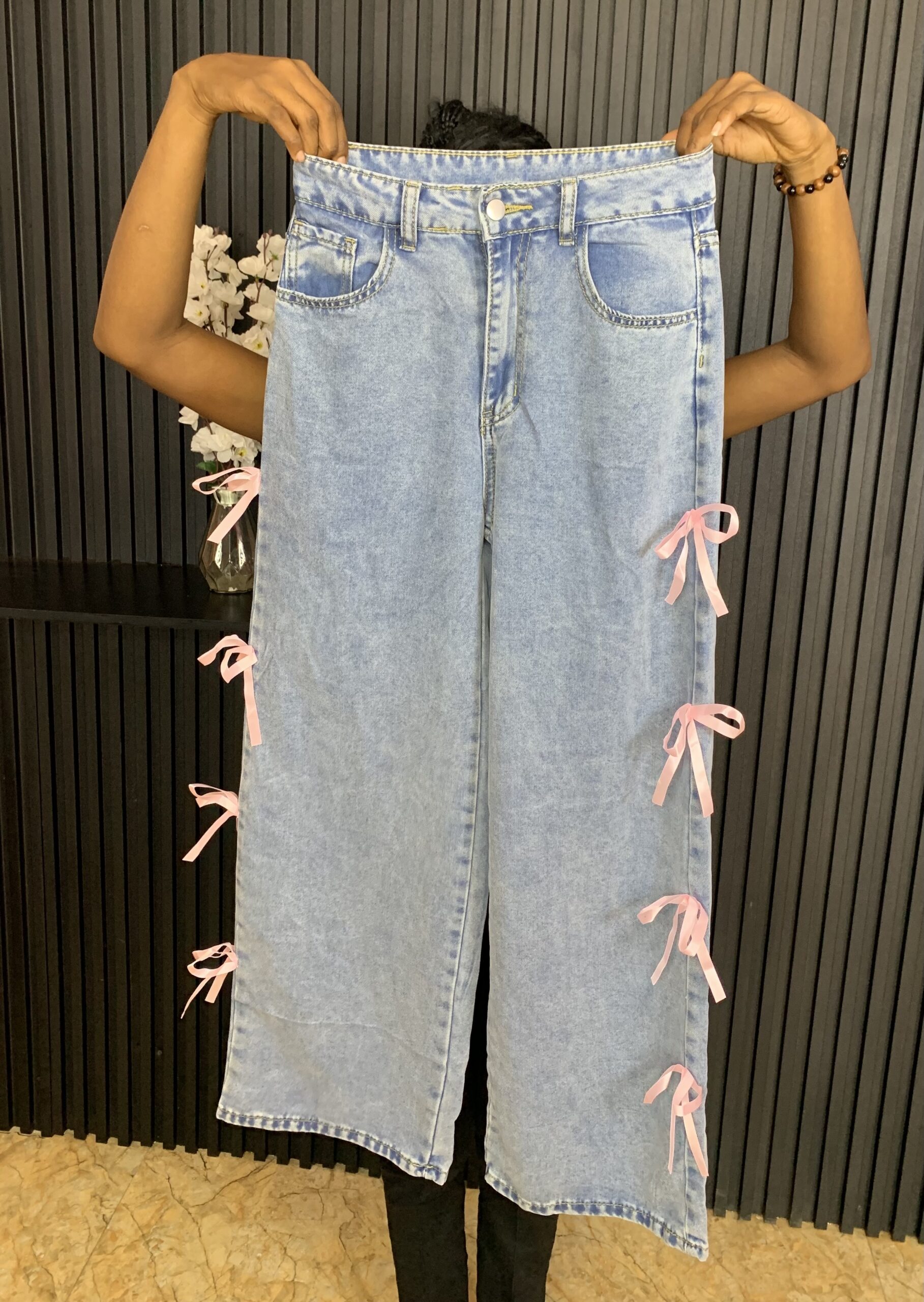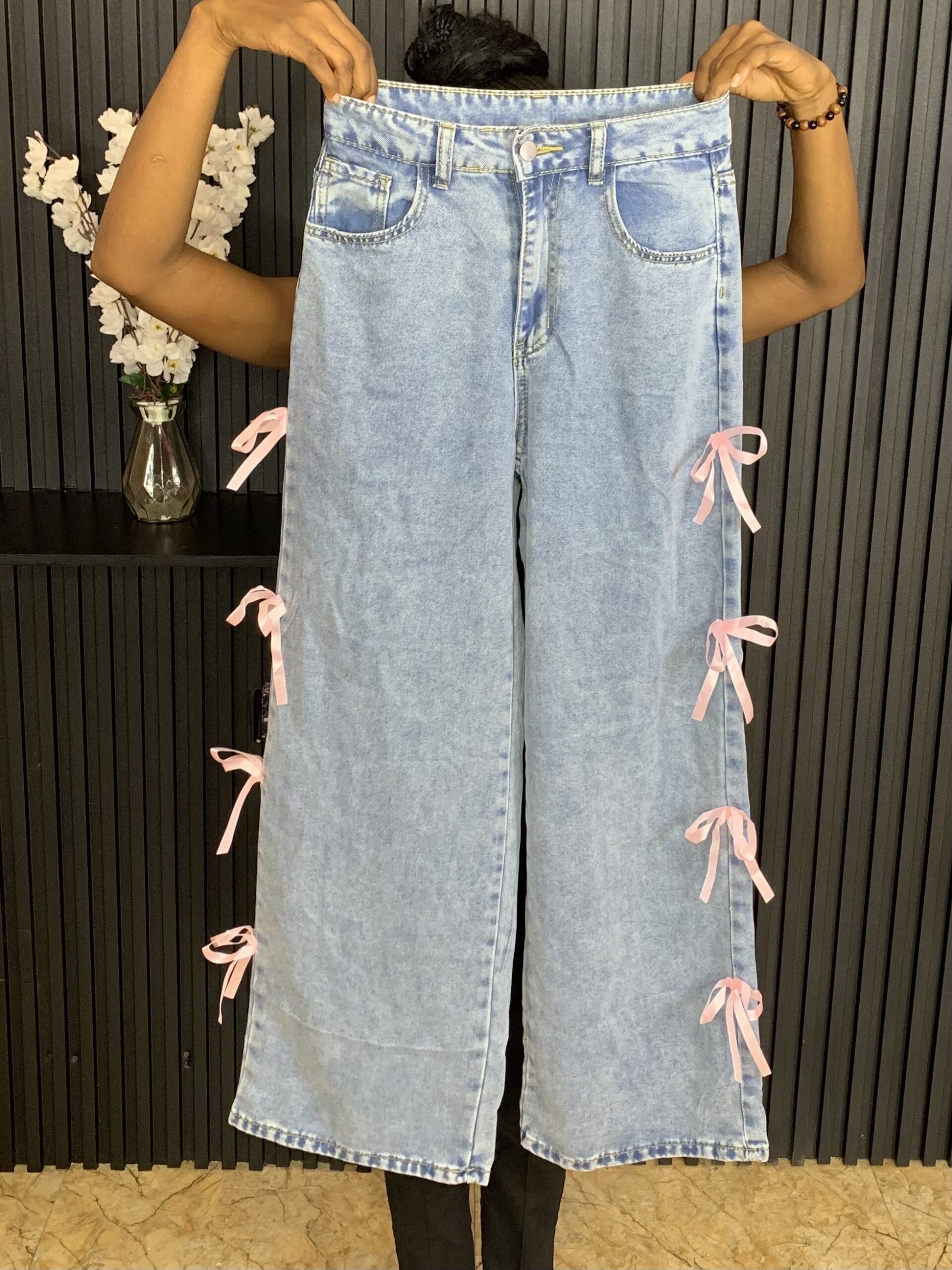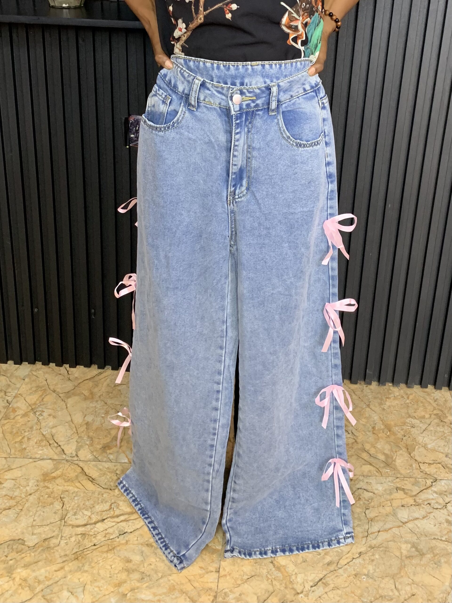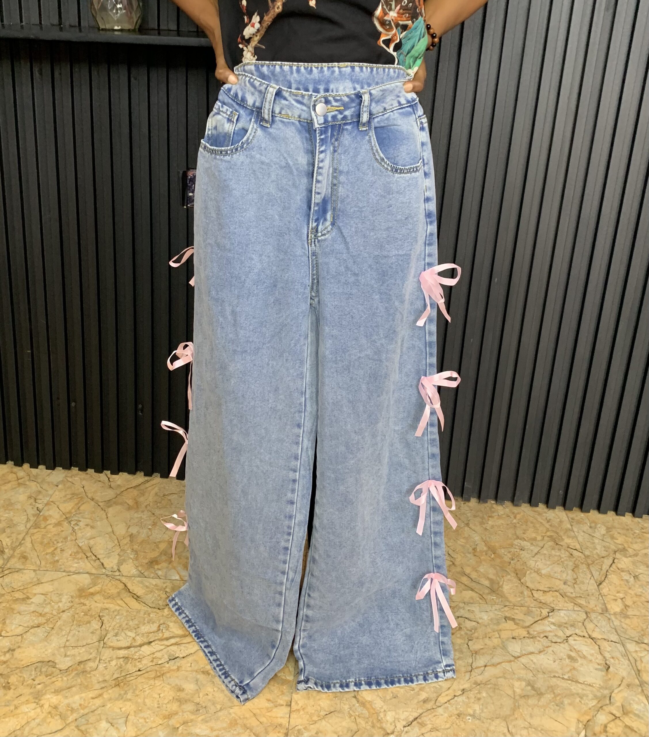 The standout feature is the pink ribbon lace-up detailing along the sides, adding a playful and fashionable touch that makes these jeans perfect for street style and casual outings. They are easy to pair with crop tops, t-shirts, or fitted tops for a complete stylish look.