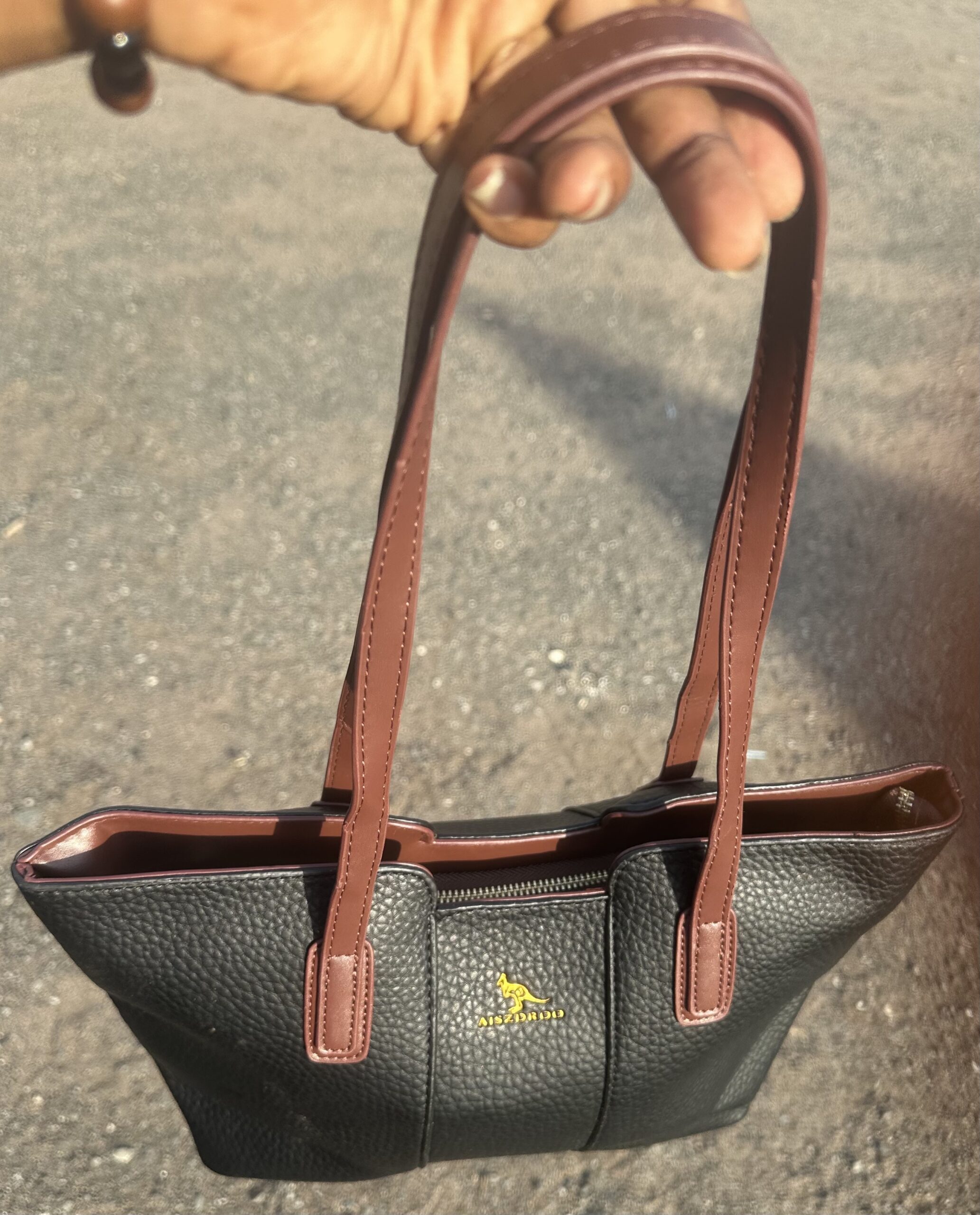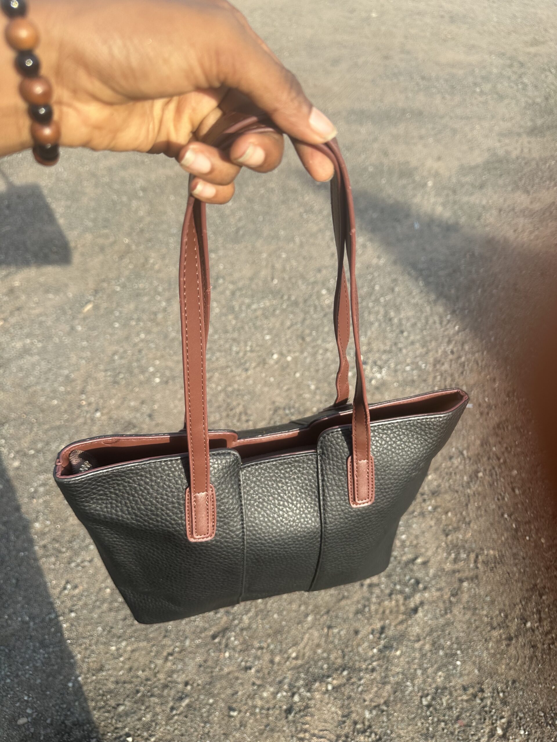 This handbag features a textured black leather finish with brown handle accents, giving it a classic and premium appearance.