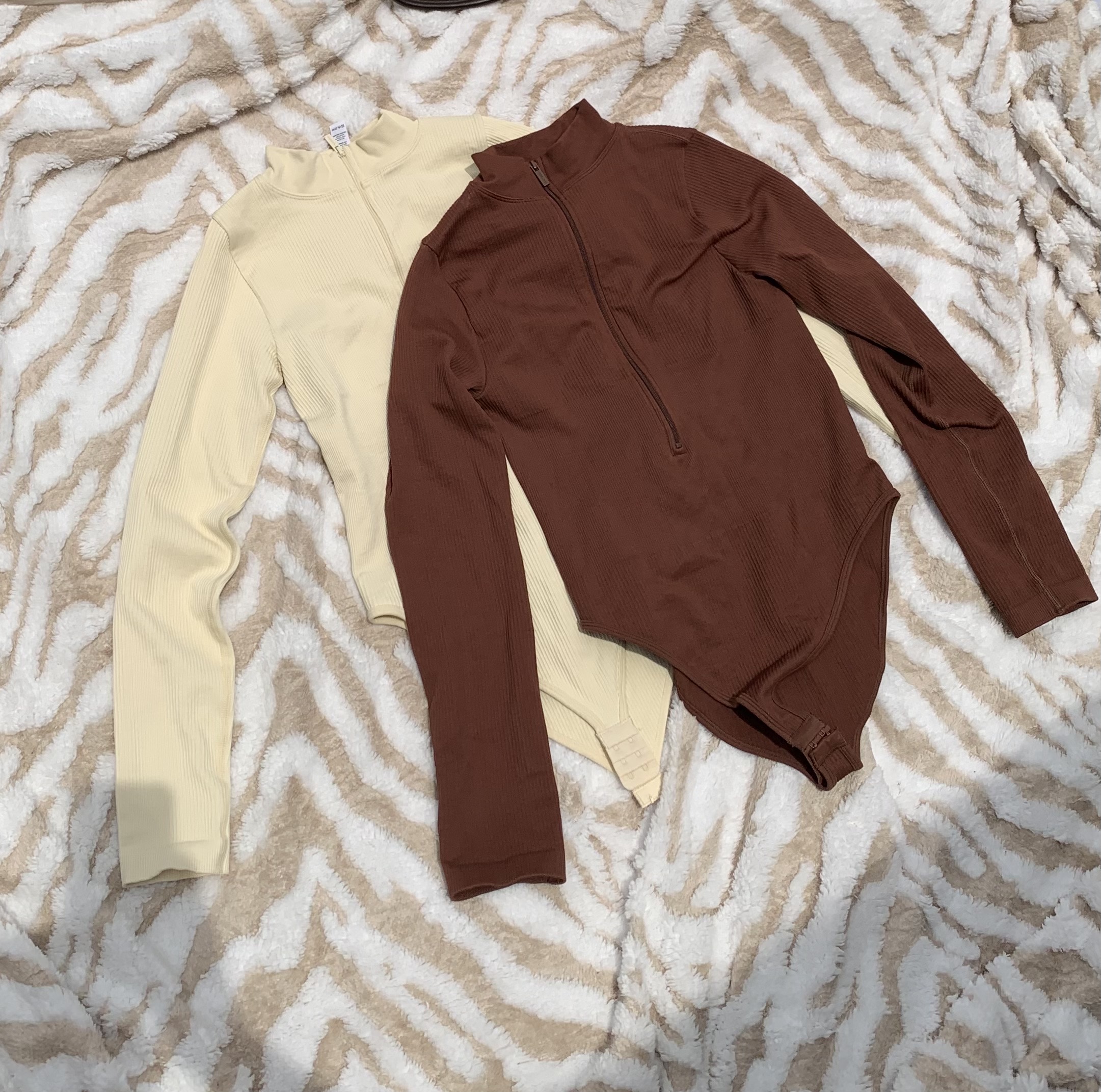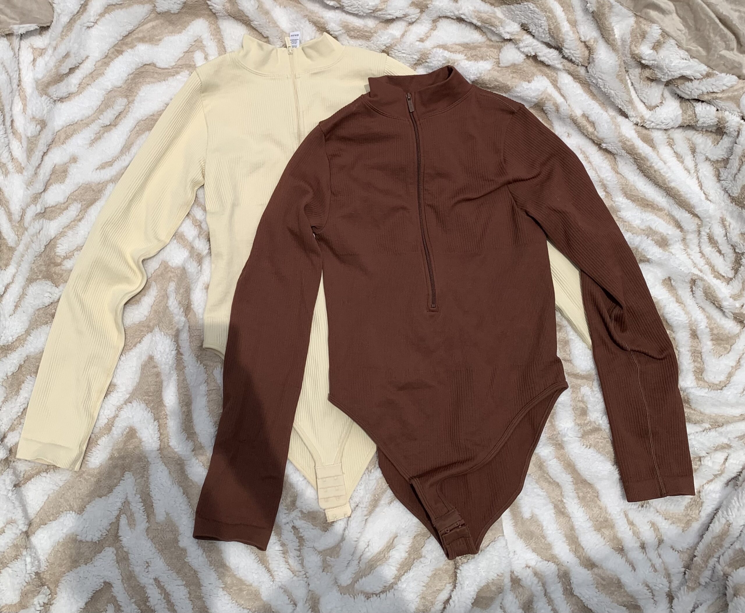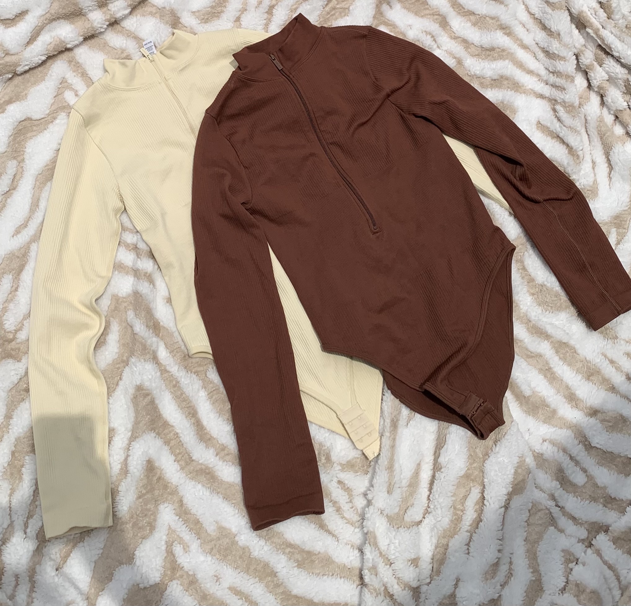 This bodysuit features a rich brown color with a zip-up front and ribbed texture, giving it a trendy and elegant appearance.