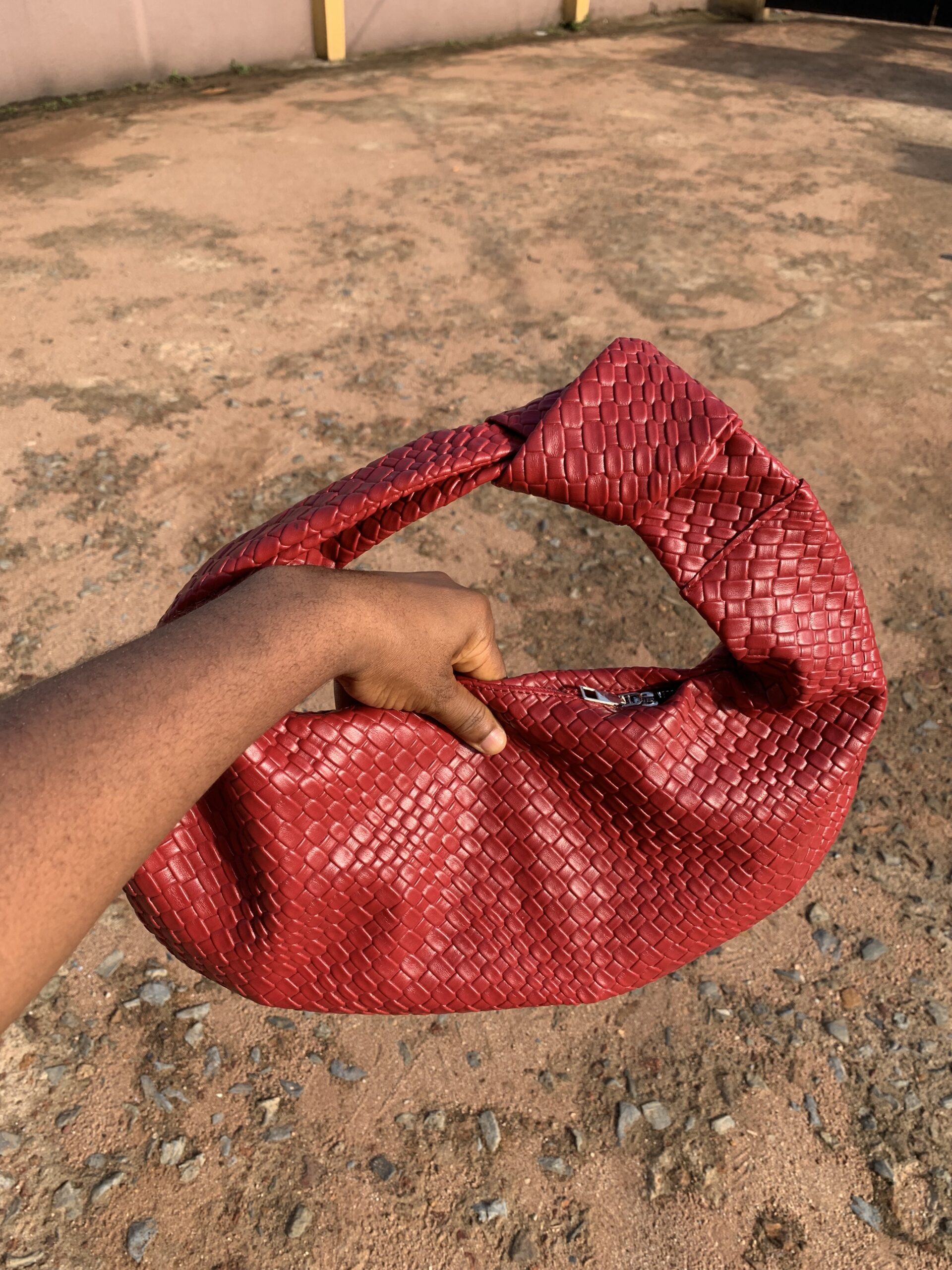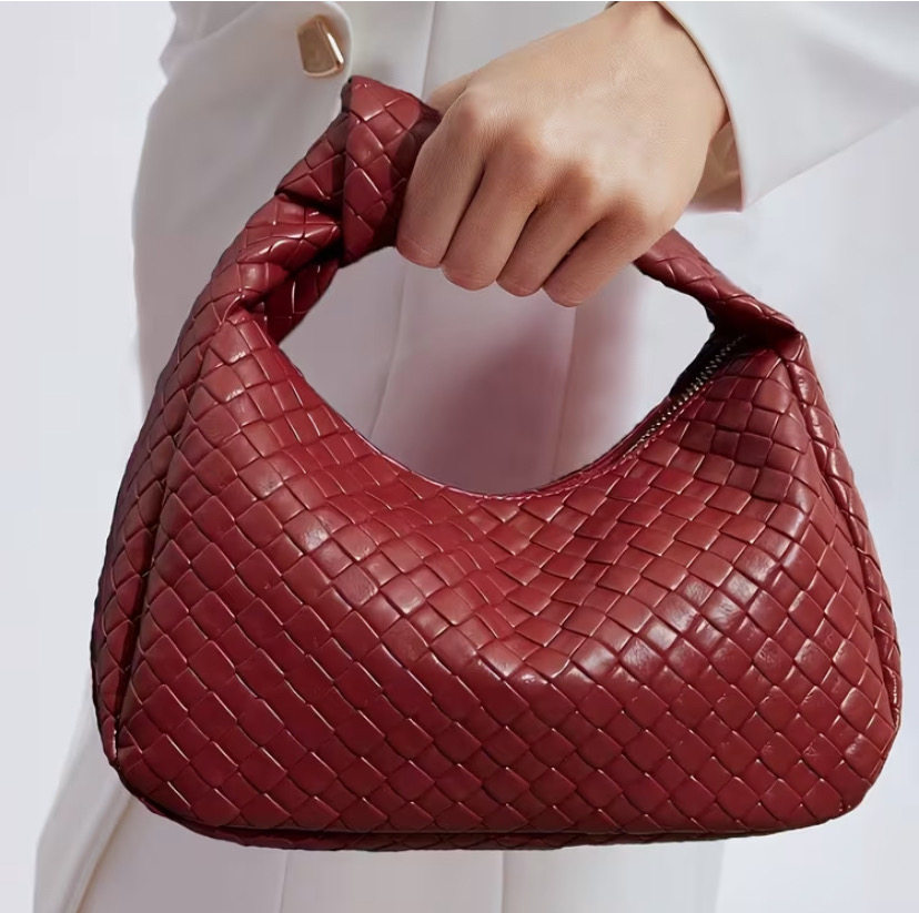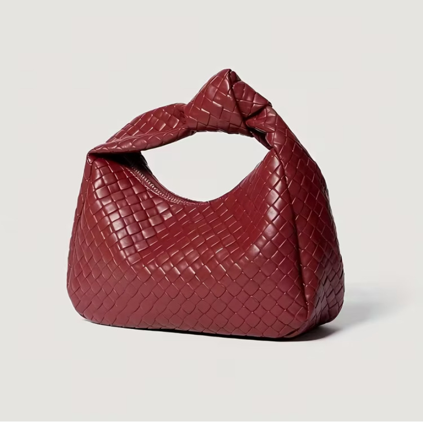 This handbag features a woven texture with a rich red color, giving it a trendy and eye-catching appearance.
