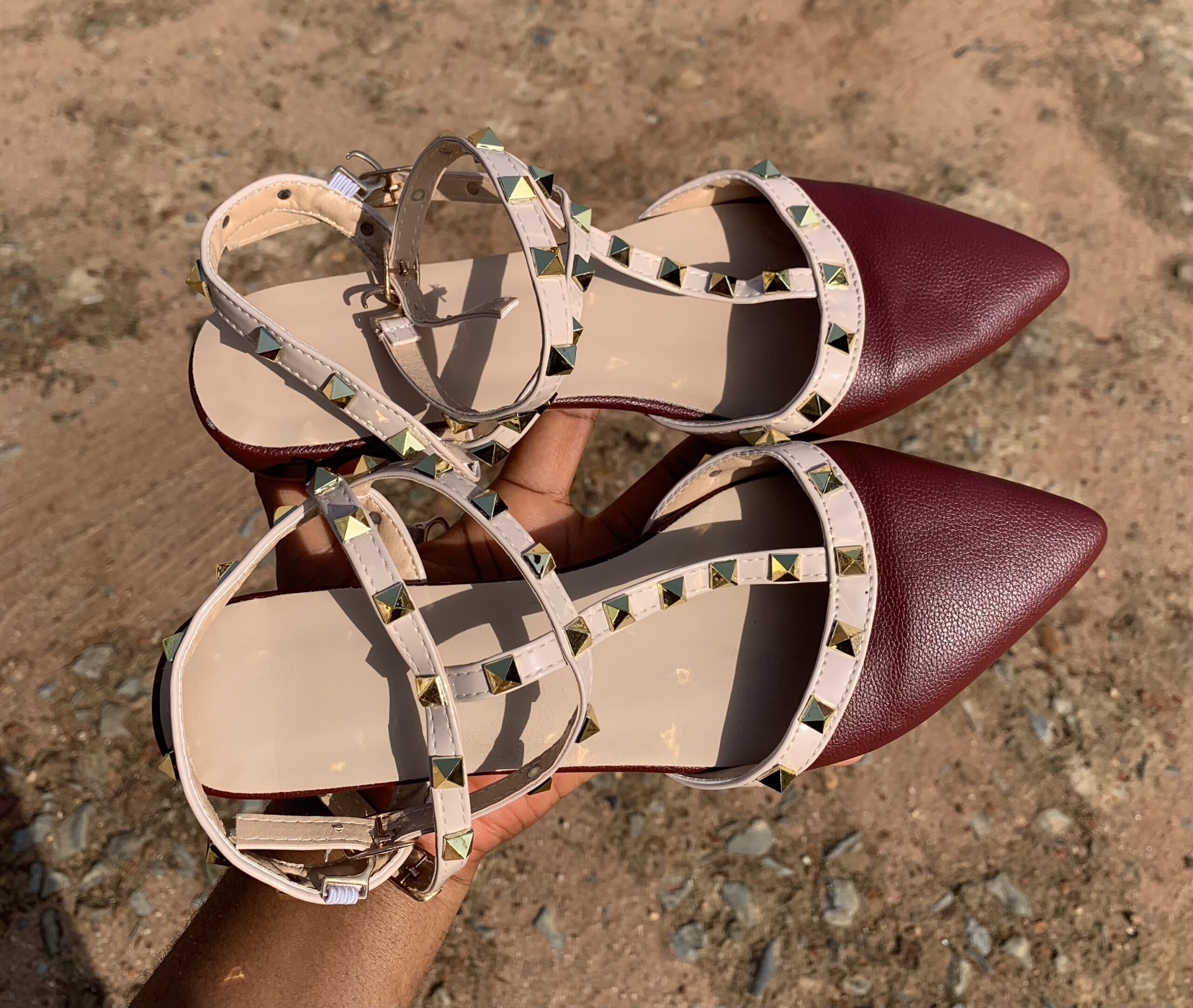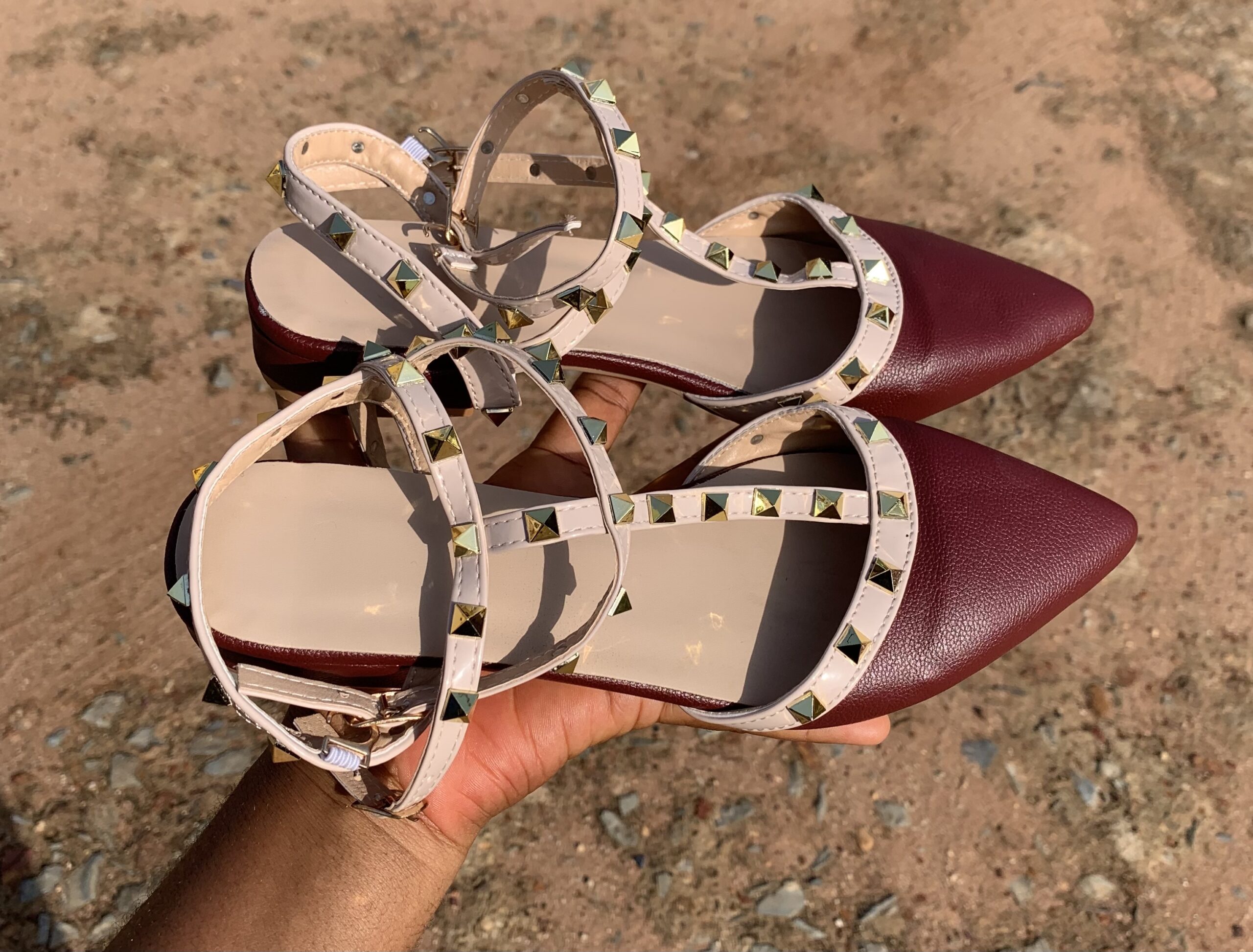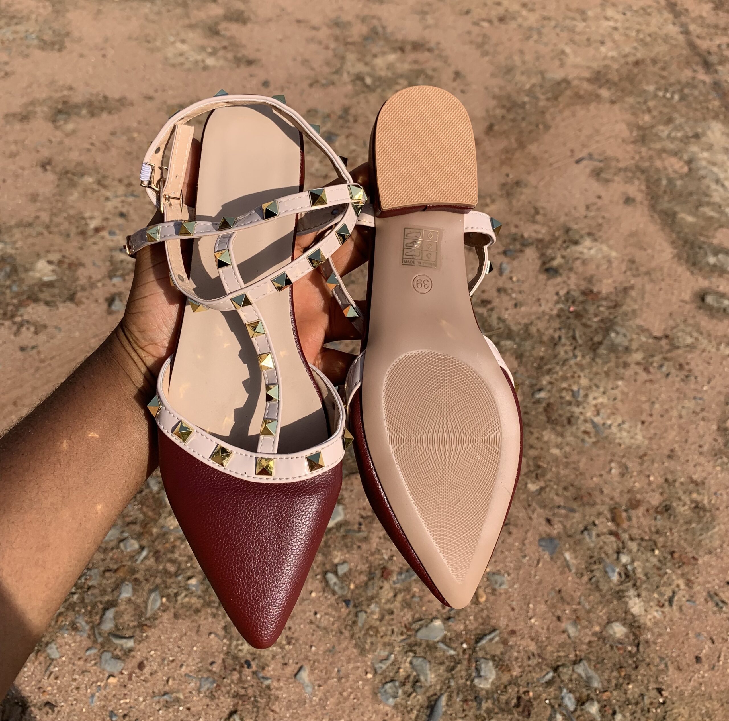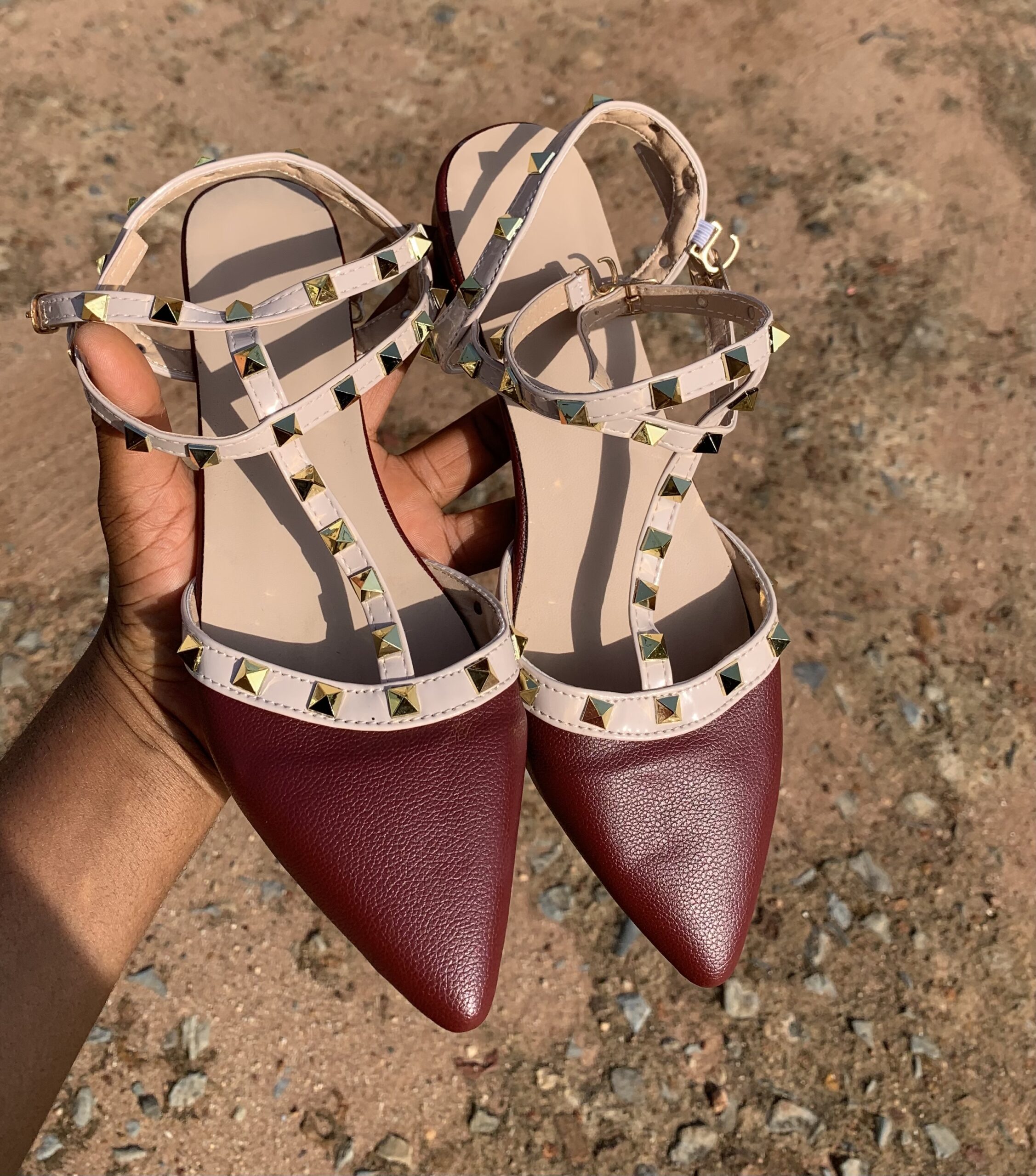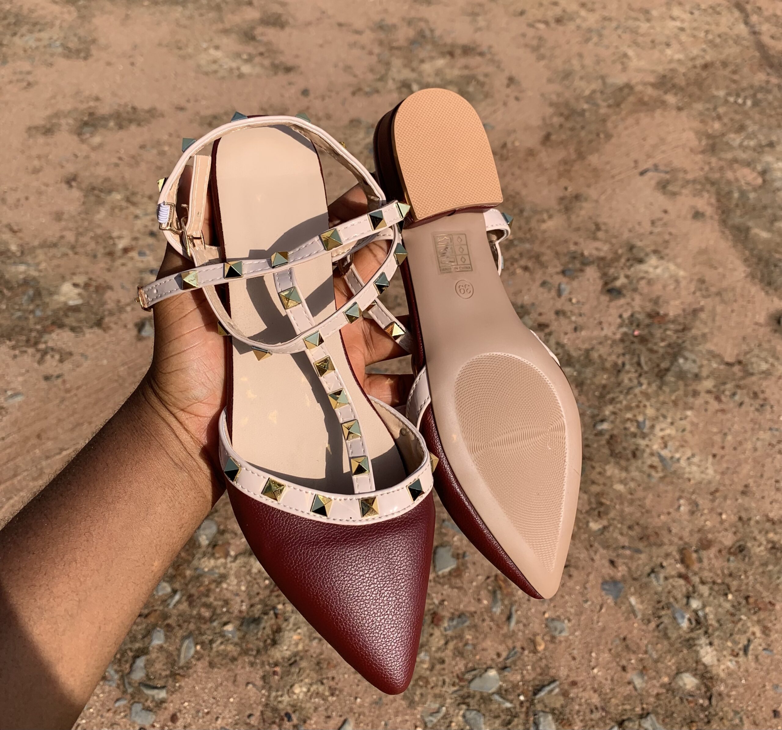 Features a classic flat design with stylish studded details that add a bold and trendy touch.