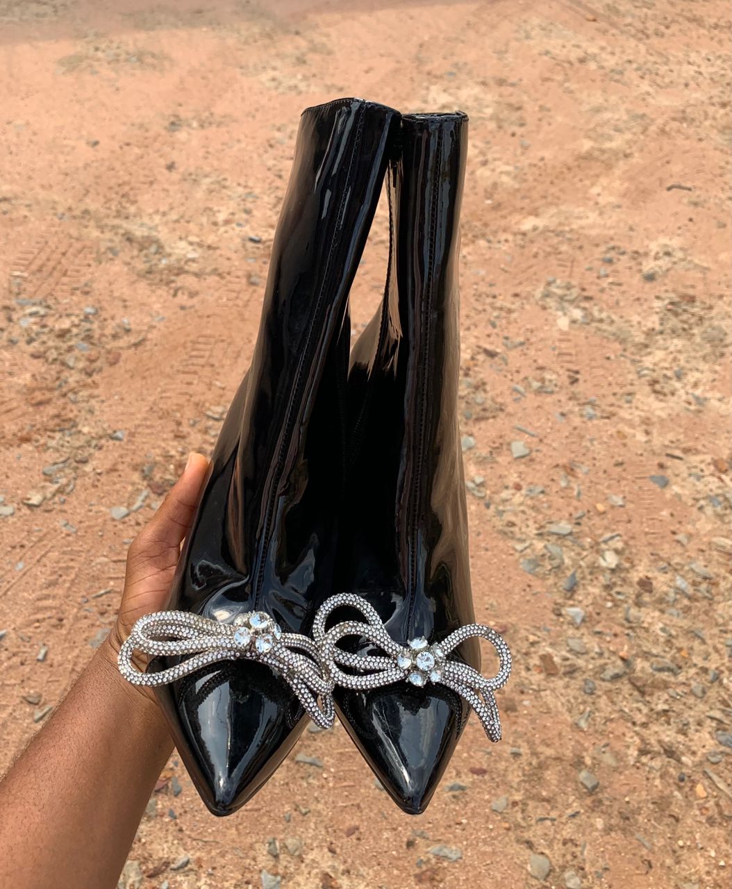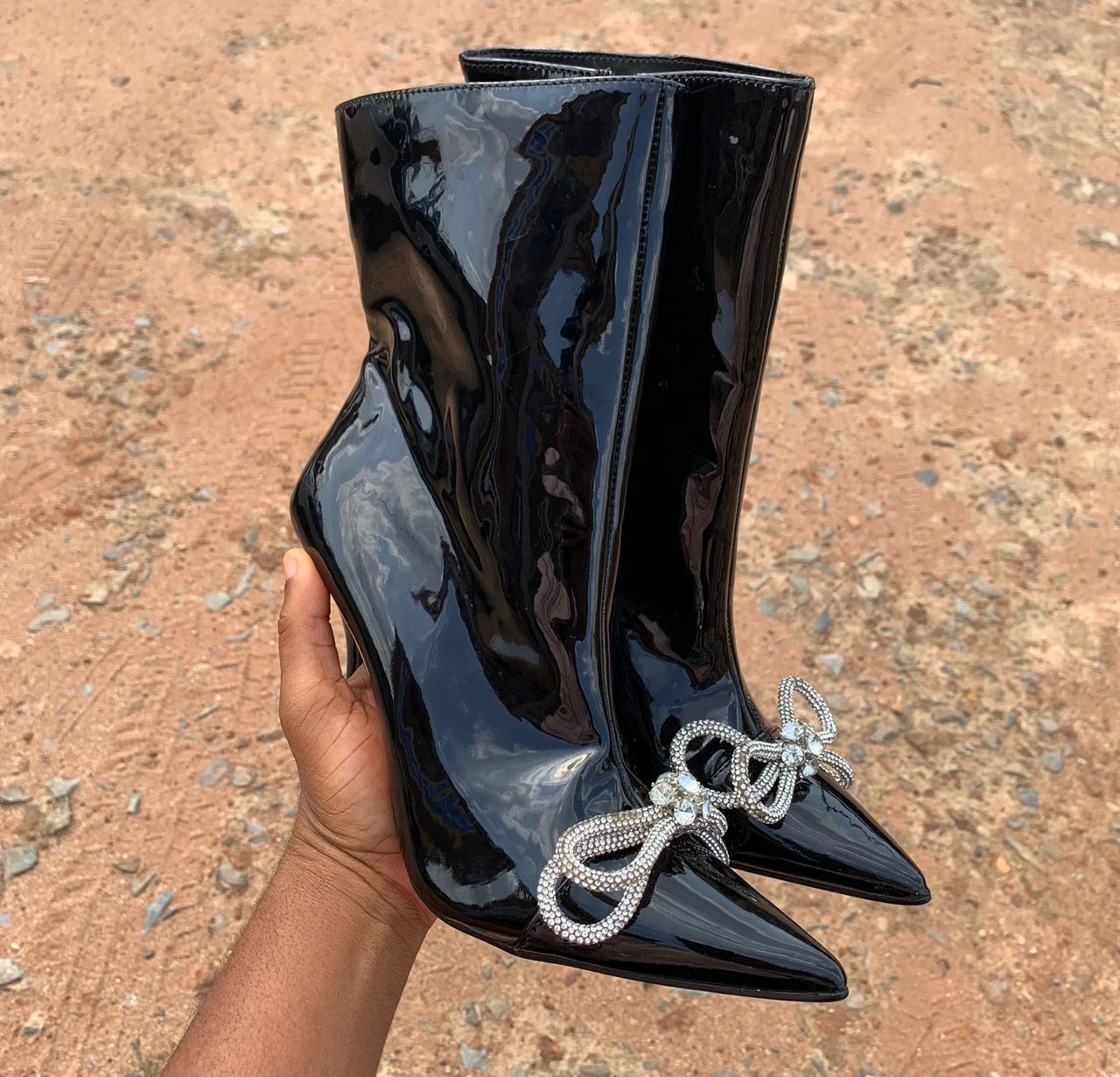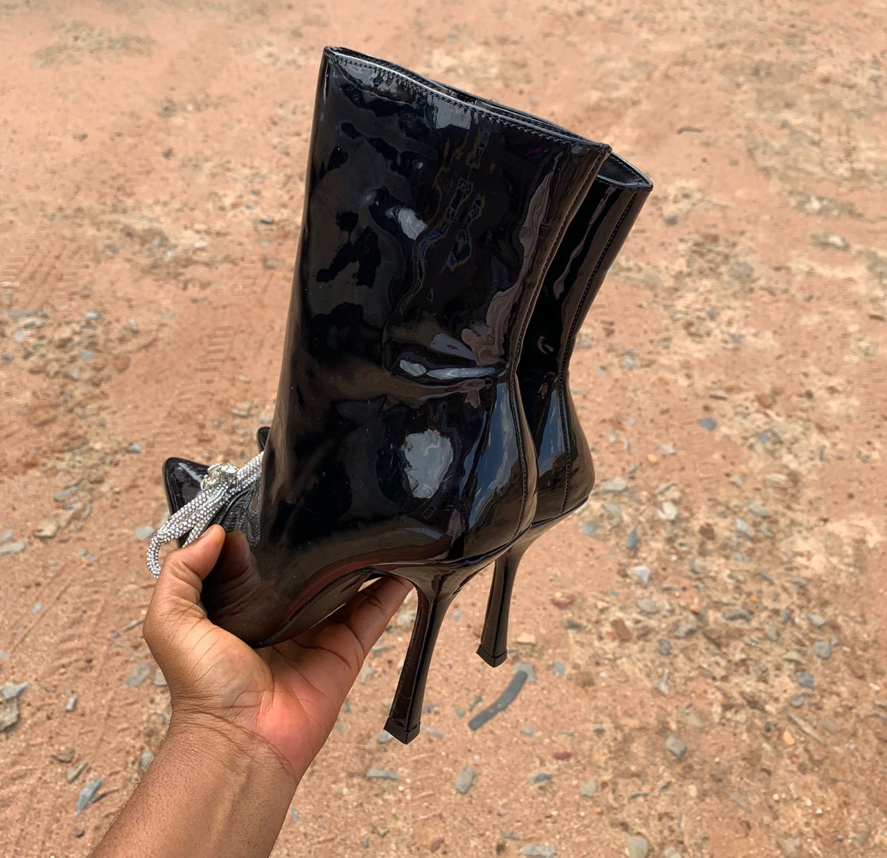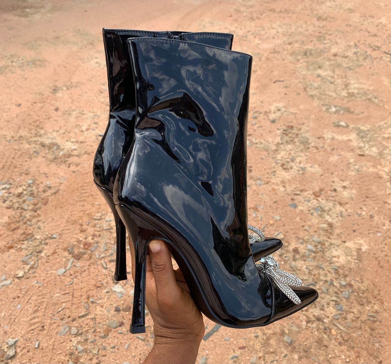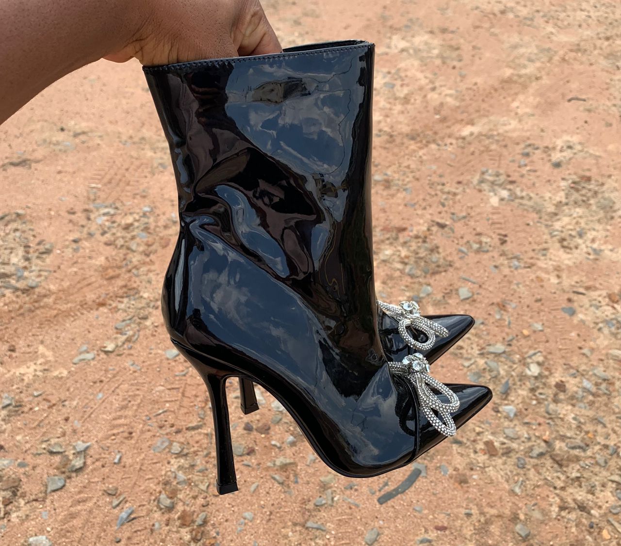 Step Out In Bold Confidence With These Sleek Black Ankle Boots, Designed To Elevate Your Style Instantly. Crafted From Glossy Patent Leather, These Boots Feature A Sharp Pointed Toe And A High Stiletto Heel That Delivers A Classy, Sophisticated Look. The Standout Detail Is The Elegant Rhinestone Bow Accent, Adding A Touch Of Luxury And Sparkle.