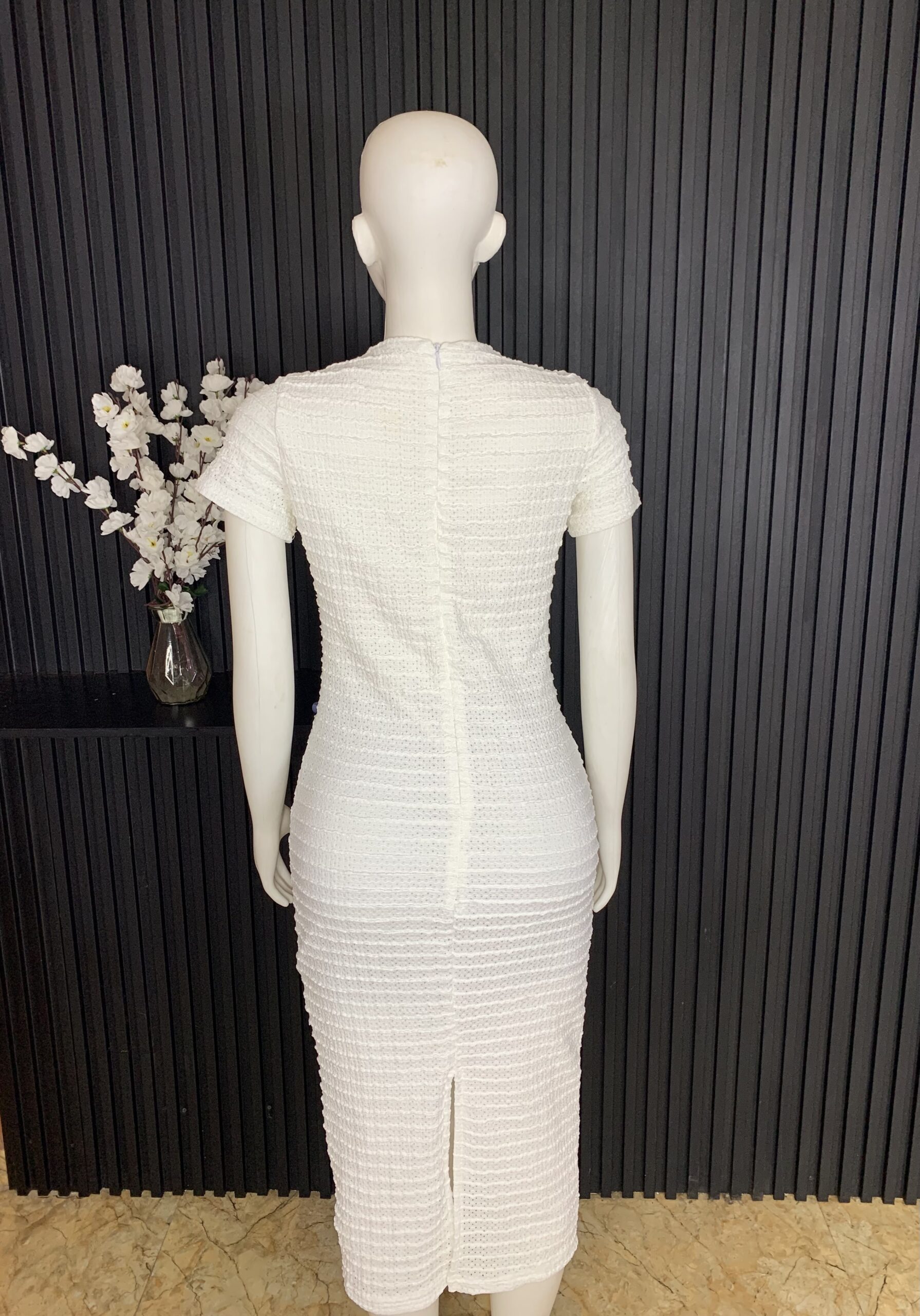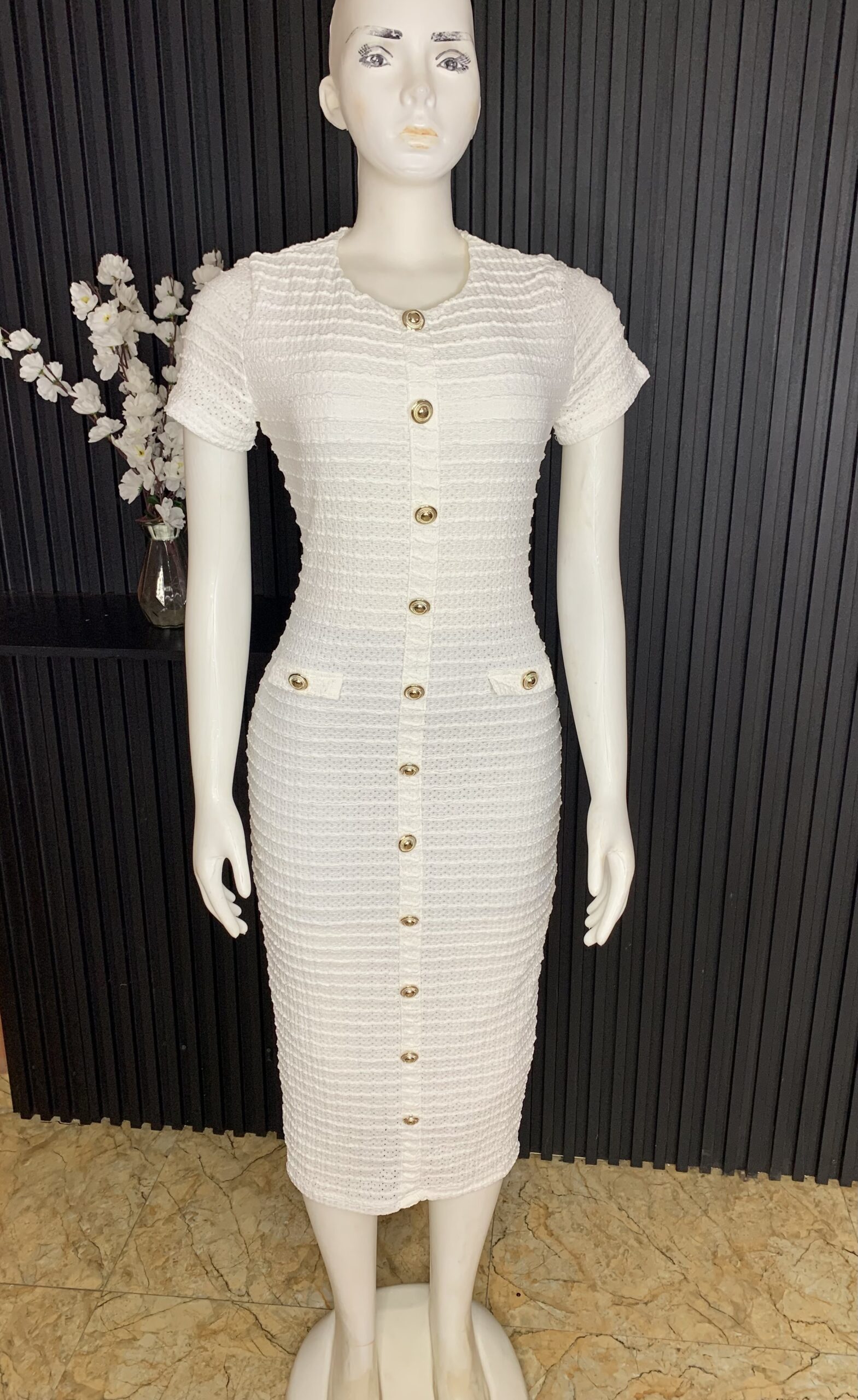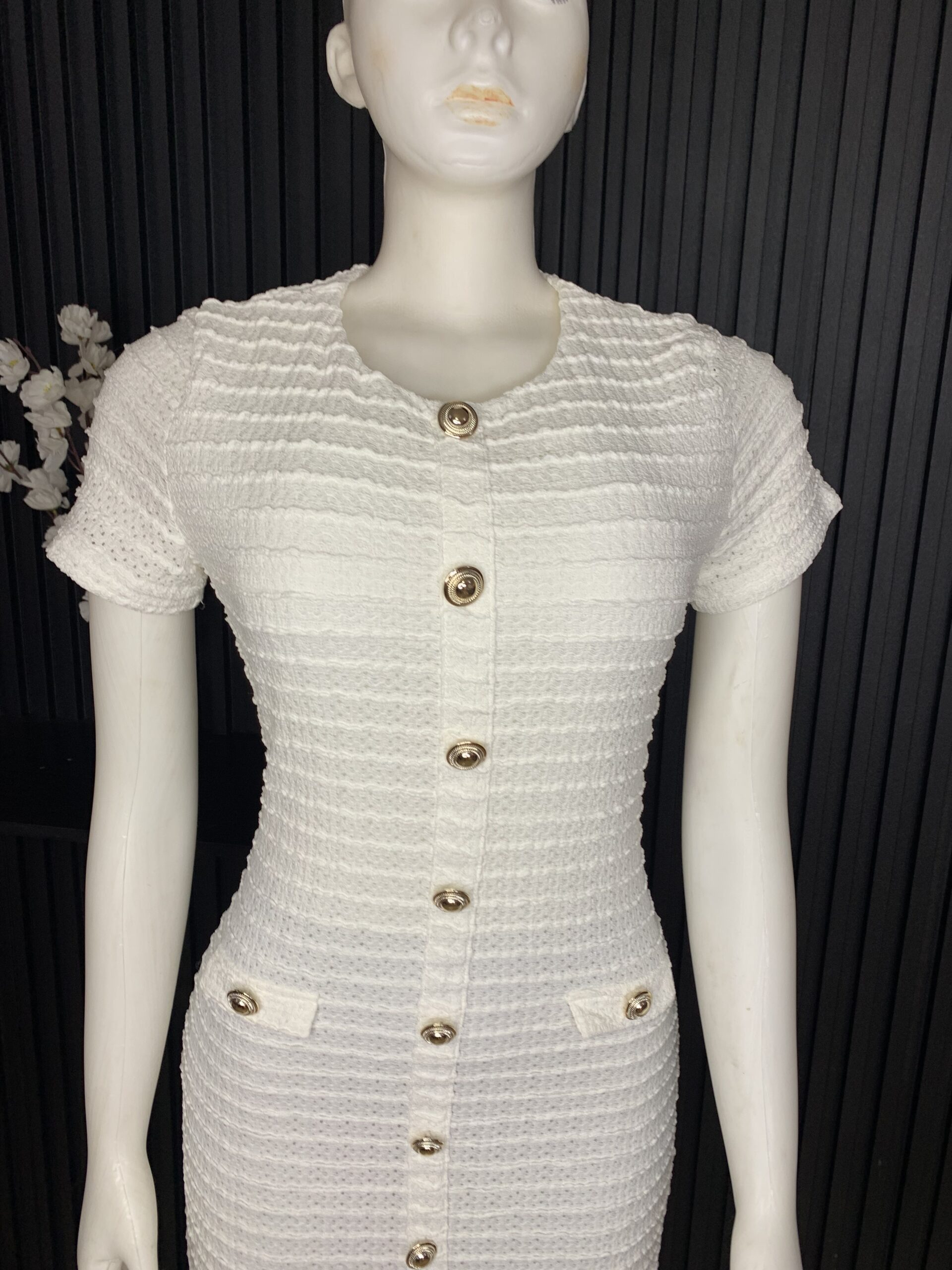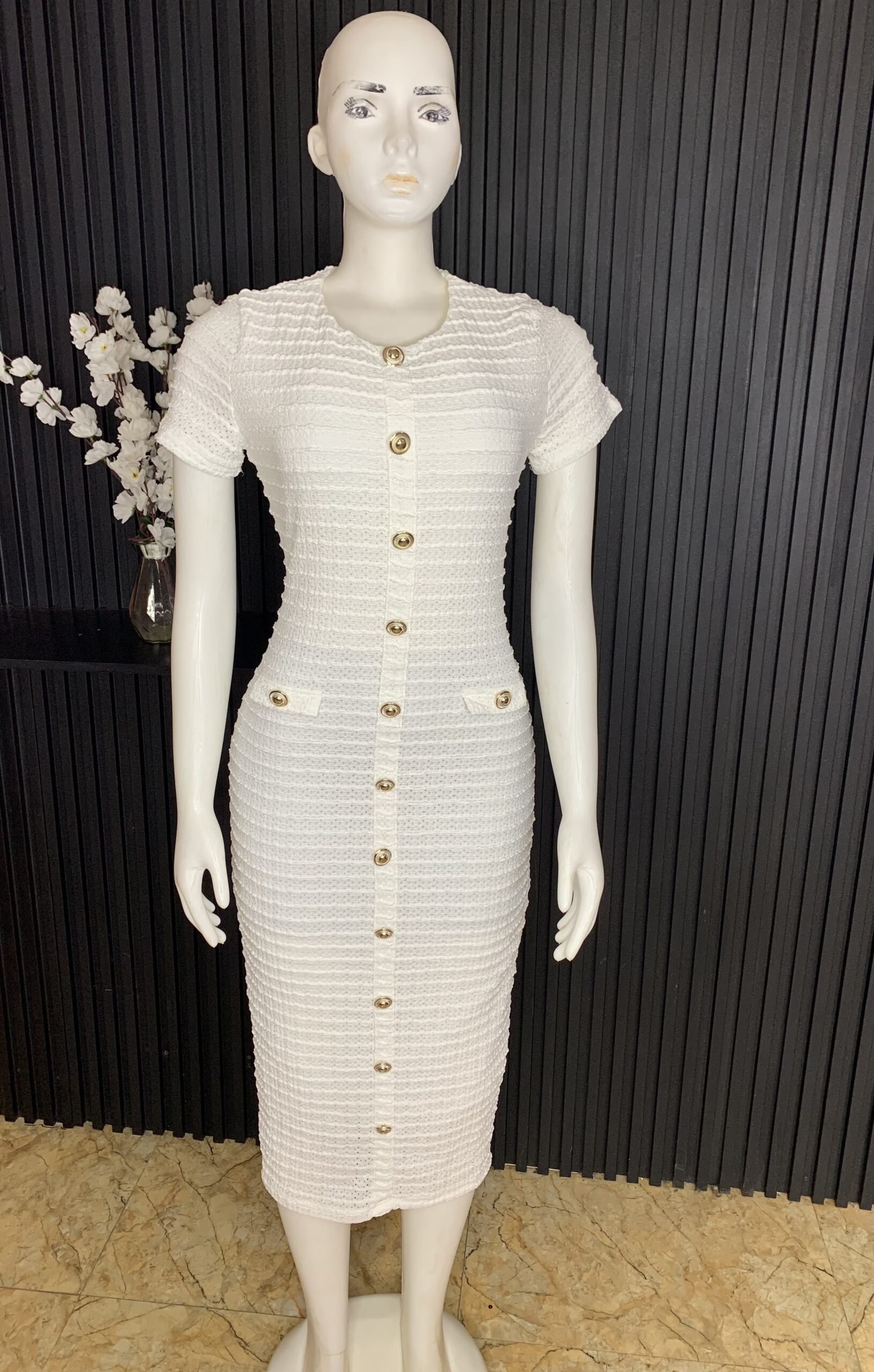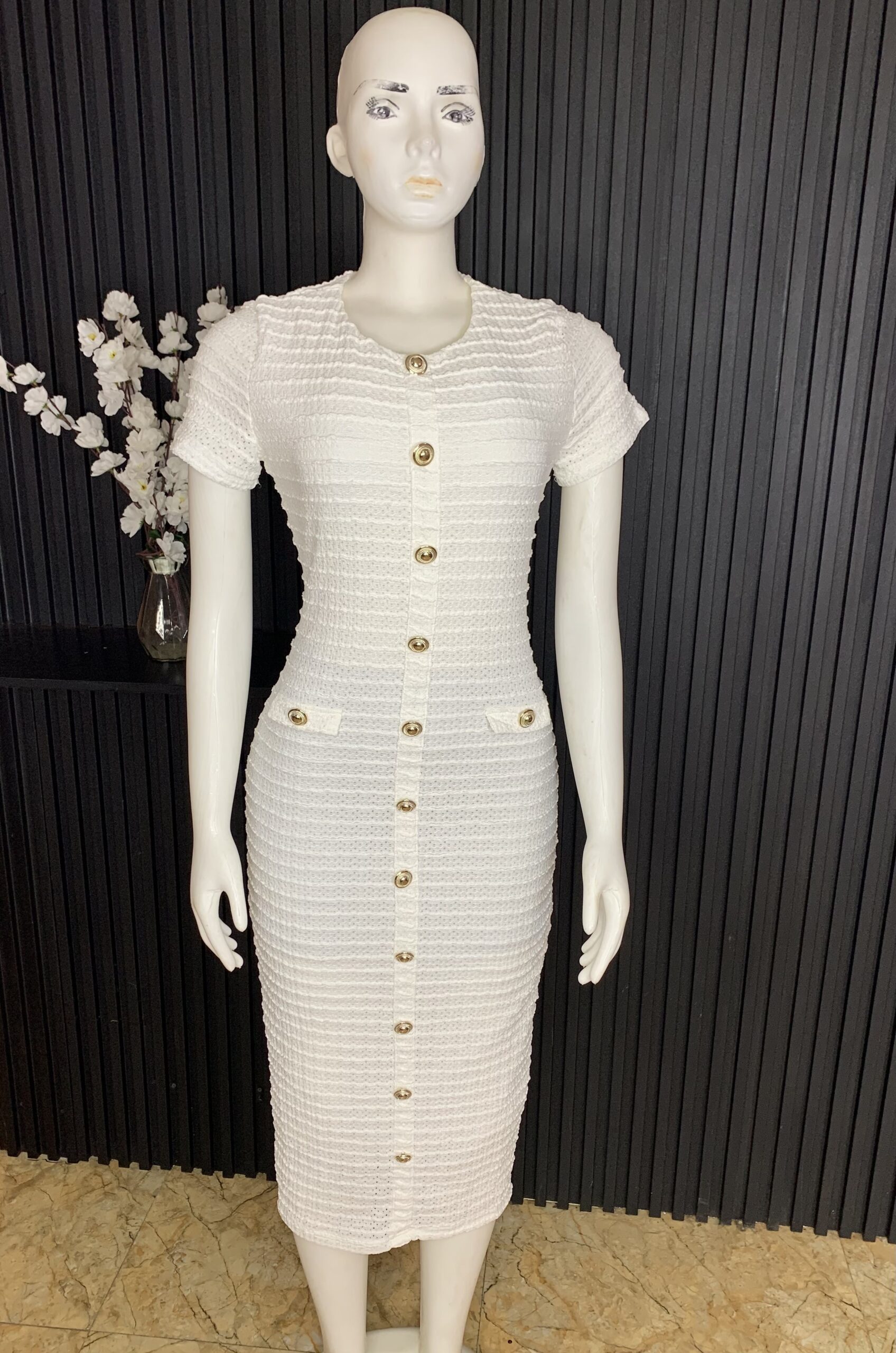 Elegant White Bodycon Dress Crafted With A Textured Knit Finish, Featuring A Round Neckline, Short Sleeves, And A Full Front Gold Button Detail. Designed To Hug The Figure With A Flattering Midi Length, It Offers A Chic, Polished Look Perfect For Both Casual And Dressy Occasions.