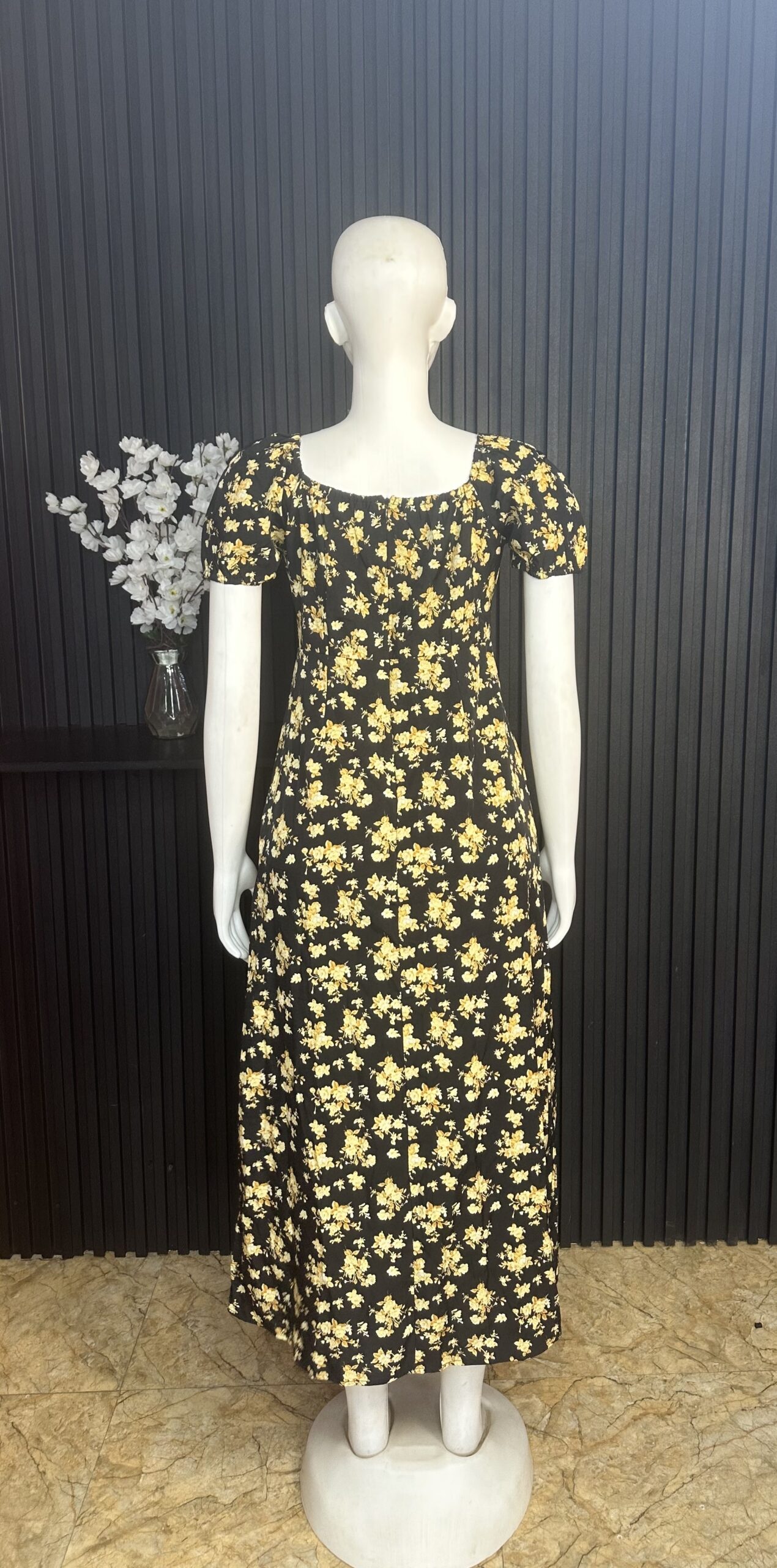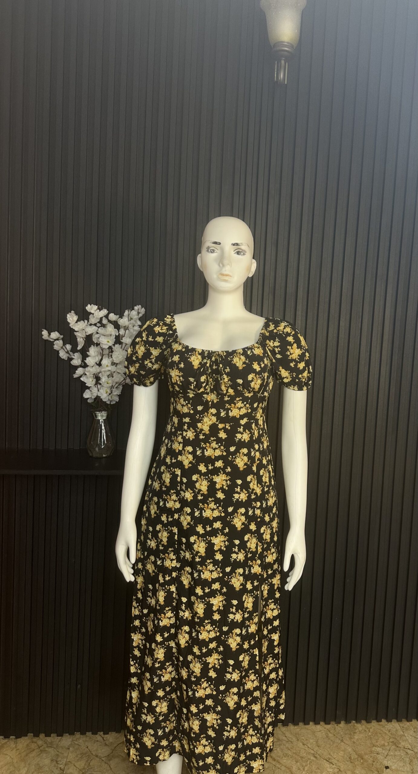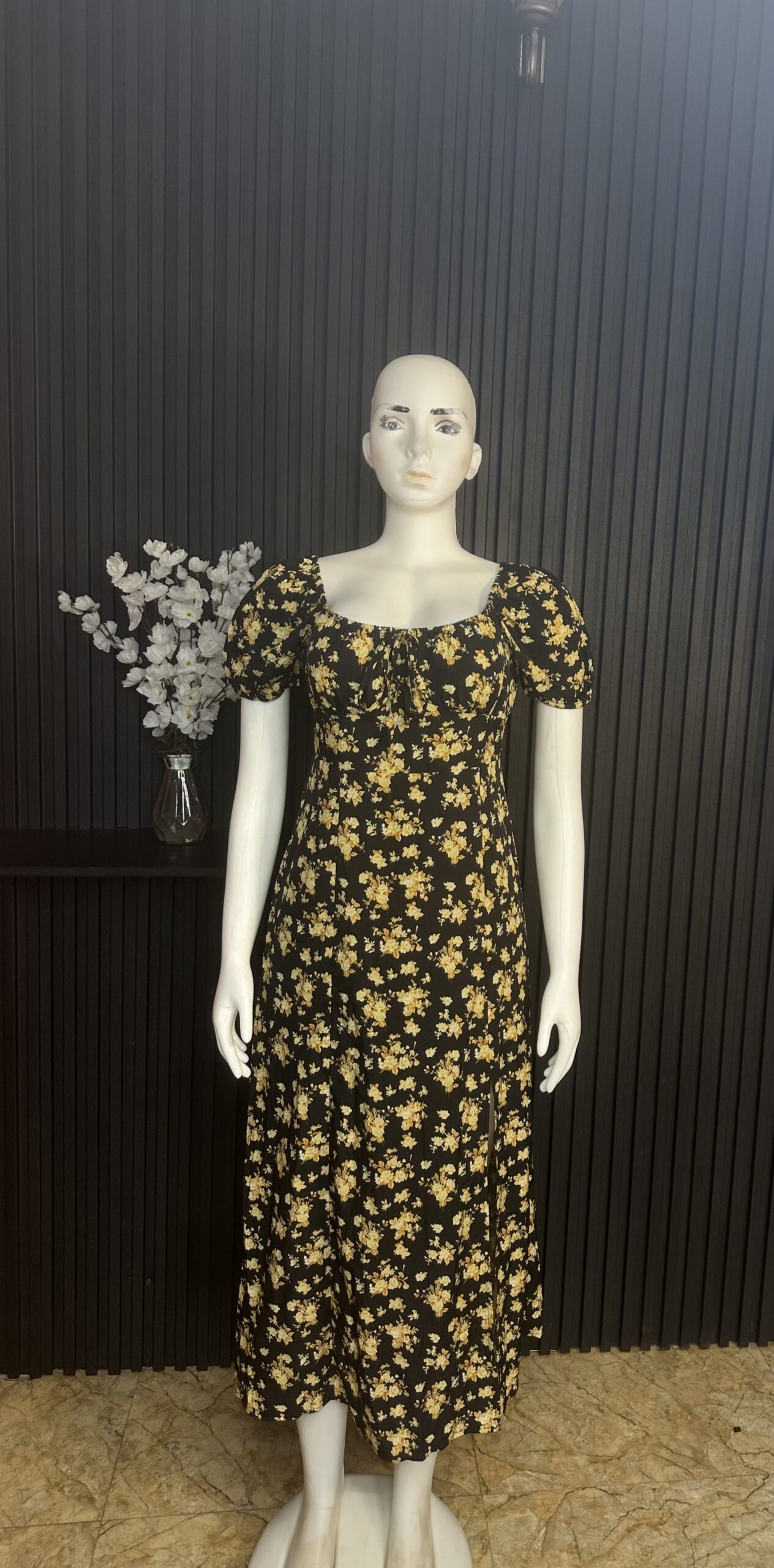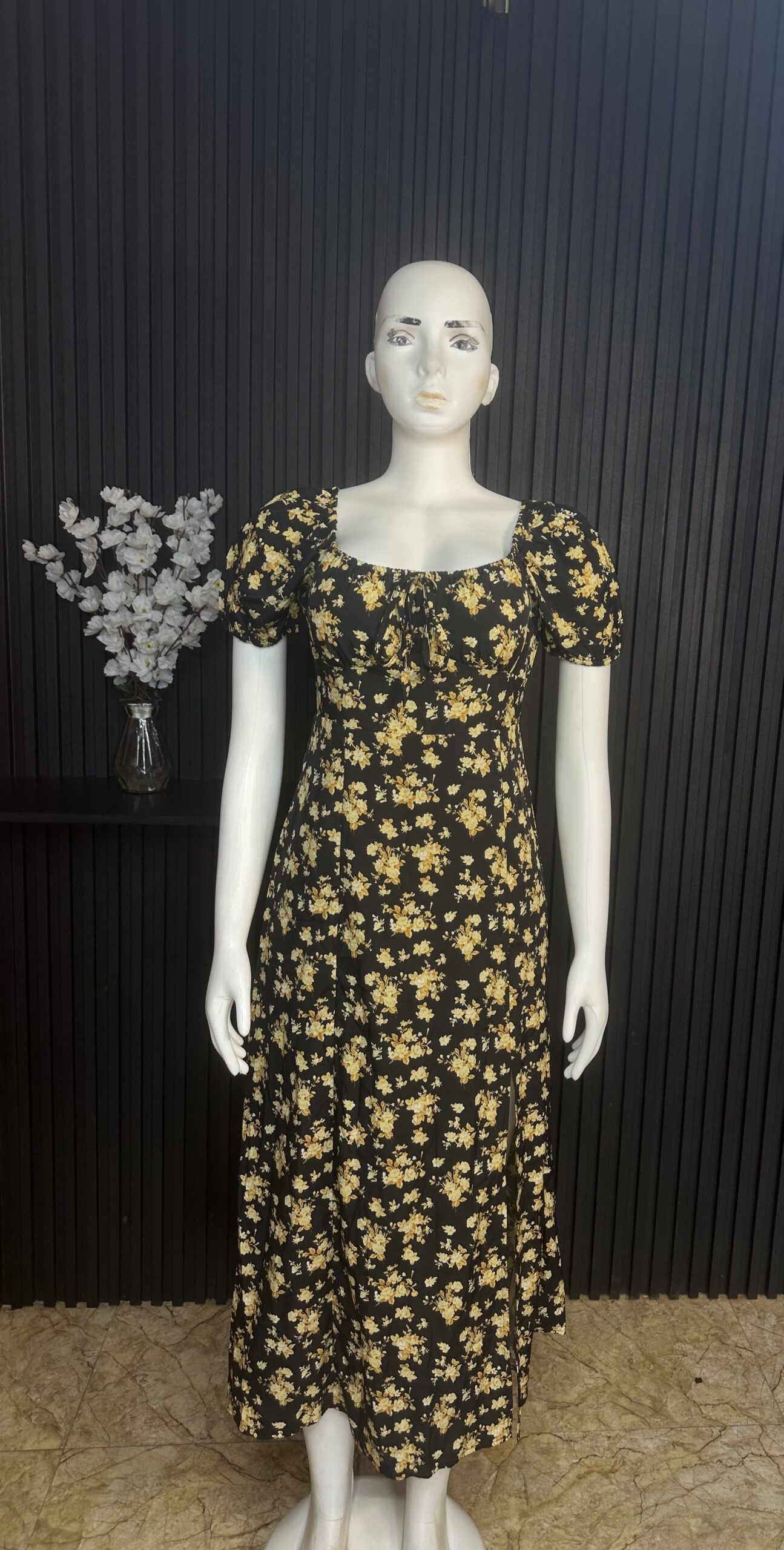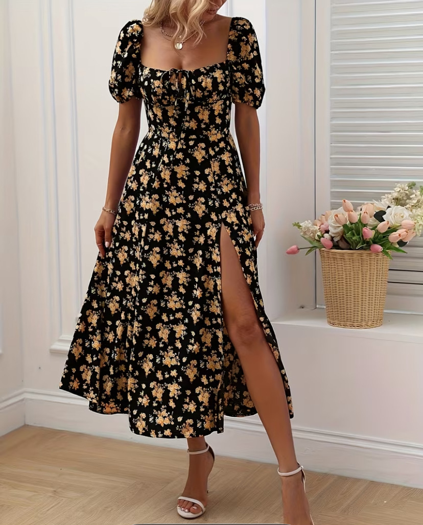 Stylish Long Women’s Dress Adorned with Floral Patterns And a Split Design, Featuring an A-Line Silhouette
