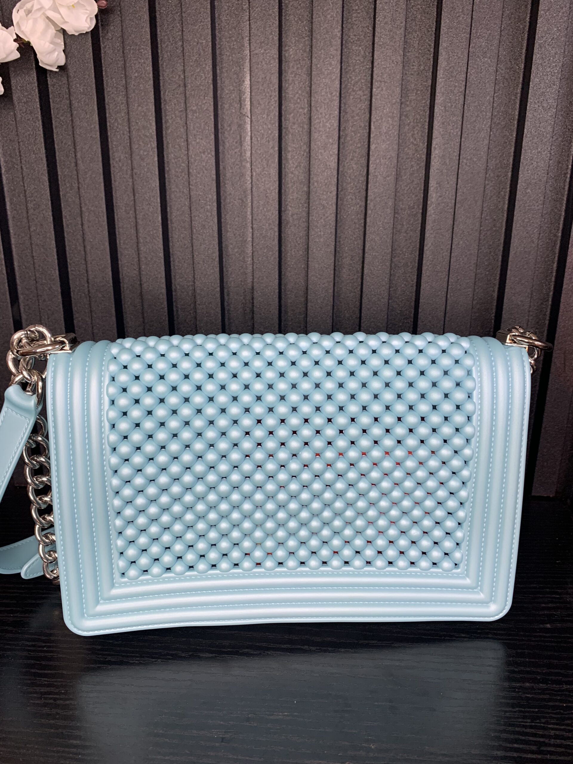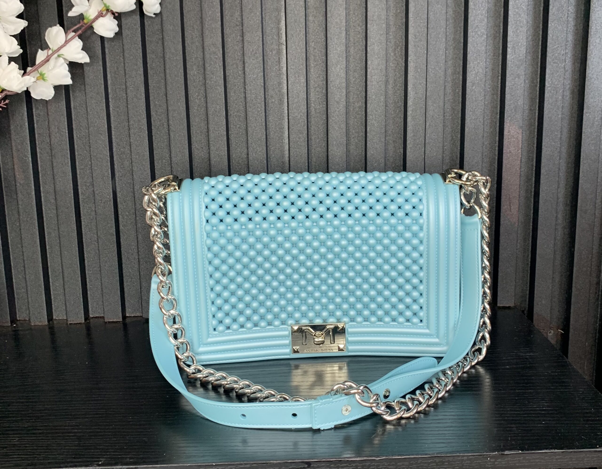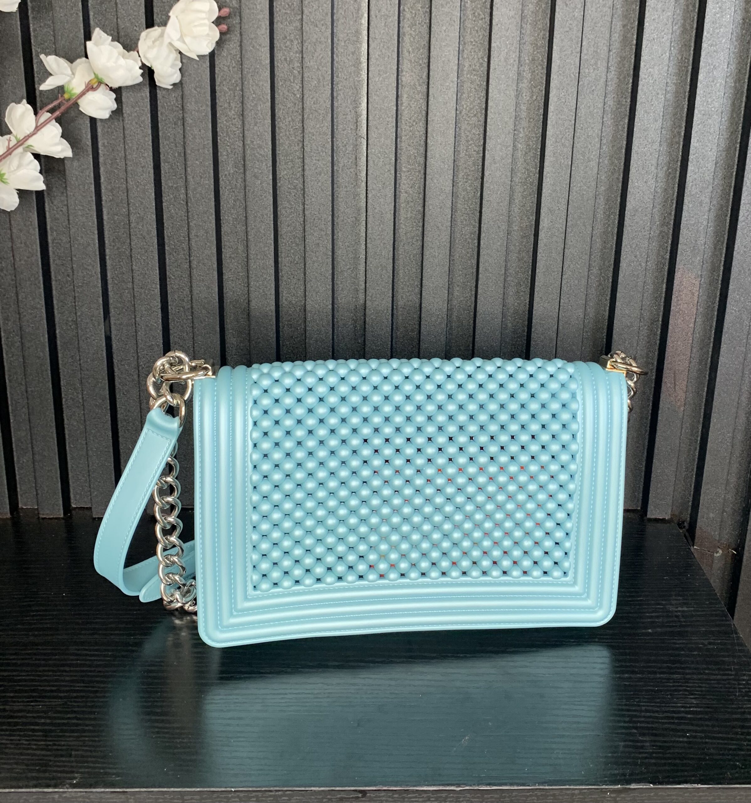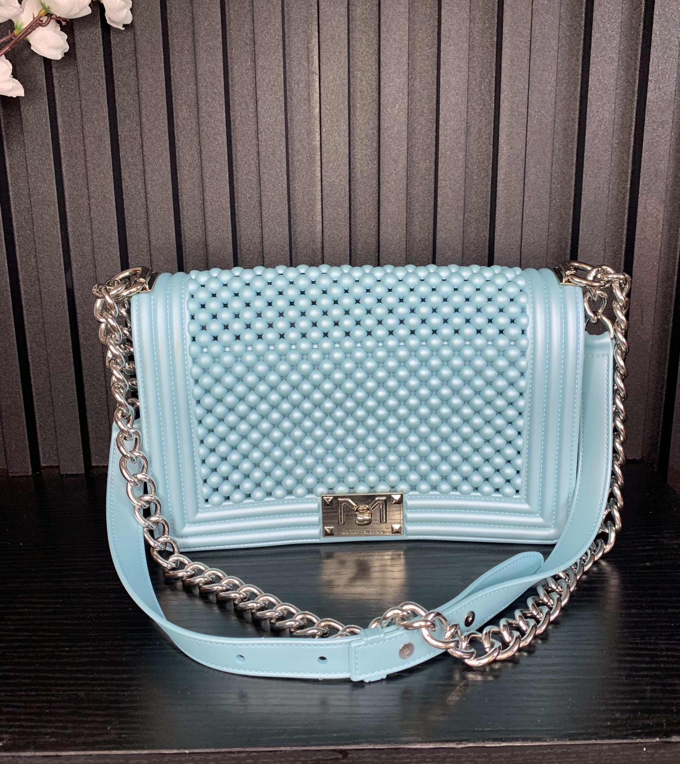 Premium Sky Blue Textured Shoulder Bag Designed For Elegant And Modern Styling. Features A Unique Beaded Front Panel That Adds Depth, Sophistication, And A Luxury Finish. Structured Silhouette With Smooth Layered Edges For A Polished Look, Paired With A Bold Silver-Tone Chain Strap For A Chic Statement. Comes With An Adjustable Leather Strap For Versatile Shoulder And Crossbody Wear. Secured With A Sleek Metallic Clasp Closure, Offering Both Style And Functionality. Perfect For Casual Outings, Events, And Everyday Luxury.