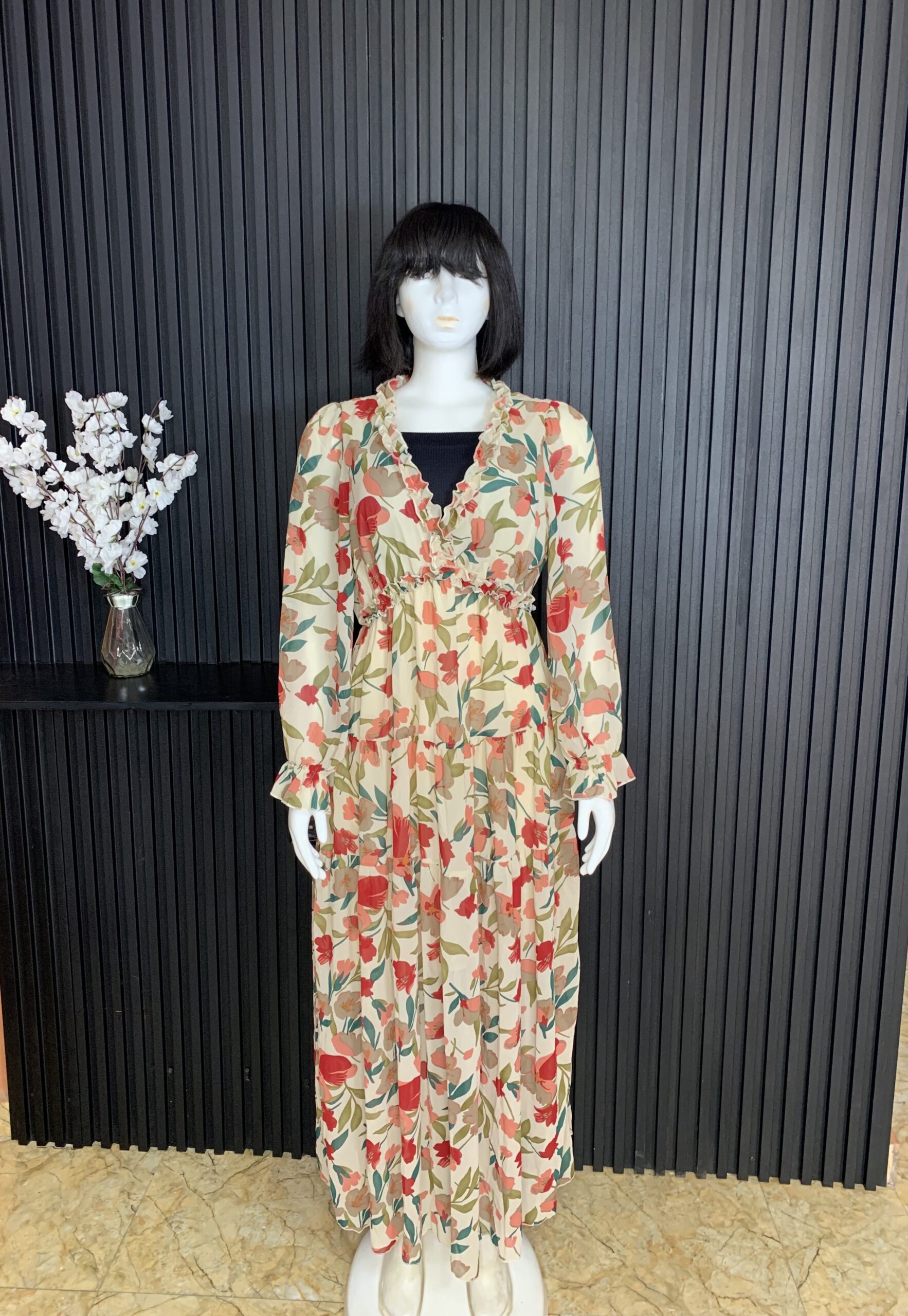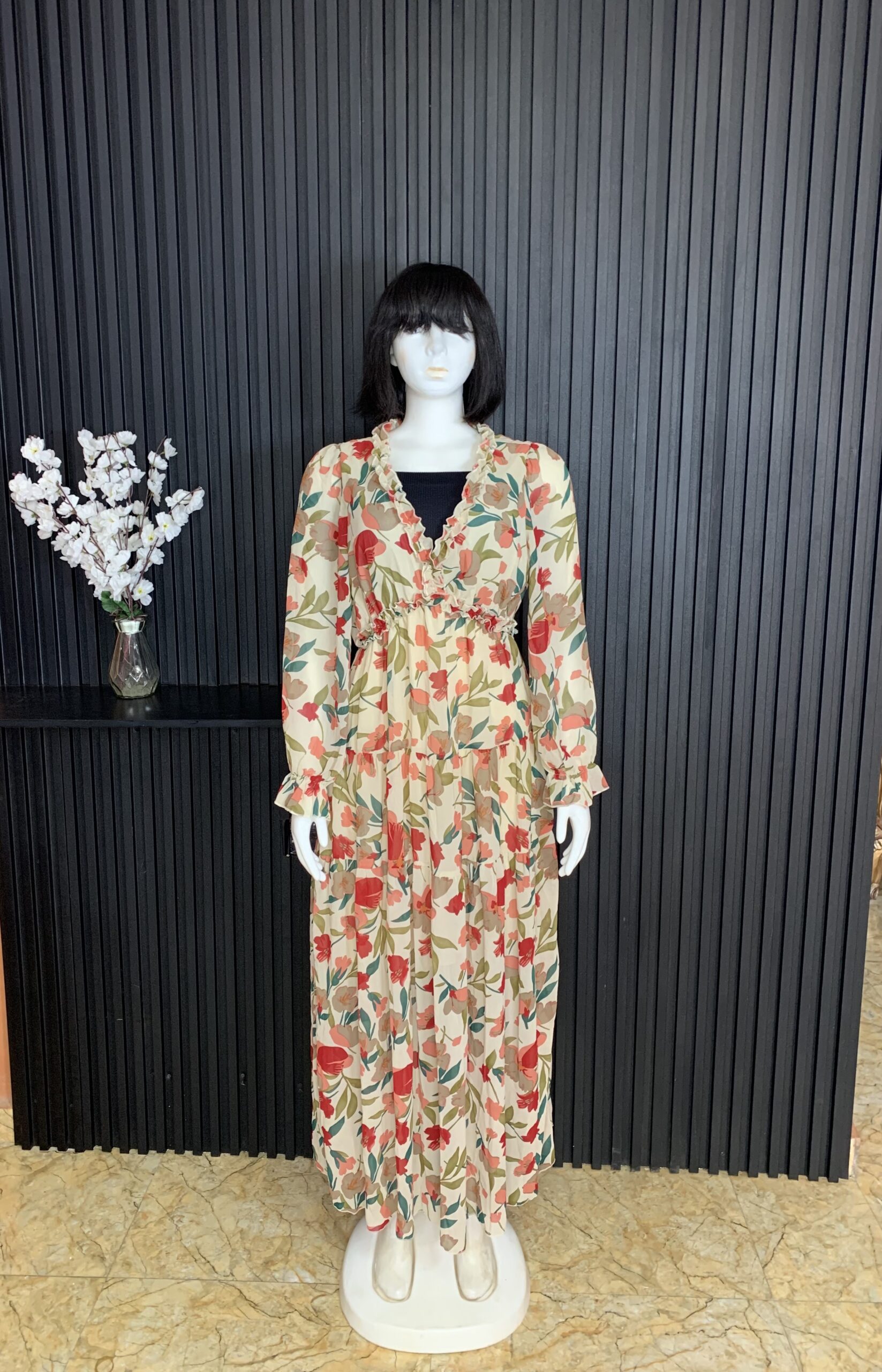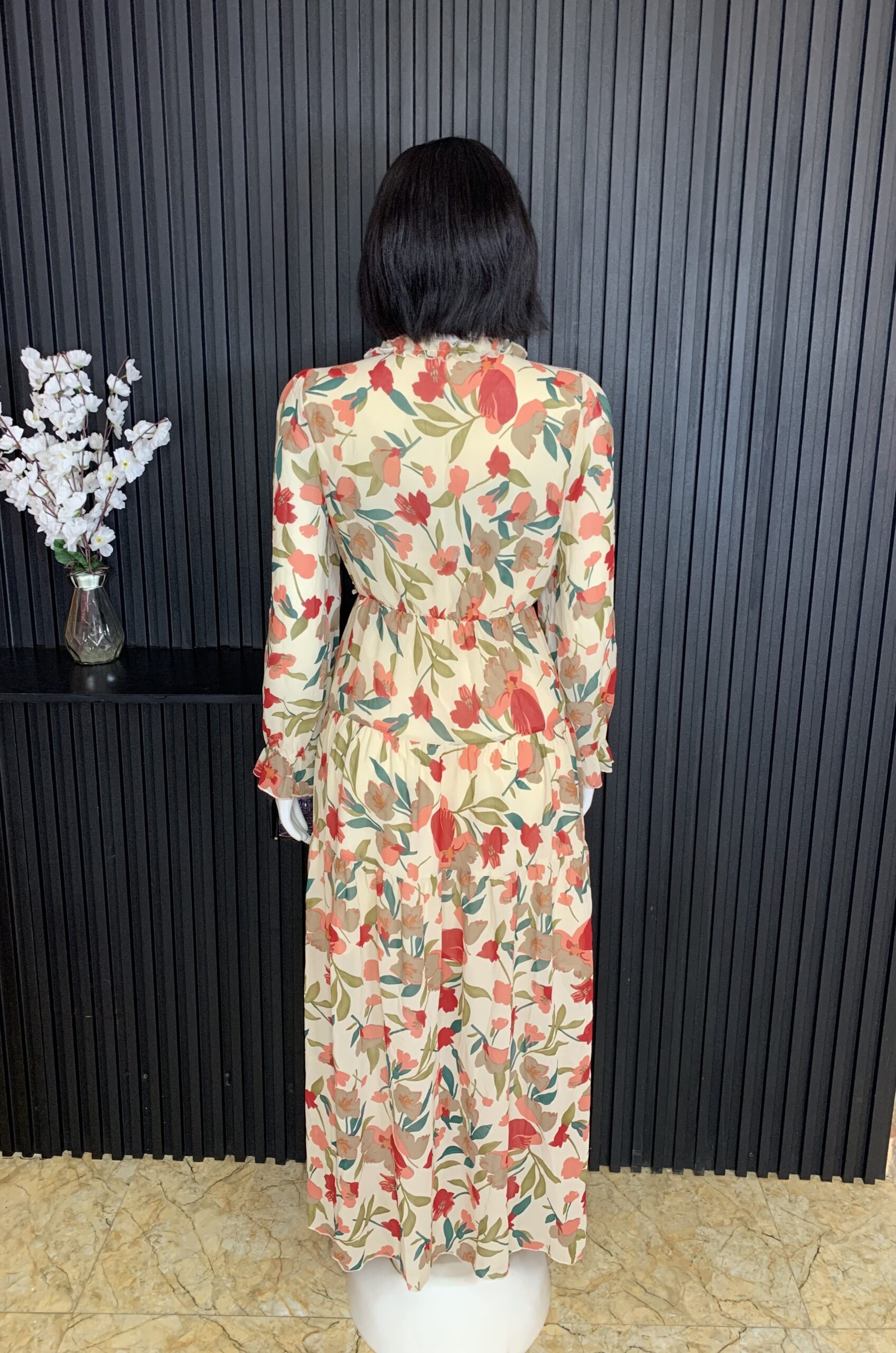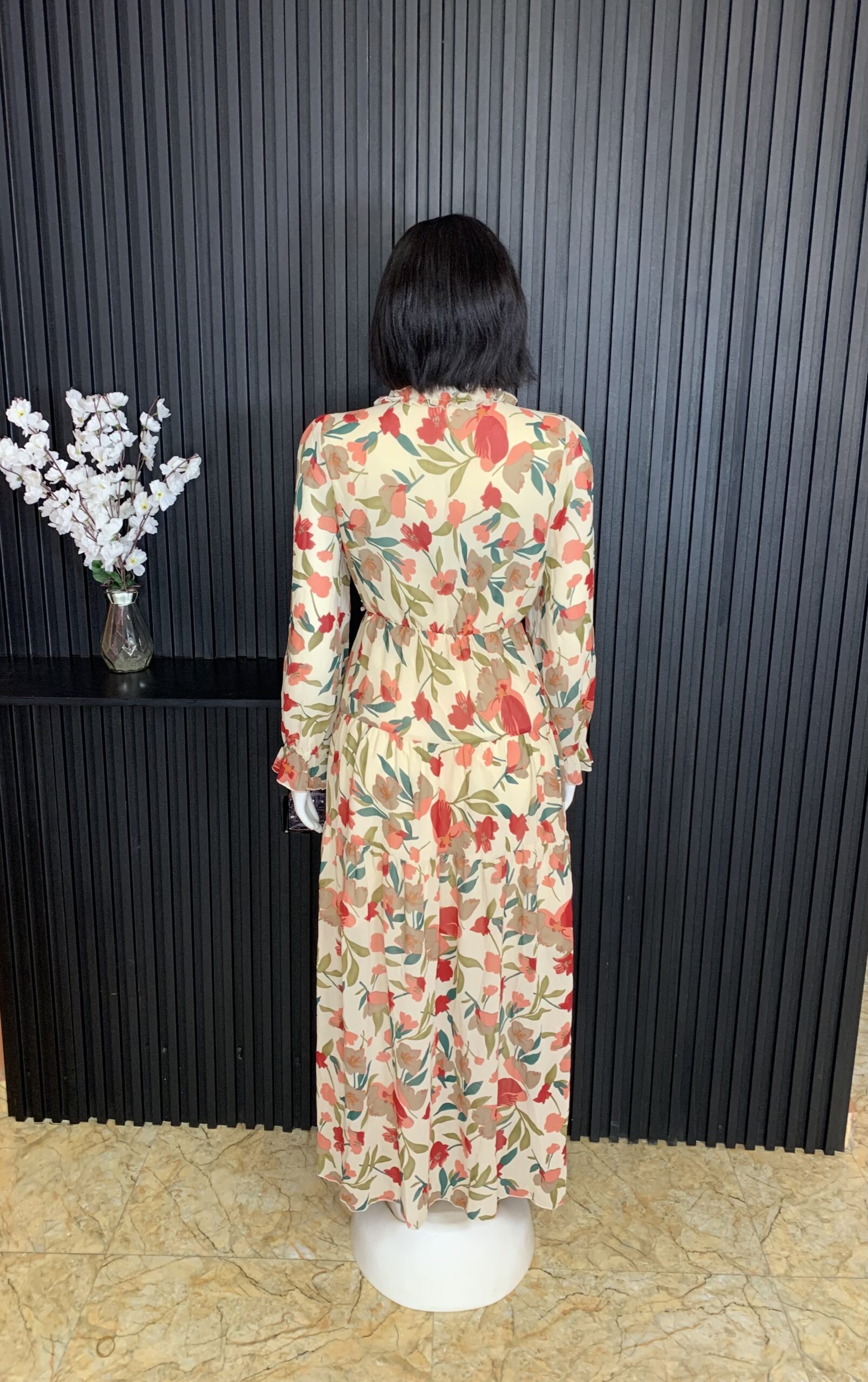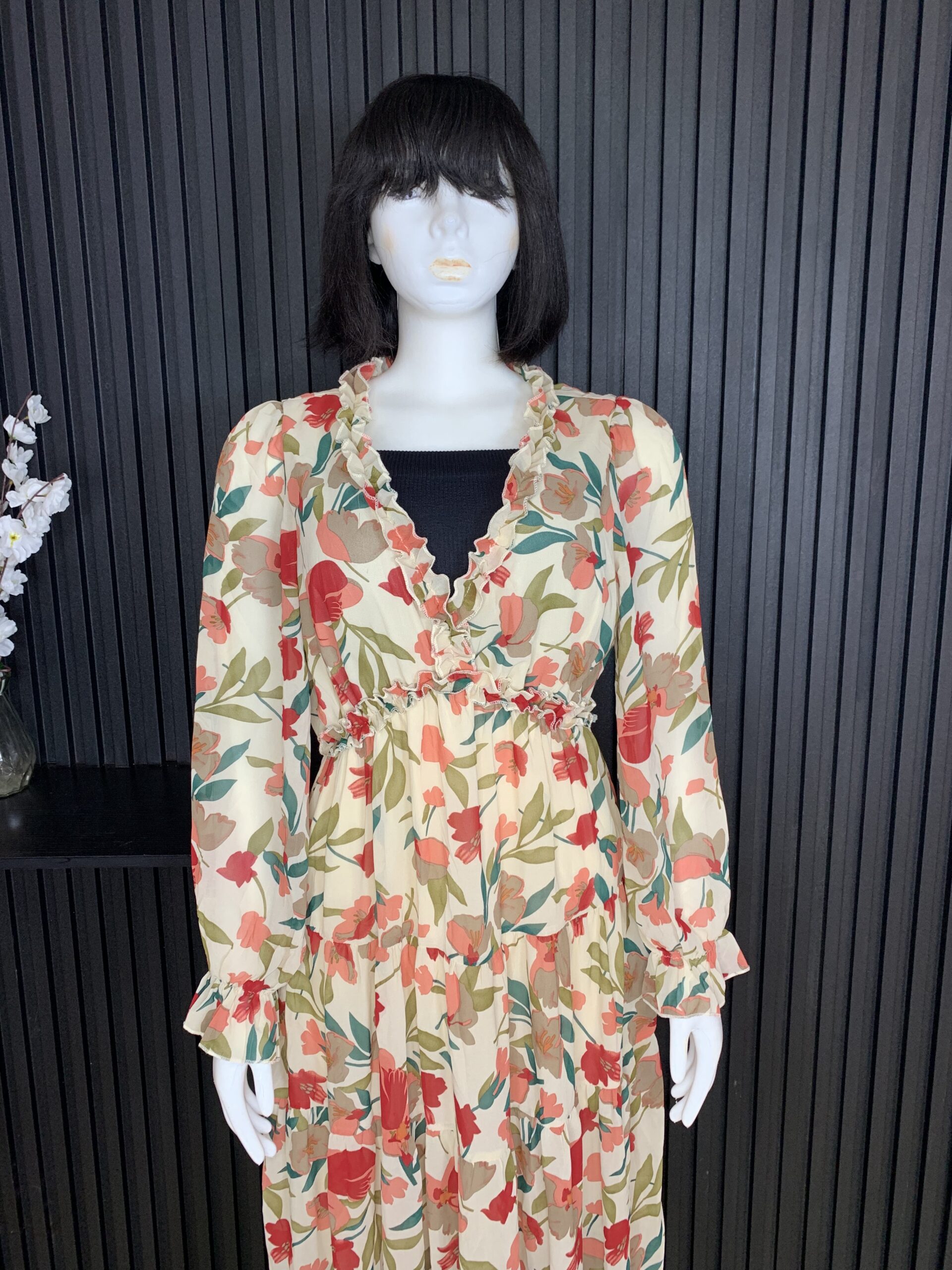 Elegant Floral Print Midi Dress Designed For Effortless Feminine Style. Features A Soft Flowing Fabric With A Beautiful Multicolor Floral Pattern That Adds A Fresh And Vibrant Look. Designed With A Flattering V-Neckline Accented With Delicate Ruffle Details For A Touch Of Romance. The Elastic Waistline Enhances Shape While Providing Comfort And A Perfect Fit. Long Sleeves With Ruffled Cuffs Add A Stylish And Graceful Finish, While The Layered Hemline Creates A Flowy, Flattering Silhouette. Perfect For Casual Outings, Brunch Dates, And Special Occasions.