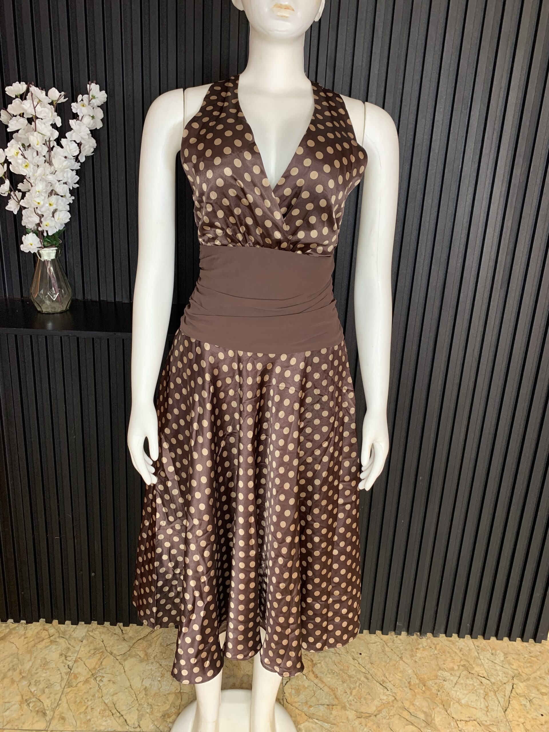 Women’s Polka Dot Halter Neck Dress is a stylish and elegant outfit designed for a flattering feminine look. It features a fitted waist and flowing skirt.