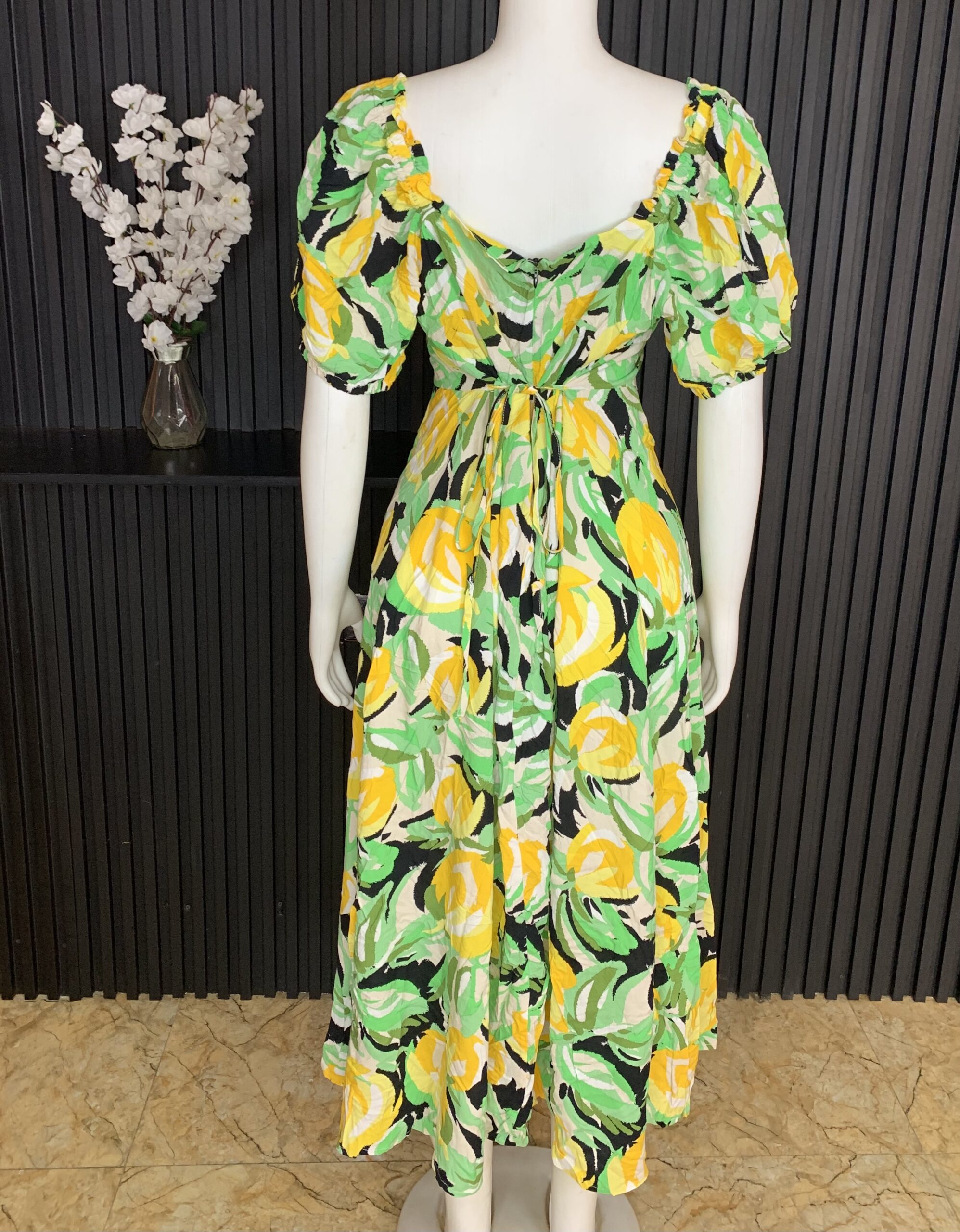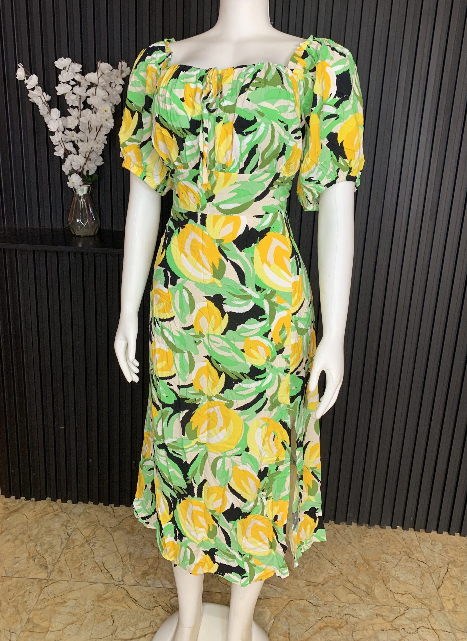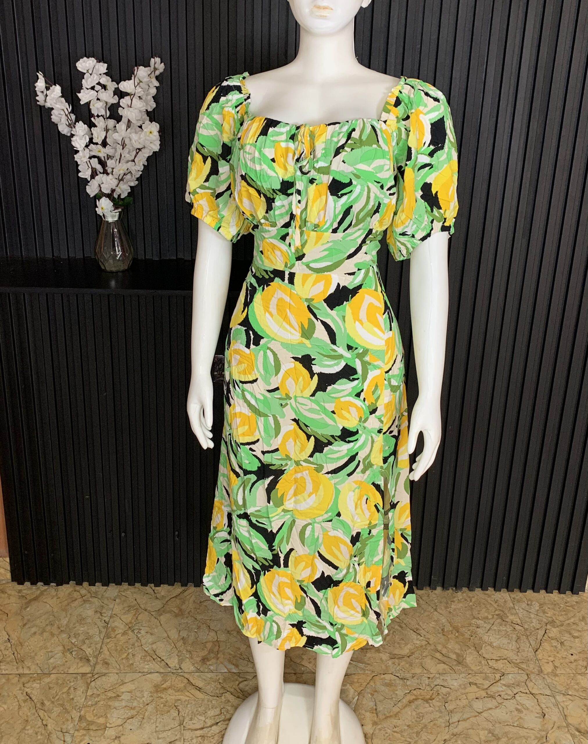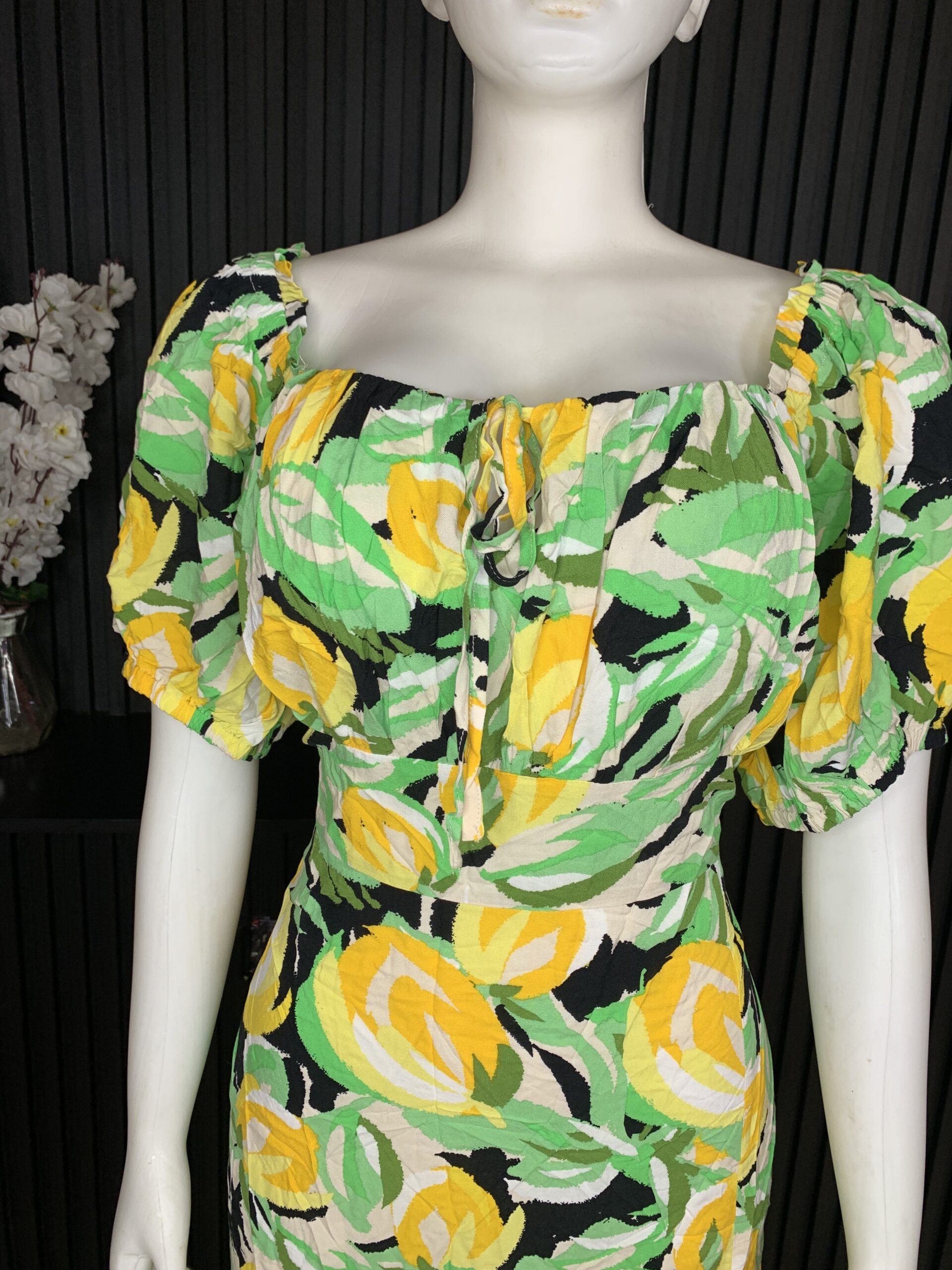 Elegant Floral Print Dress Features A Fresh And Vibrant Blend Of Green, Yellow, Black, And Cream Tones, Creating A Bold Yet Feminine Statement. Designed With A Soft Gathered Square Neckline And Adjustable Front Tie Detail, It Offers A Flattering And Customizable Fit Around The Bust. The Short Puff Sleeves Add Volume And Charm, Giving The Dress A Romantic, Stylish Appeal. The Fitted Bodice Seamlessly Flows Into A Body Hugging Silhouette That Enhances Natural Curves While Maintaining Comfort.