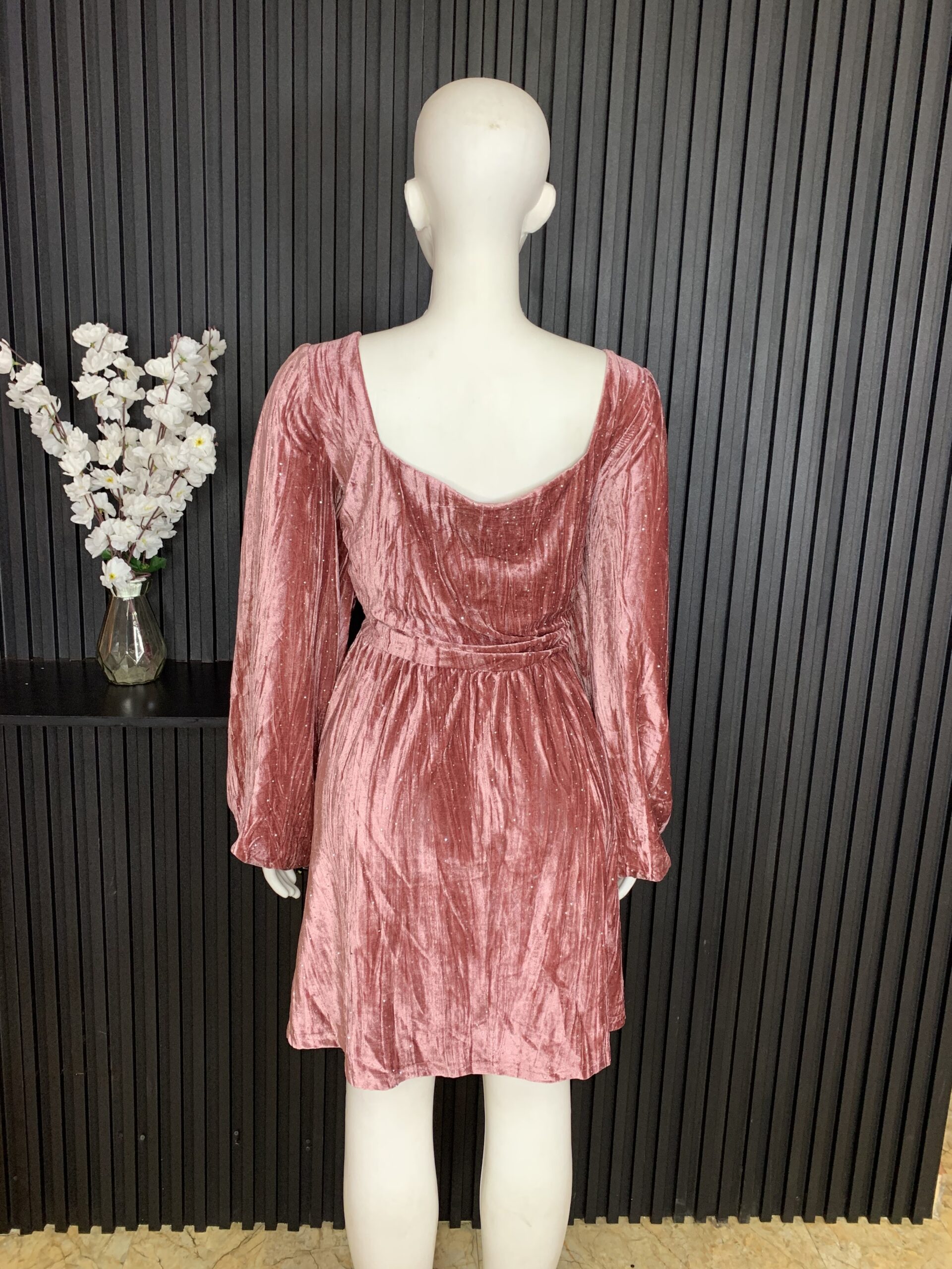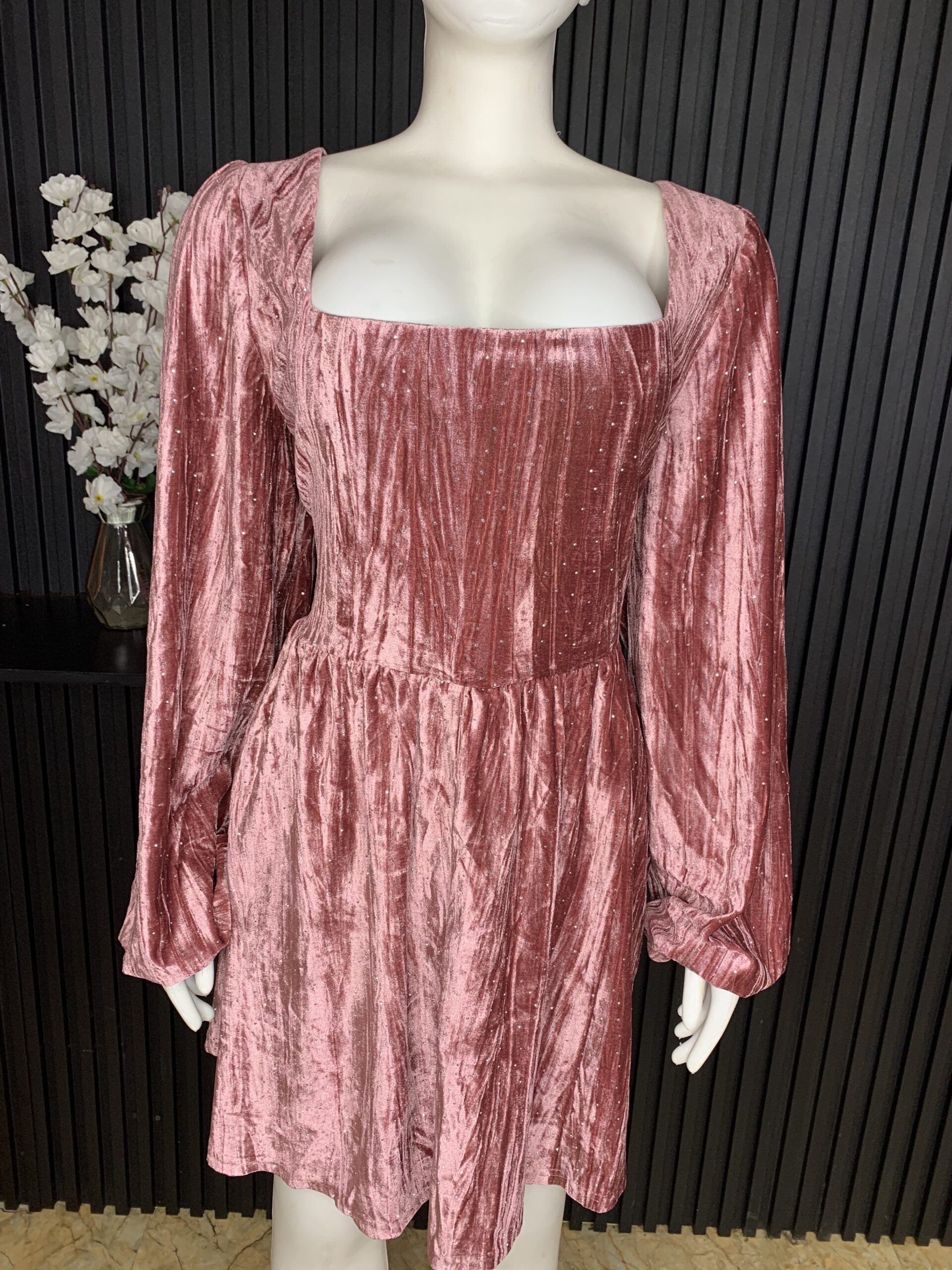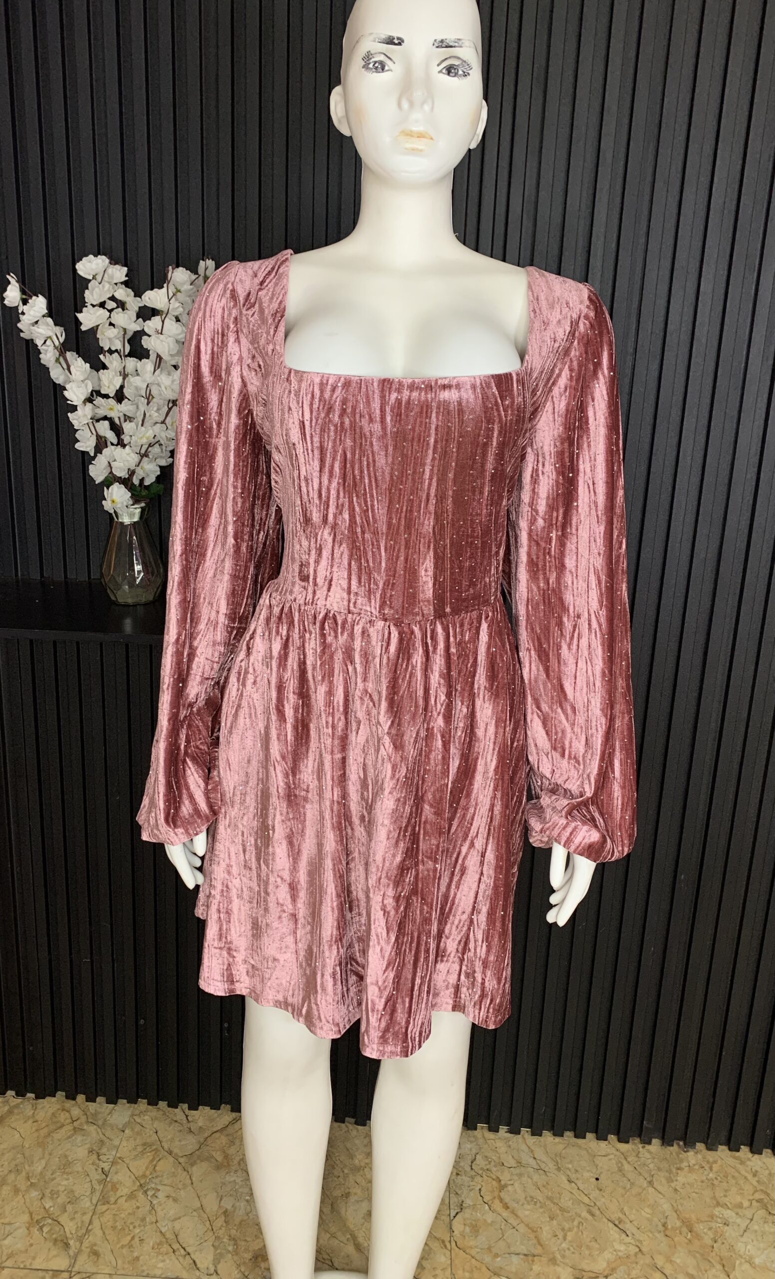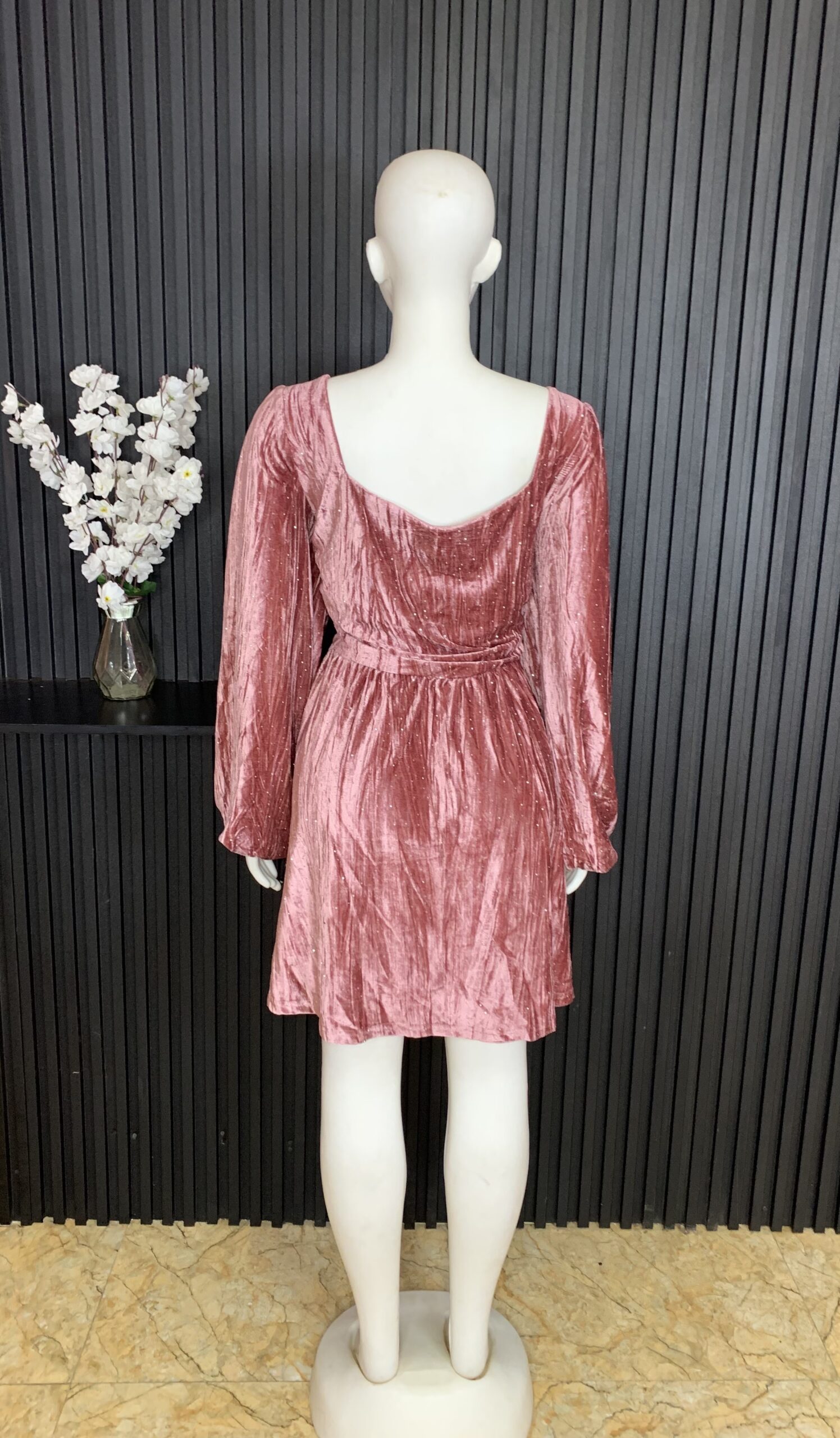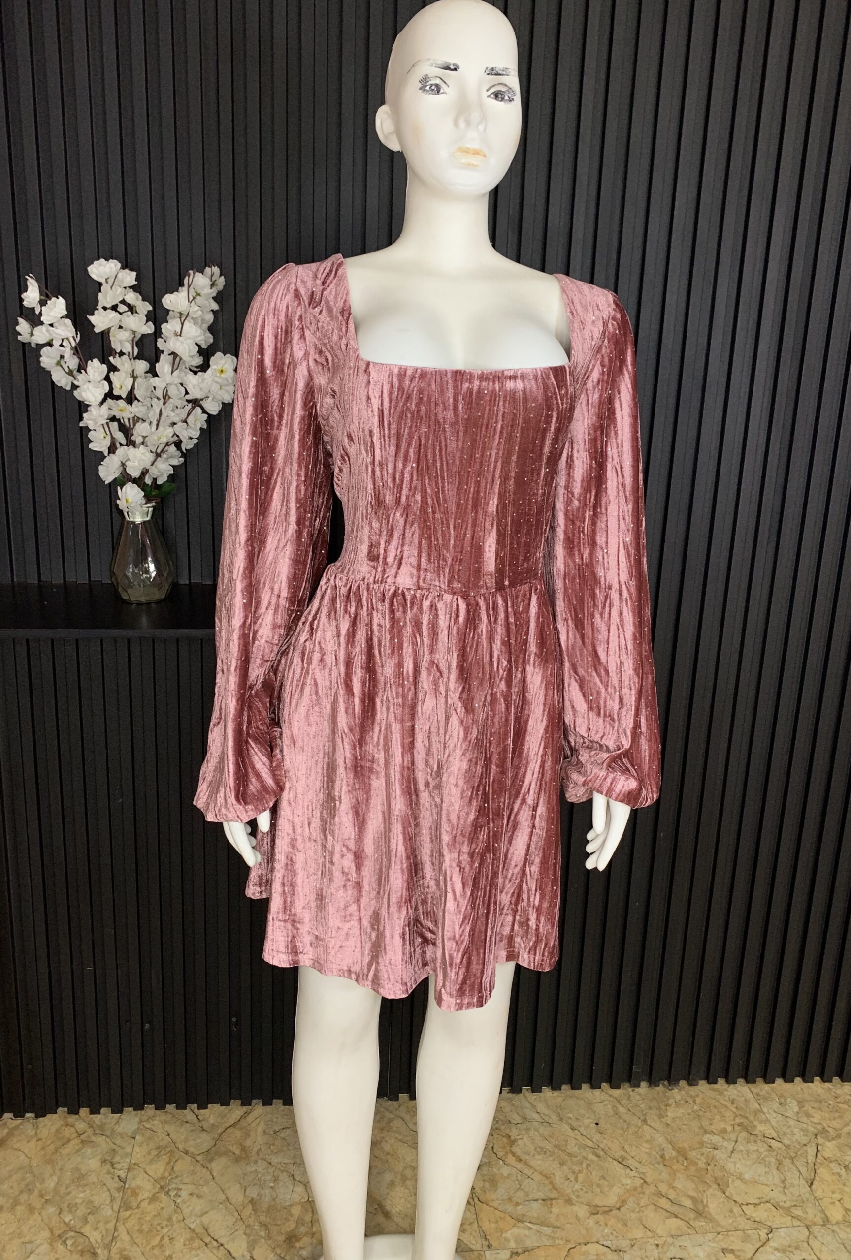 Elegant Pink Velvet Mini Dress Designed With A Soft Shimmer Finish That Adds A Touch Of Glamour. Features A Flattering Square Neckline And Fitted Bodice That Flows Into A Relaxed, Slightly Flared Skirt For A Feminine Silhouette. The Long Sleeves With Subtle Puff Detail Enhance Its Chic And Sophisticated Appeal. Perfect For Evenings, Parties, Or Special Occasions.