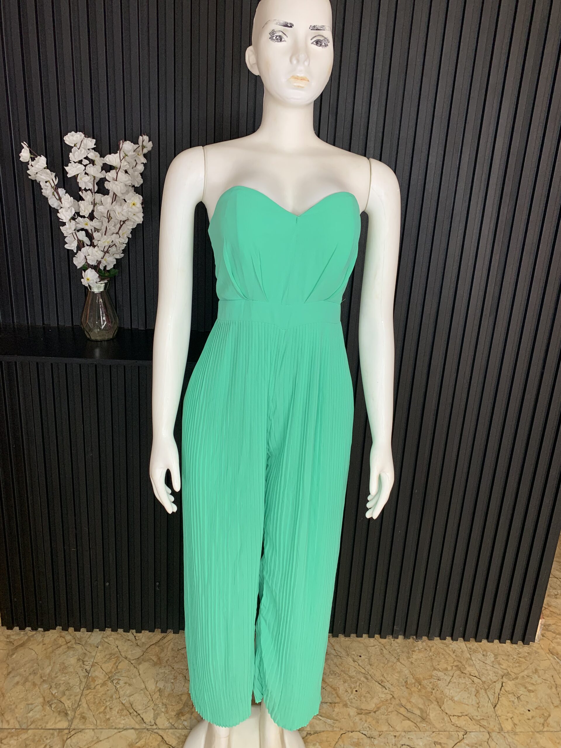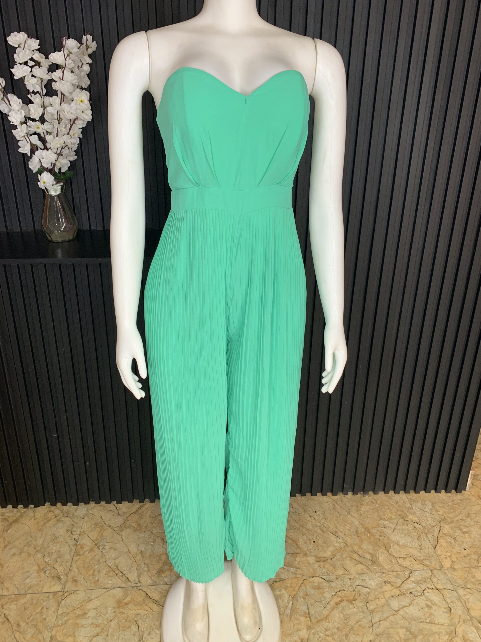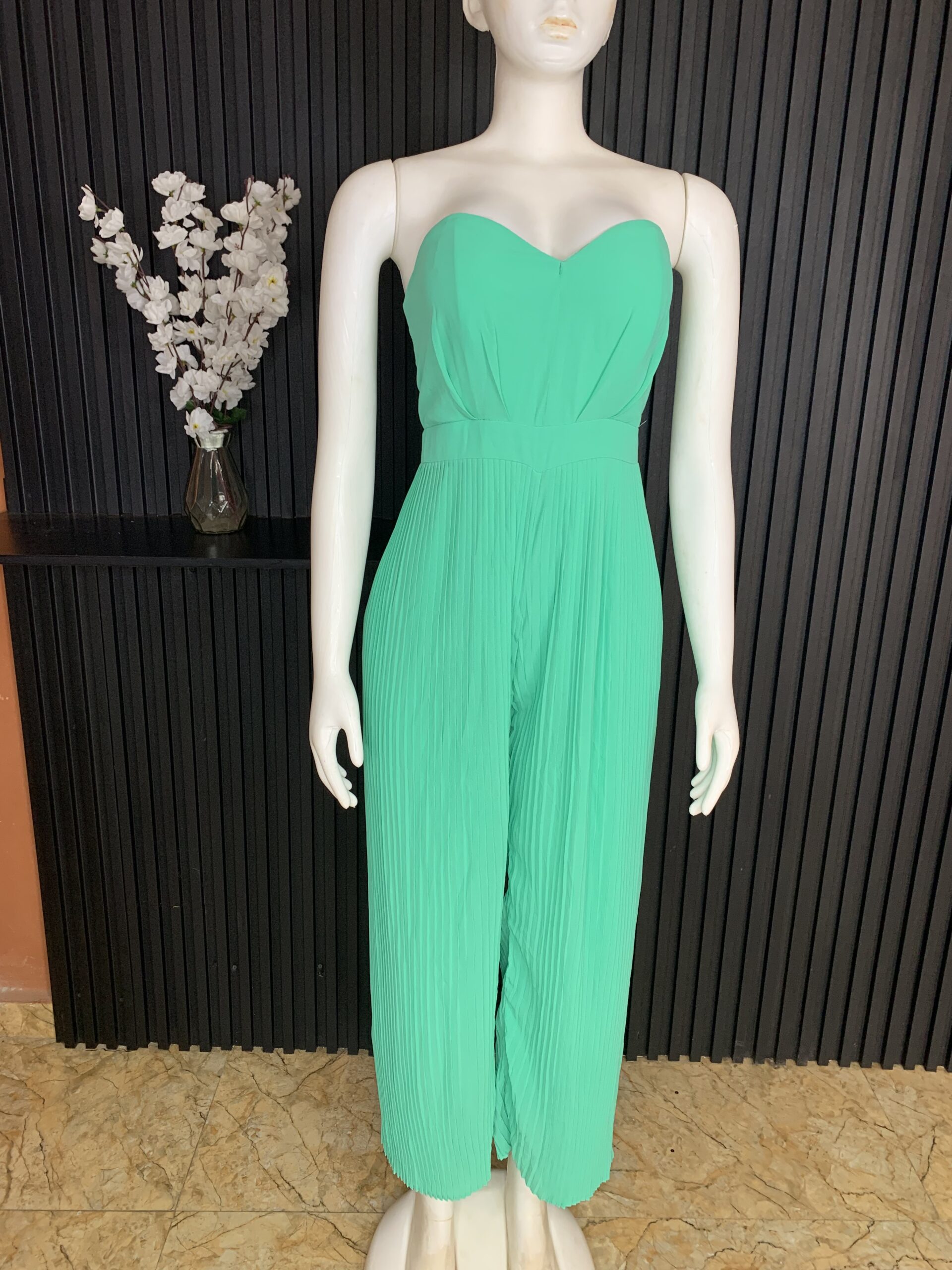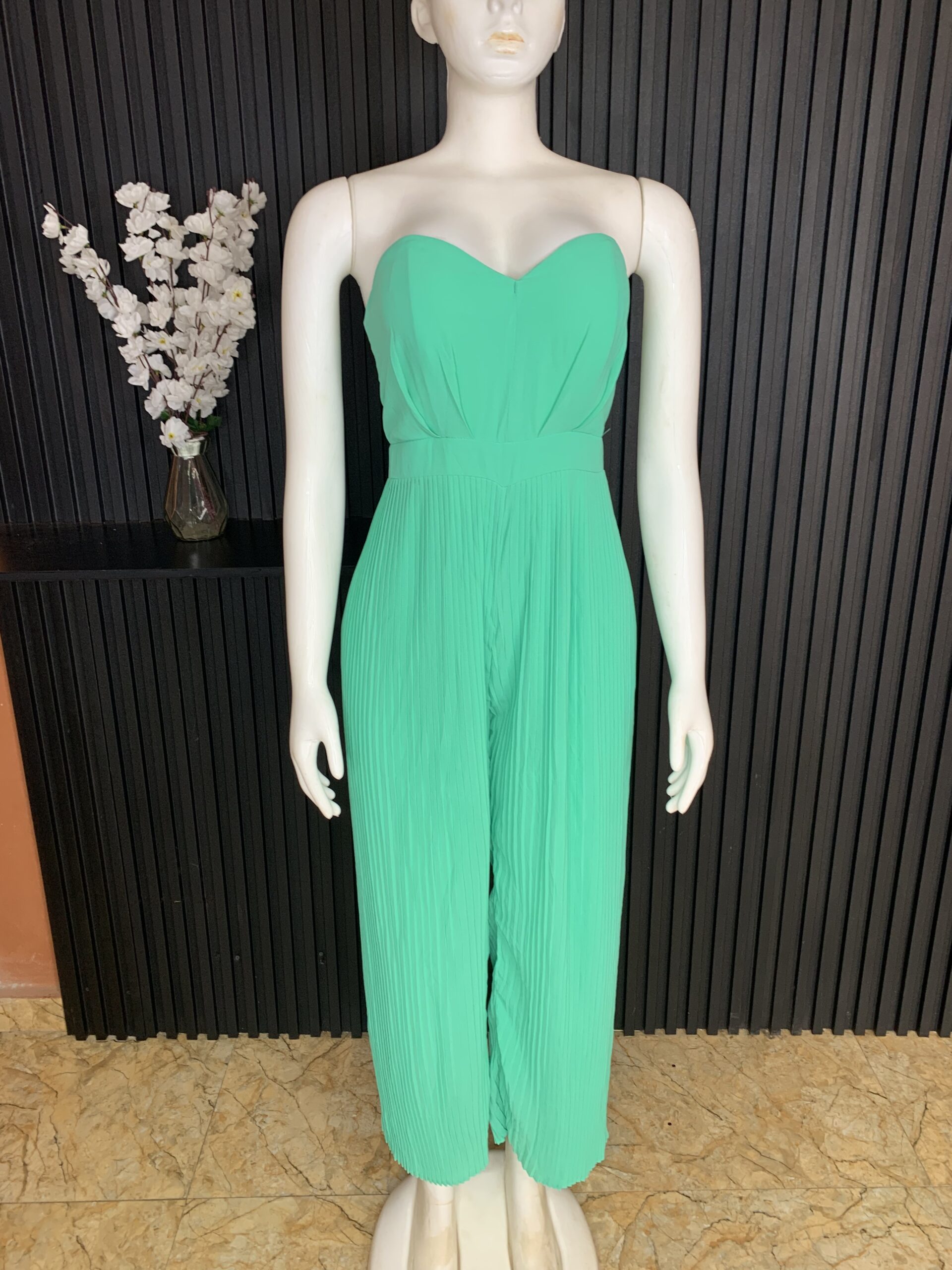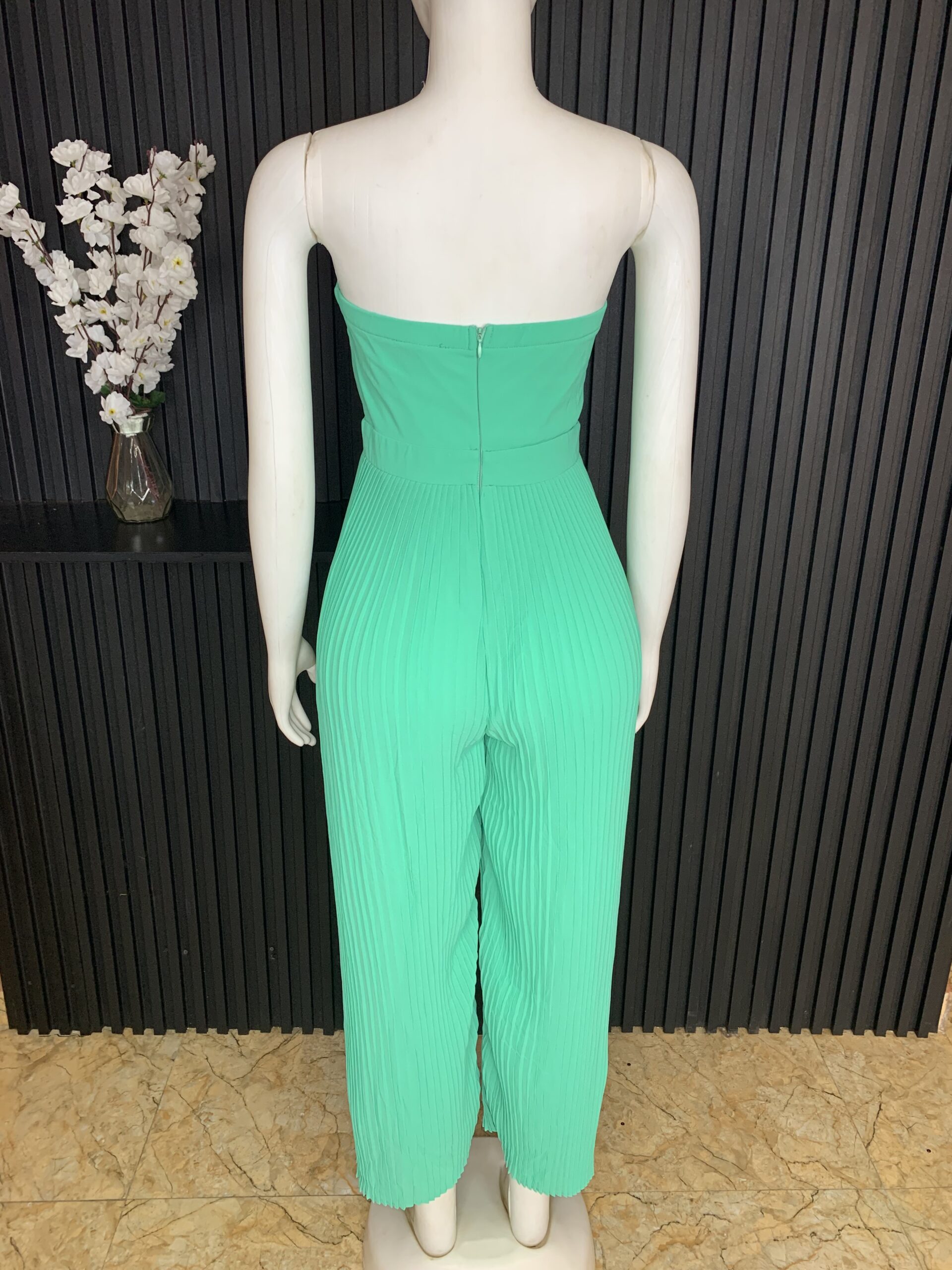 Stunning Emerald Green Pleated Jumpsuit Designed To Deliver A Sleek And Effortlessly Elegant Look. Features A Flattering Strapless Sweetheart Neckline That Enhances The Bust, Paired With A Fitted Waist That Flows Into Soft, Wide-Leg Pleated Trousers For A Graceful Silhouette. Lightweight And Stylish, Perfect For Statement Looks At Events Or Evenings Out.