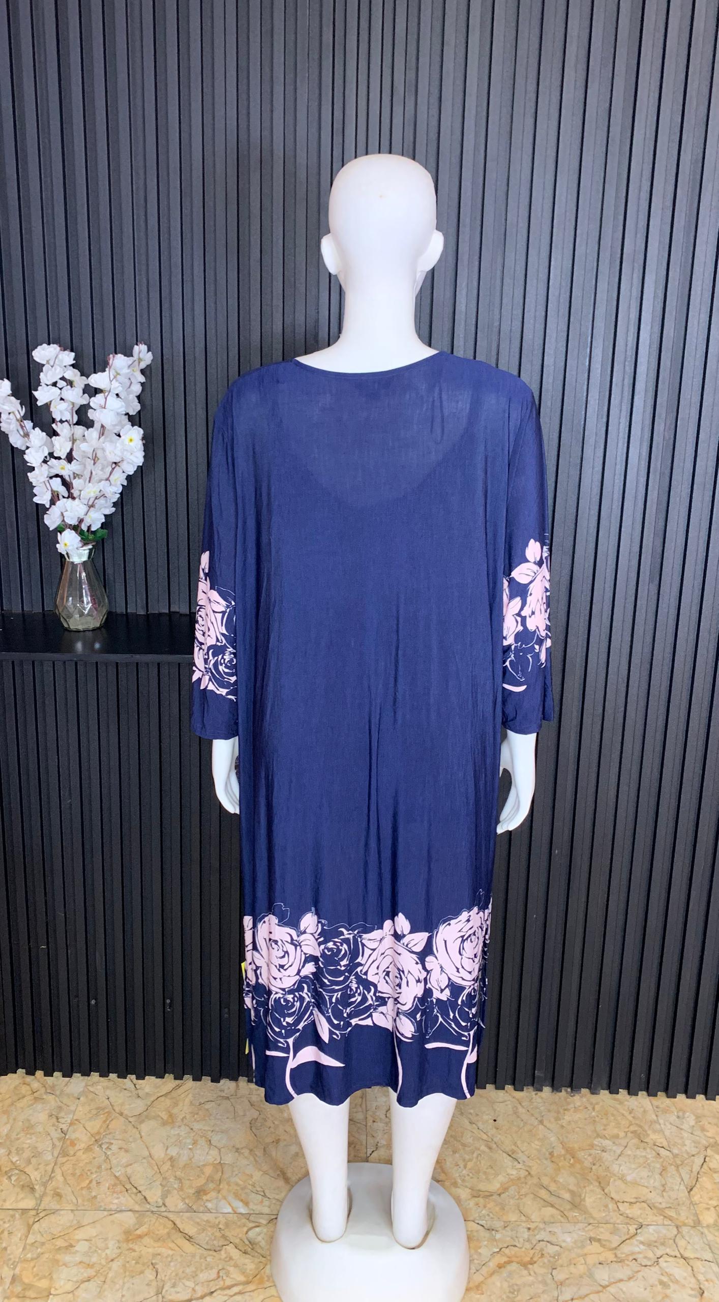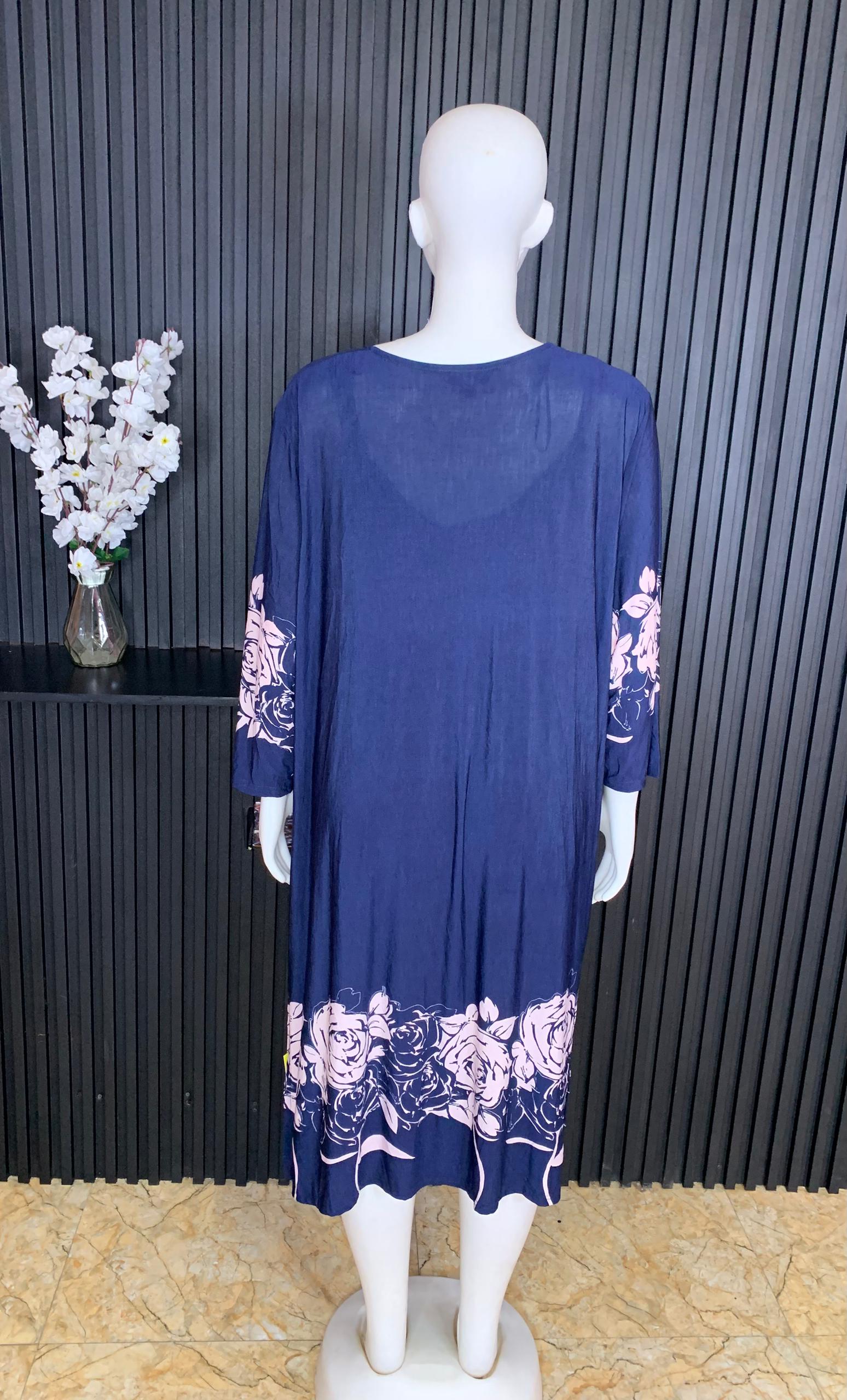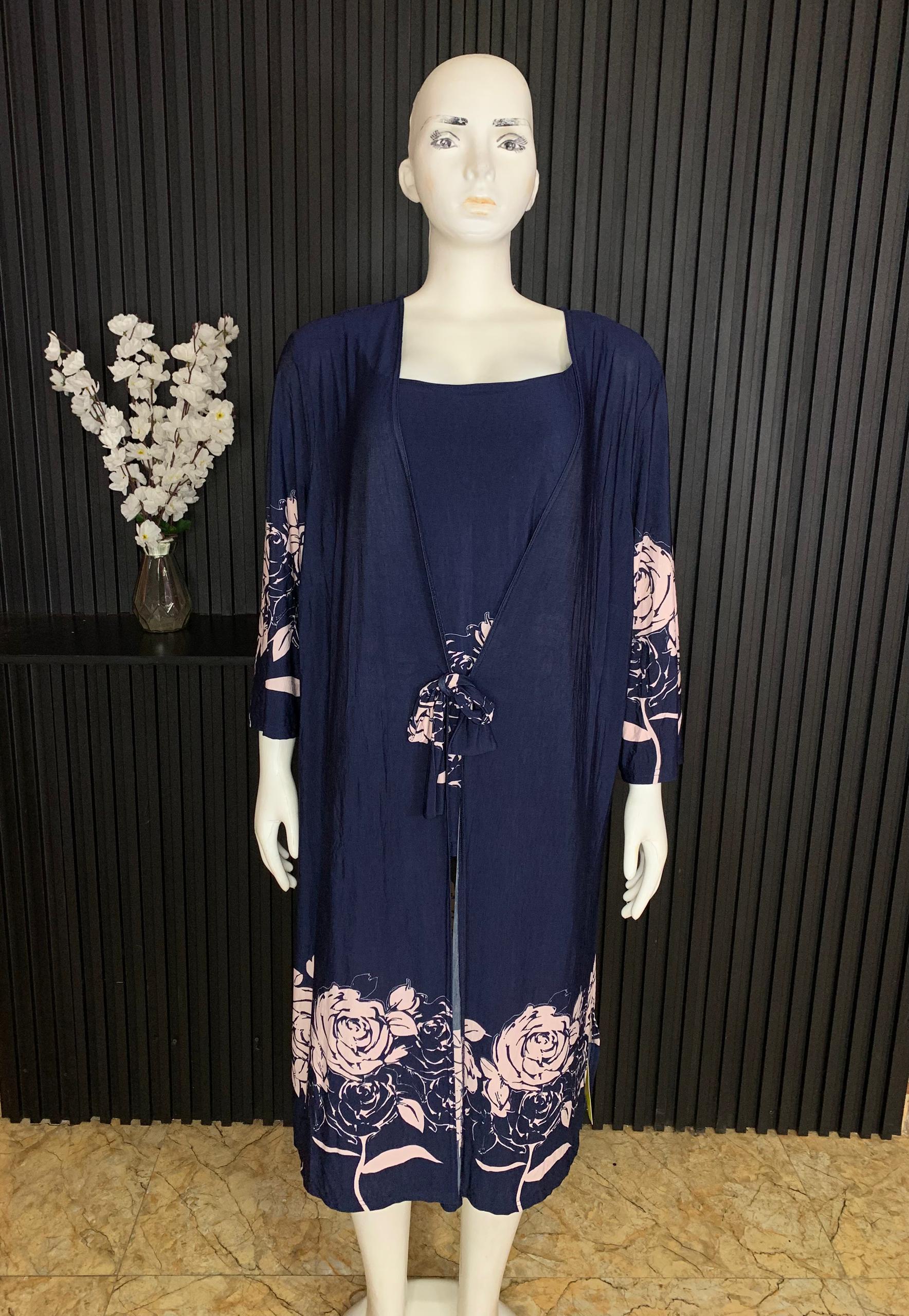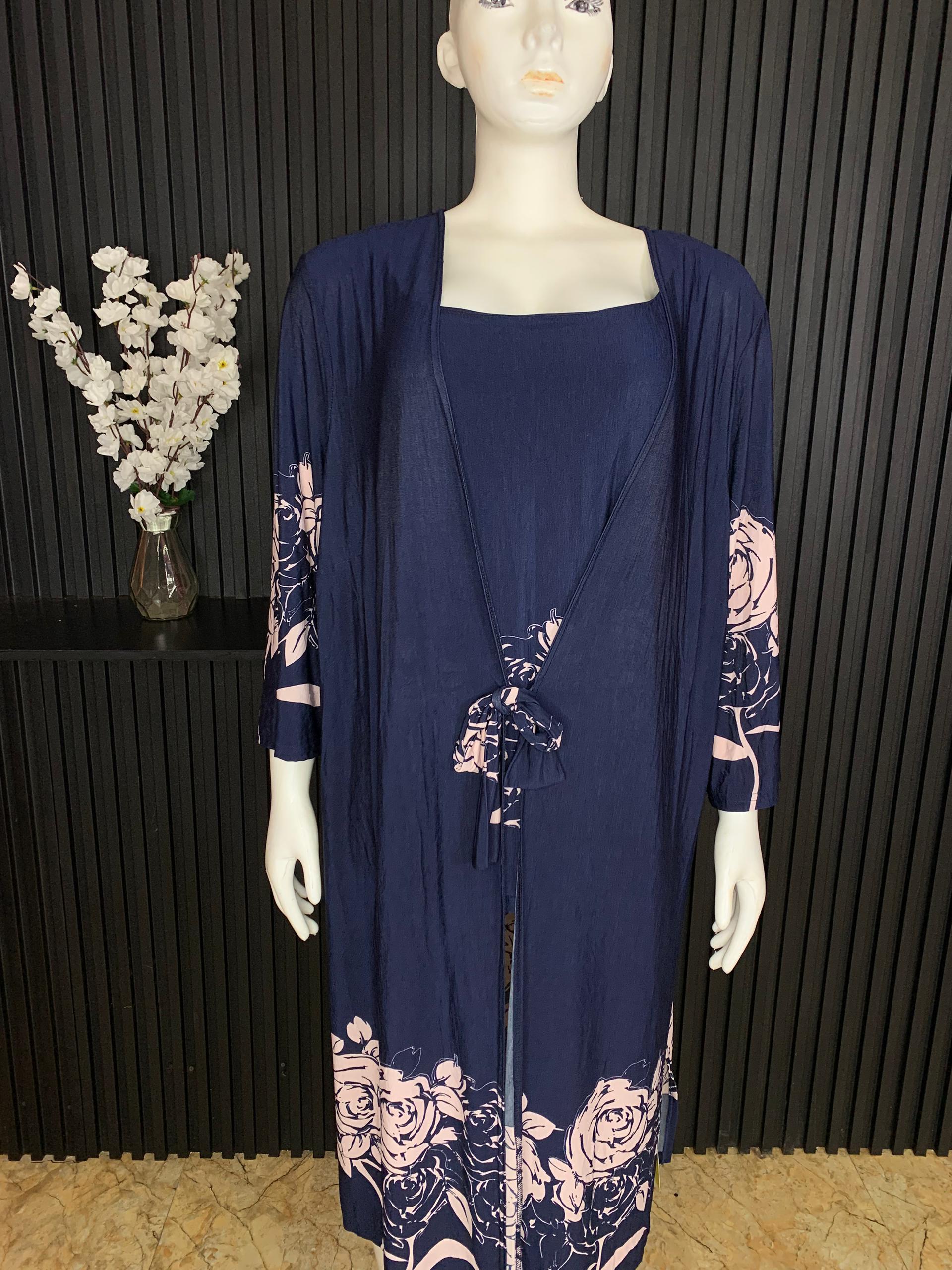 Step Into Effortless Elegance With This Stunning Navy Blue Floral Two-Piece Kimono Set Designed To Deliver Comfort, Style, And Versatility. This beautiful set includes a soft inner dress paired with a matching flowing kimono featuring a stylish tie-front detail. Crafted From Lightweight And Breathable Fabric, It Offers A Relaxed Fit Perfect For All-Day Wear. The floral print accents add a touch of sophistication, while the open-front kimono enhances movement and style. Ideal For Casual Outings, Lounging, Vacation Wear, Or Elegant Home Looks, This Two-Piece Set Is A Must-Have For A Chic And Comfortable Wardrobe.