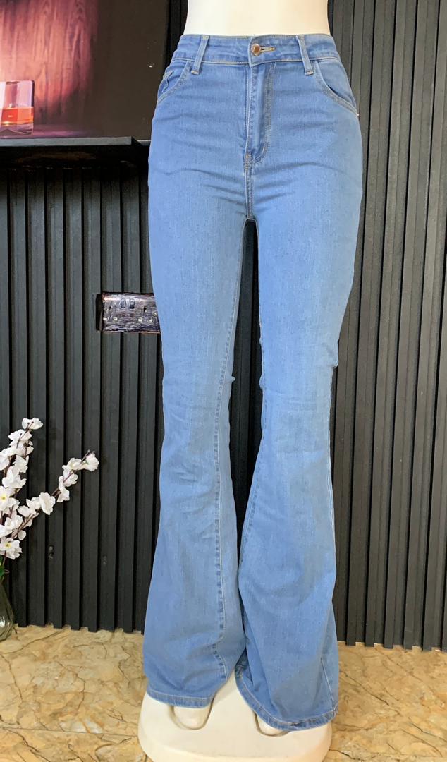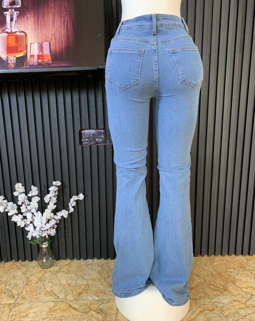 Experience A Classic Retro Silhouette With These High Waisted Blue Bell Bottom Flare Denim Jeans. These Trendy Trousers Feature A Flattering High Rise Waistband Designed To Cinch Your Waist And Elongate Your Legs. The Body Hugging Denim Transitions Into A Dramatic Flare At The Ankle, Providing A Timeless Vintage Aesthetic. Perfect For Both Casual And Dressy Occasions, These Jeans Offer A Versatile And Stylish Addition To Any Modern Wardrobe.